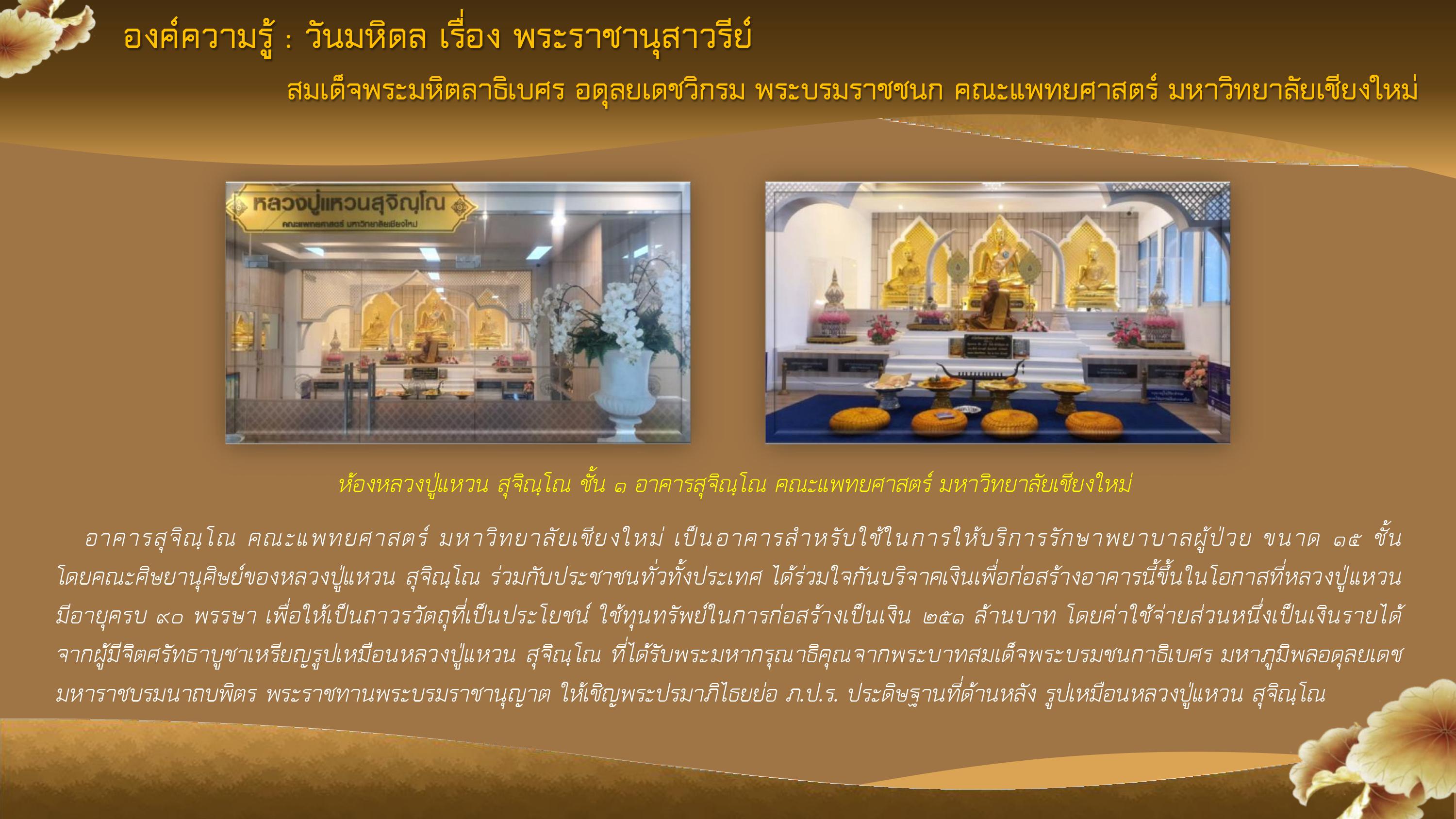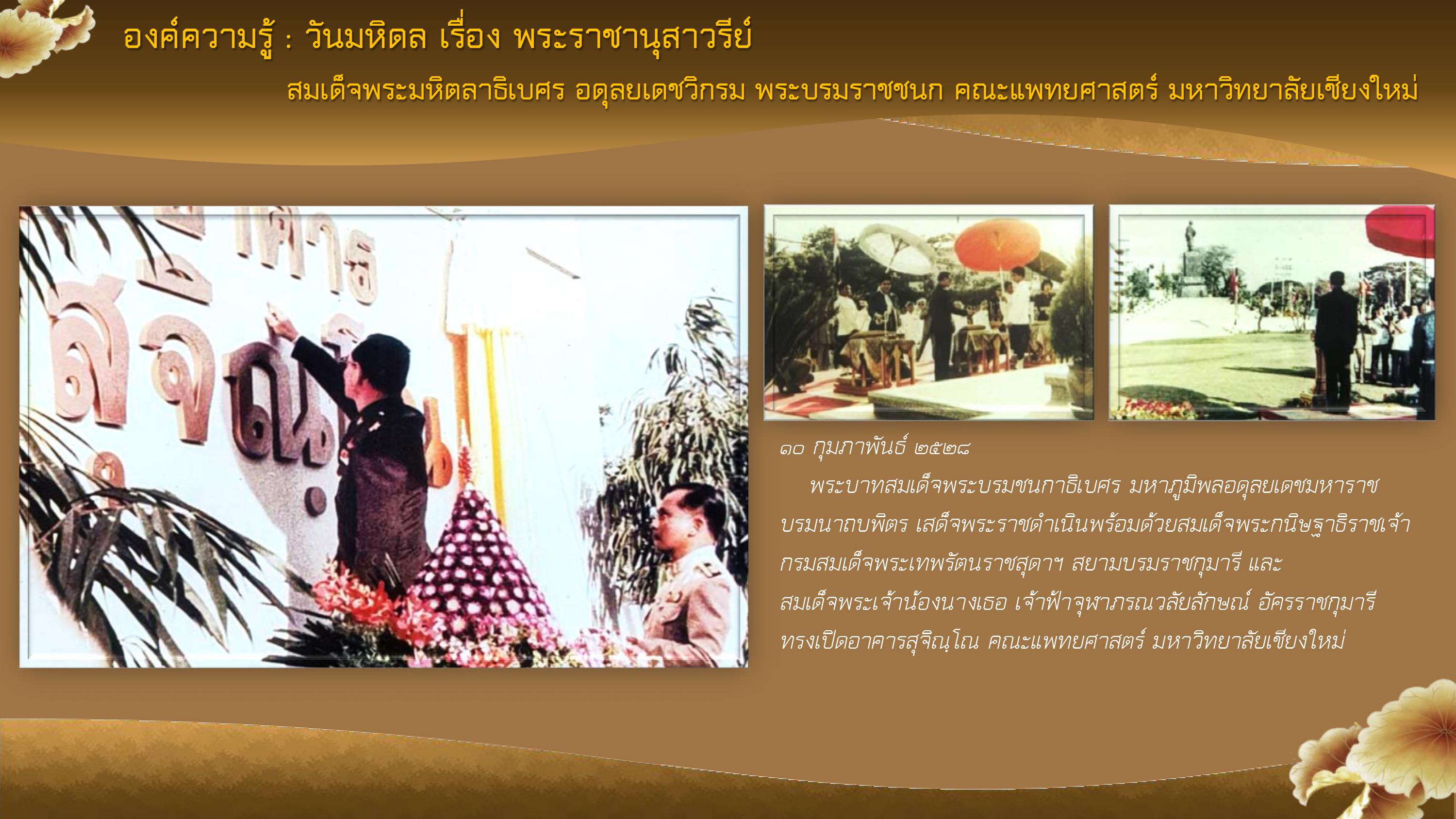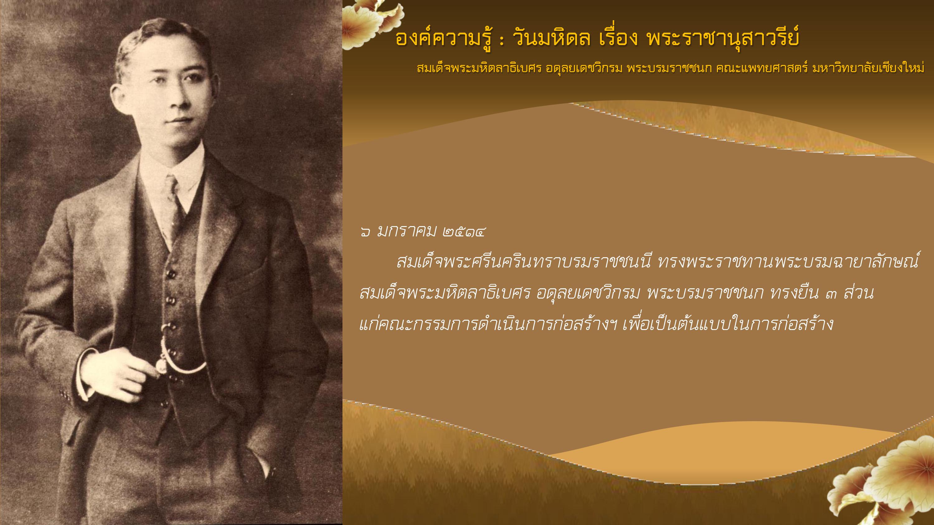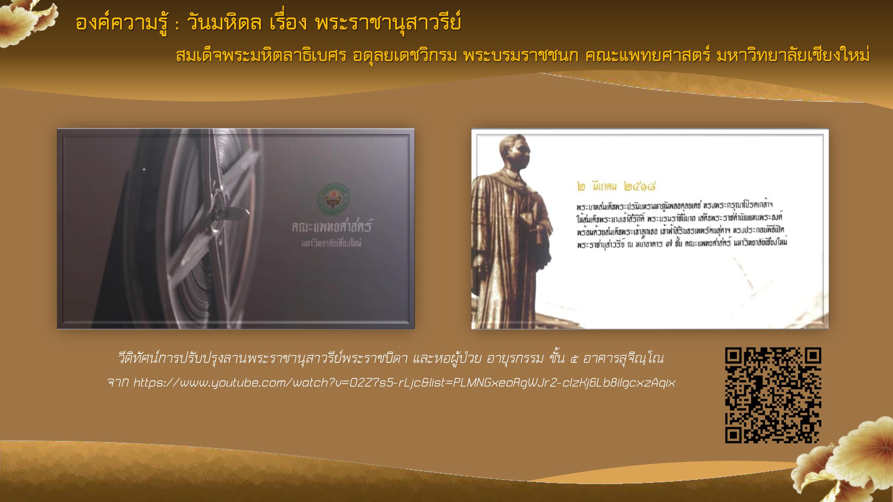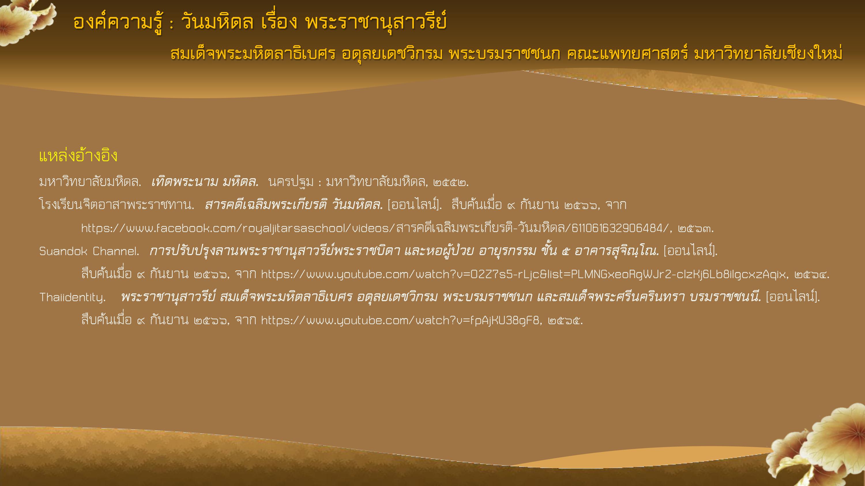 จาก https://www.facebook.com/royaljitarsaschool/videos/สารคดีเฉลิมพระเกียรติ-วันมหิดล/611061632906484/, ๒๕๖๓.