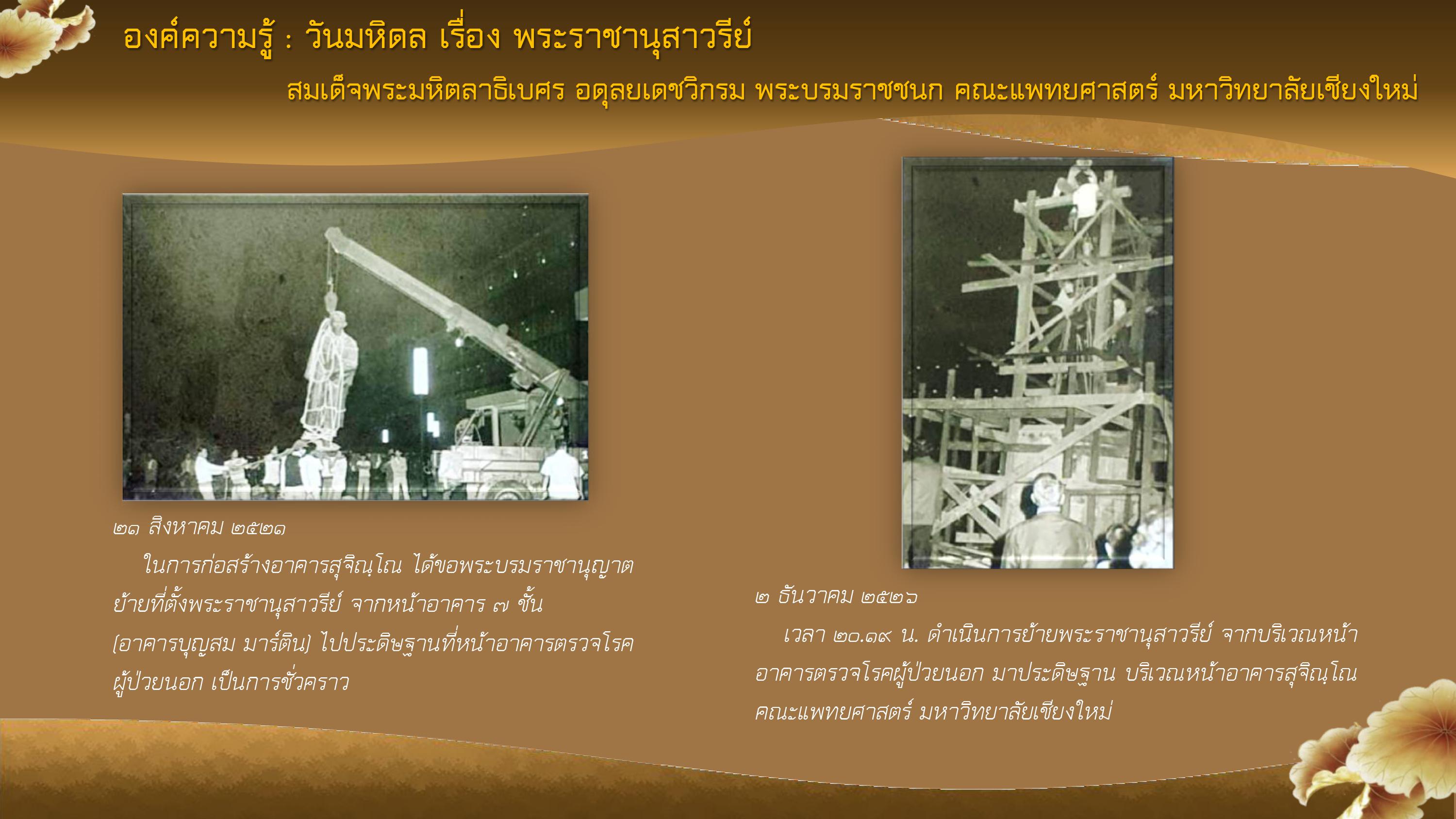 Thaiidentity. พระราชานุสาวรีย์ สมเด็จพระมหิตลาธิเบศร อดุลยเดชวิกรม พระบรมราชชนก และสมเด็จพระศรีนครินทรา บรมราชชนนี. [ออนไลน์]. สืบค้นเมื่อ ๙ กันยาน ๒๕๖๖,
