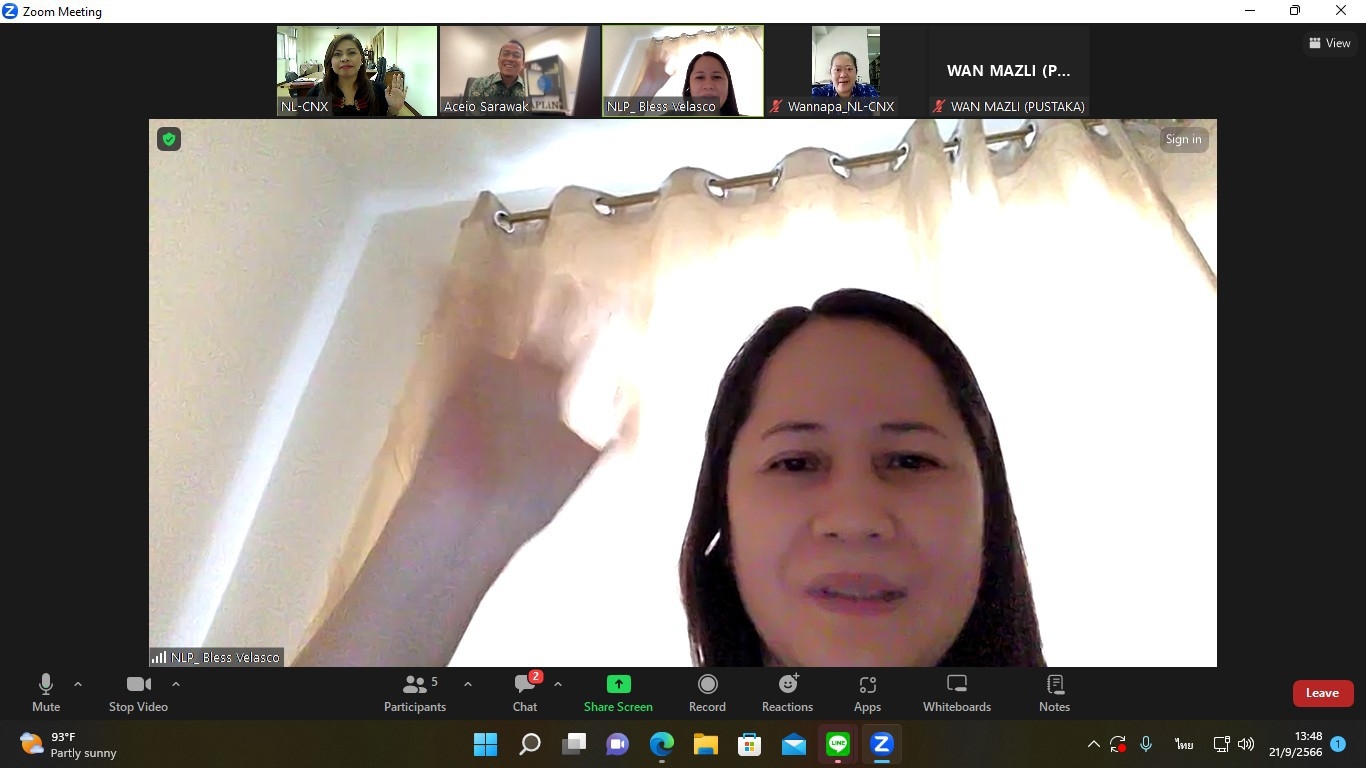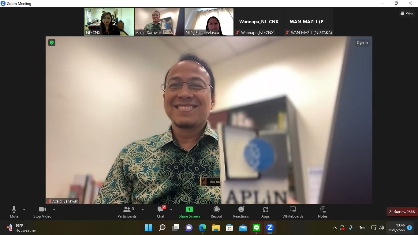 วันพฤหัสบดีที่ ๒๑ กันยายน พ.ศ. ๒๕๖๖ เวลา ๑๓.๐๐ - ๑๔.๐๐ น. นางสาวปุณณภา สุขสาคร ผู้อำนวยการหอสมุดแห่งชาติรัชมังคลาภิเษก เชียงใหม่ และนางวรรณภา ปะวิโน บรรณารักษ์ชำนาญการ เข้าร่วมประชุมหารือความร่วมมือด้านวิชาการร่วมกับเครือข่ายห้องสมุดประชาชนในอาเซียน ASEAN Public Libraries Information Network (APLiN) ผ่านระบบออนไลน์ Zoom meeting