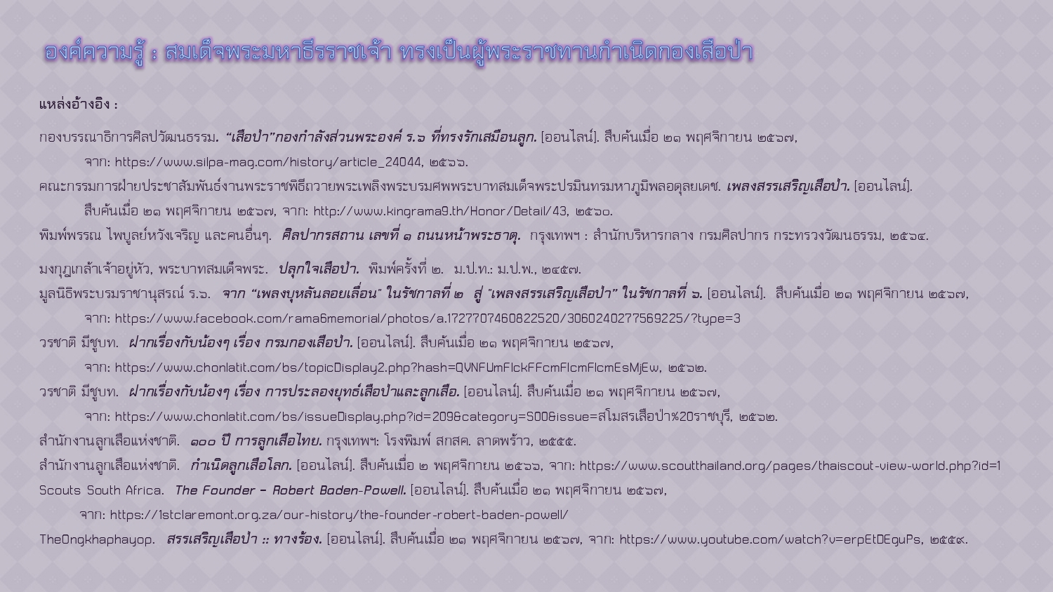 สำนักงานลูกเสือแห่งชาติ. กำเนิดลูกเสือโลก. [ออนไลน์]. สืบค้นเมื่อ ๒ พฤศจิกายน ๒๕๖๖, จาก: https://www.scoutthailand.org/pages/thaiscout-view-world.php?id=1