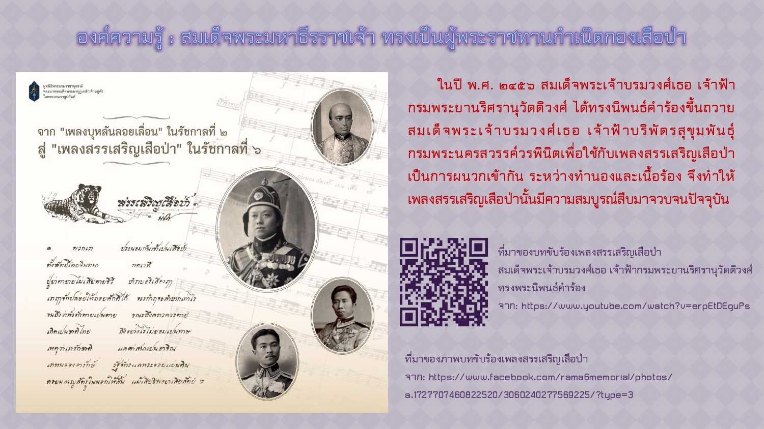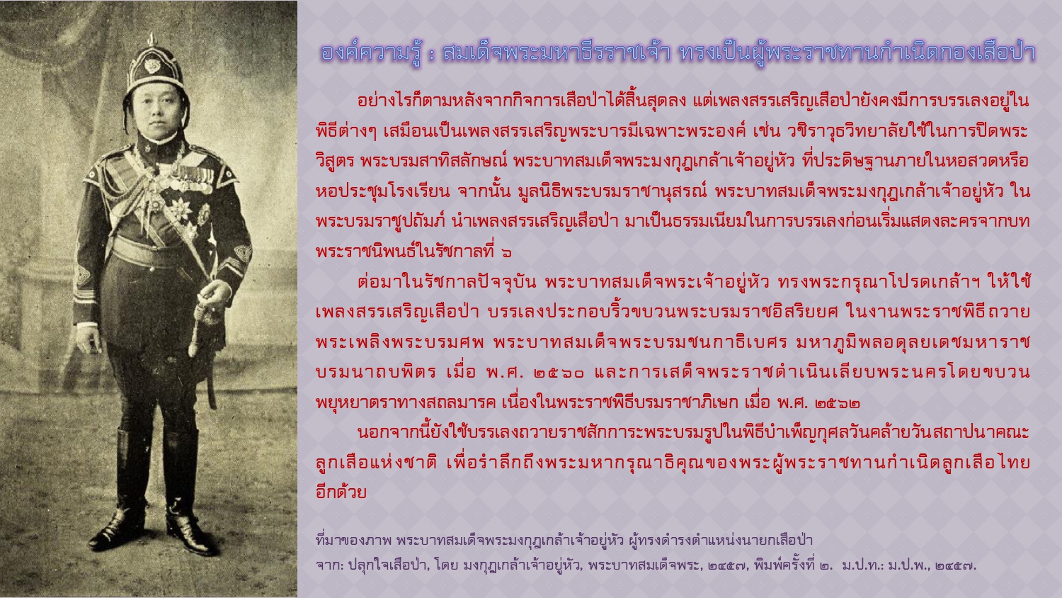มูลนิธิพระบรมราชานุสรณ์ ร.๖. จาก “เพลงบุหลันลอยเลื่อน" ในรัชกาลที่ ๒ สู่ "เพลงสรรเสริญเสือป่า” ในรัชกาลที่ ๖. [ออนไลน์]. สืบค้นเมื่อ ๒๑ พฤศจิกายน ๒๕๖๗,