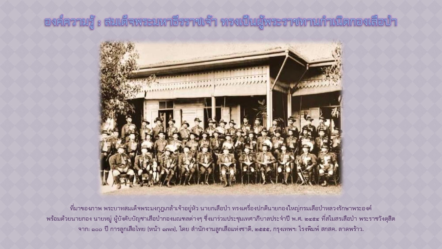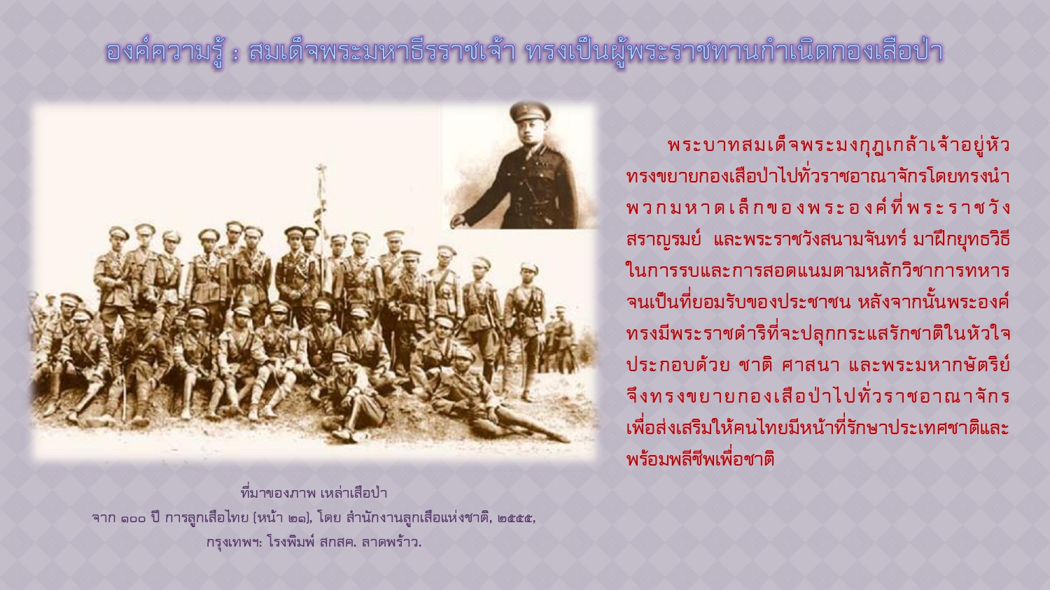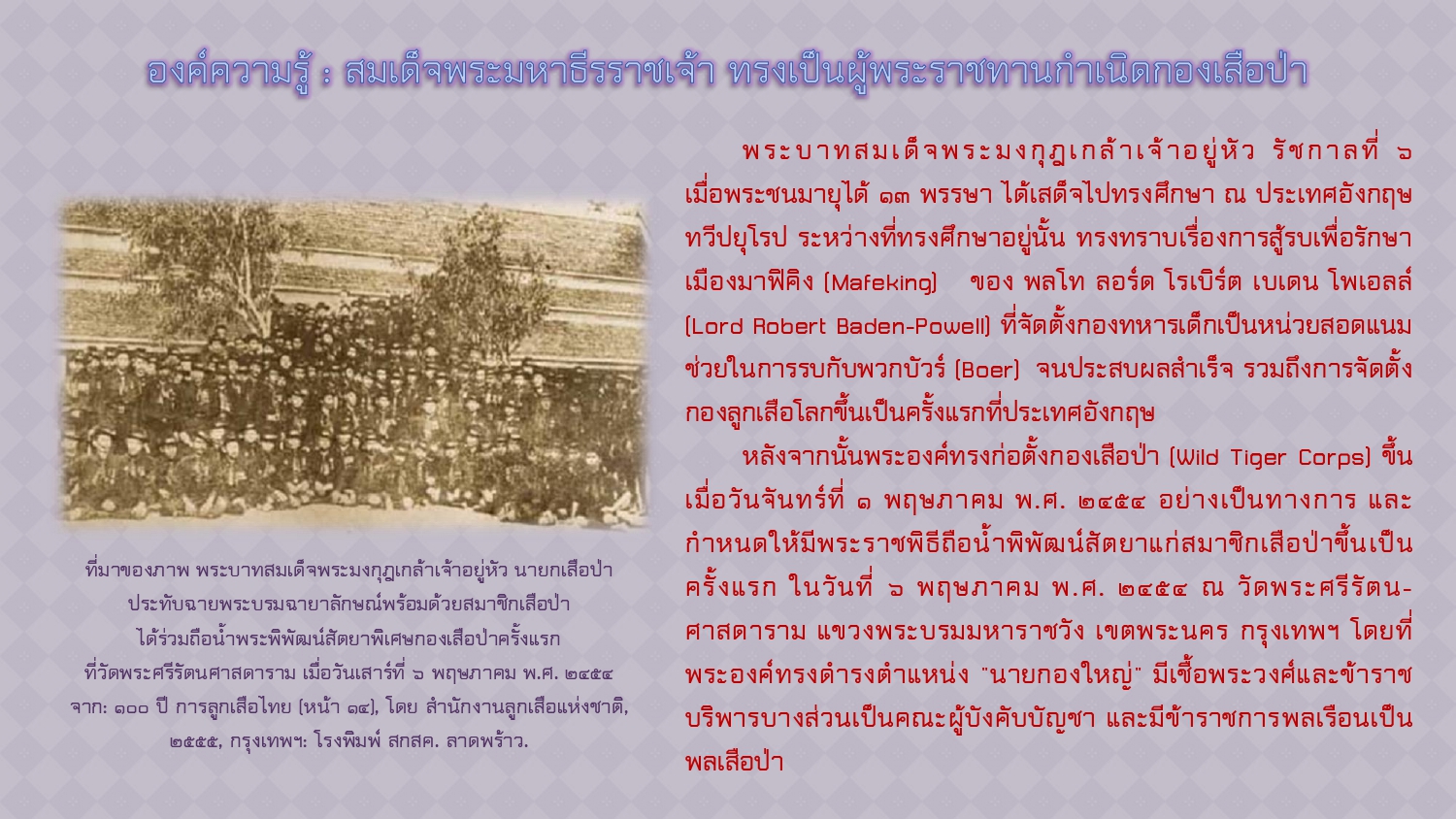 กองบรรณาธิการศิลปวัฒนธรรม. “เสือป่า”กองกำลังส่วนพระองค์ ร.๖ ที่ทรงรักเสมือนลูก. [ออนไลน์]. สืบค้นเมื่อ ๒๑ พฤศจิกายน ๒๕๖๗,