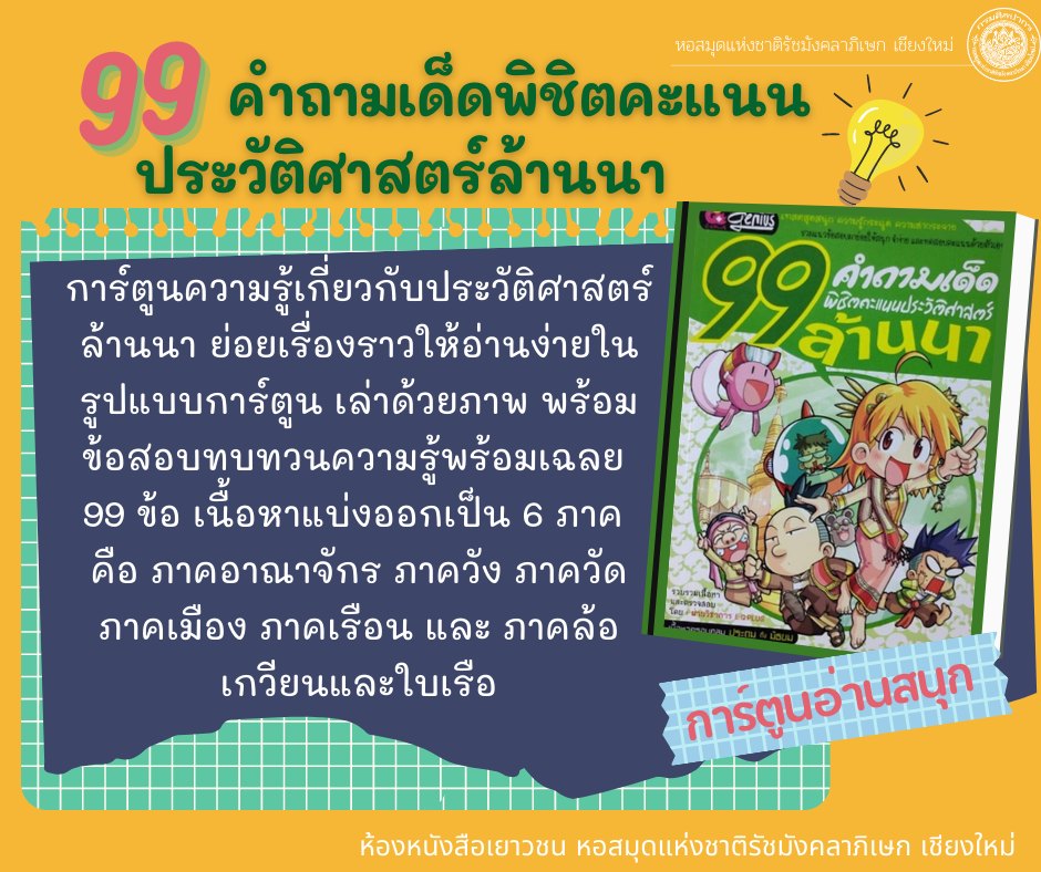 99 คำถามเด็ดพิชิตคะแนนประวัติศาสตร์ล้านนา ใครชอบประวัติศาสตร์ล้านนา ต้องอ่านเล่มนี้ สนุกกับการ์ตูนสั้นๆ และได้ความความรู้ กับเรื่องราวล้านนา 6 ภาค ได้แก่ ภาคอาณาจักร ภาควัง ภาควัด ภาคเมือง ภาคเรือน และภาคล้อเกวียนกับใบเรือ กับคำถาม 99 ข้อ พร้อมเฉลยท้ายเล่ม