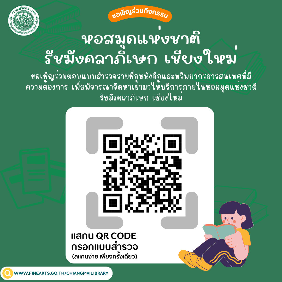 หอสมุดแห่งชาติรัชมังคลาภิเษก เชียงใหม่ ขอเชิญผู้ใช้บริการร่วมตอบแบบสำรวจความต้องการหนังสือและทรัพยากรสารสนเทศ เพื่อพิจารณาจัดหาเข้ามาไว้ให้บริการภายในหอสมุด ตาม URL ด้านล่างนี้