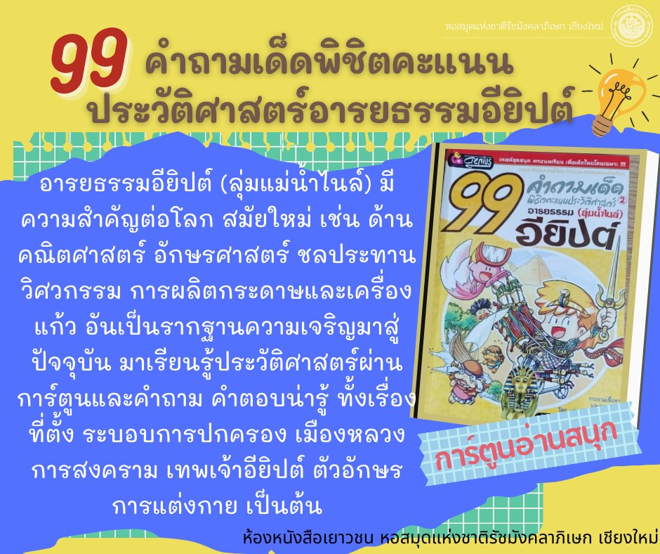 99 คำถามเด็ดพิชิตคะแนนประวัติศาสตร์อารยธรรมอียิปต์ (ลุ่มน้ำไนล์) การ์ตูนสนุกแทรกสาระความรู้ เล่าเรื่องด้วยภาพ พร้อมคำถามประวัติศาสตร์ 99 ข้อ เช่น