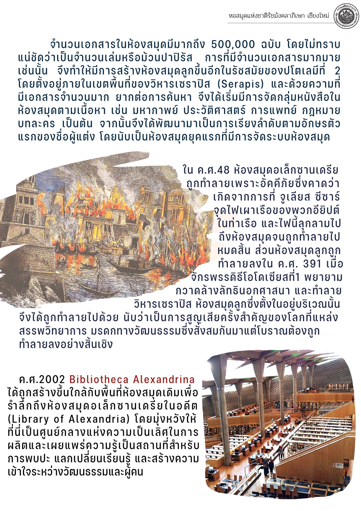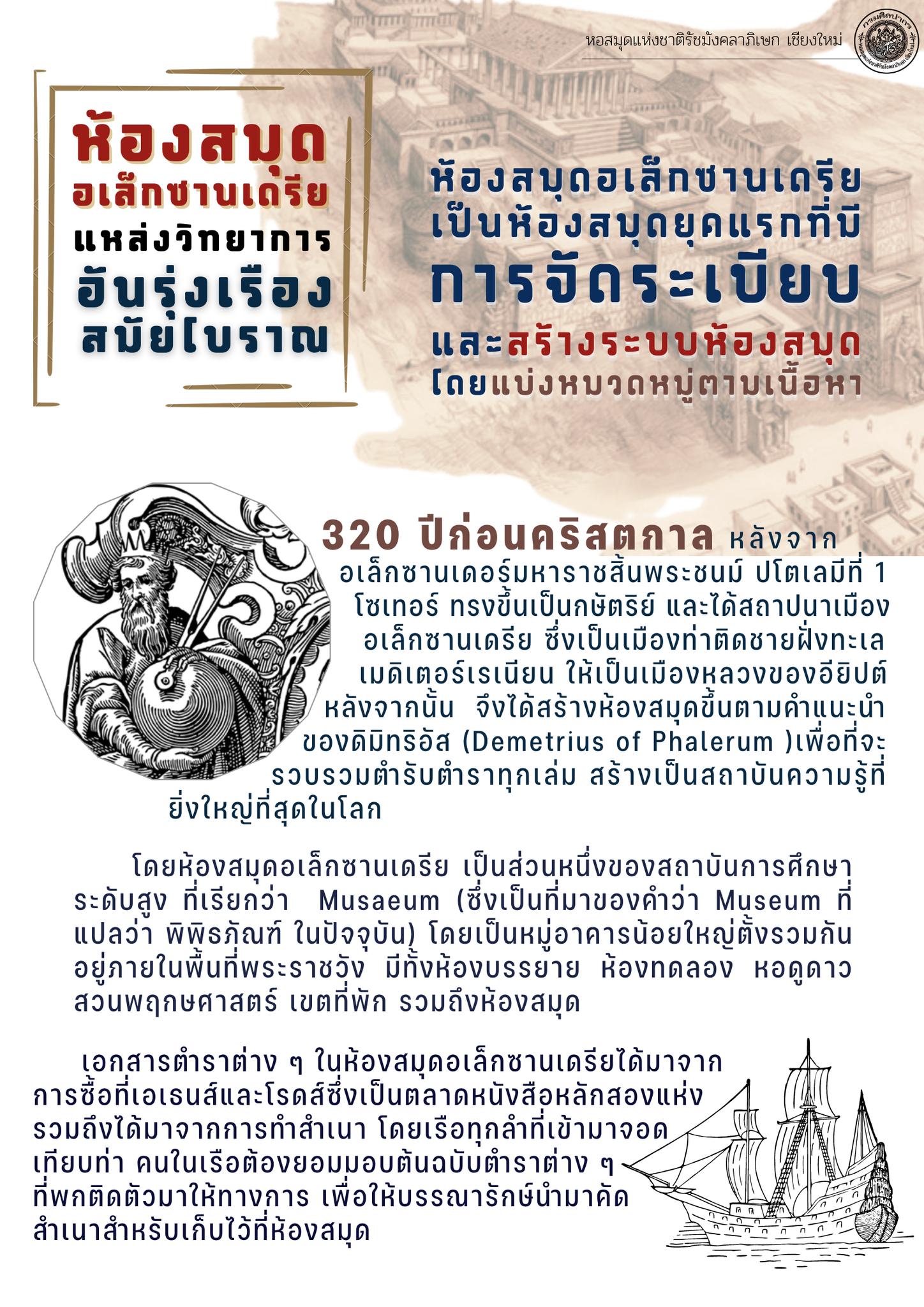 ยุวดี. ห้องสมุดแห่งอเล็กซานเดรีย แหล่งวิทยาการแห่งแรกของโลก. [ออนไลน์]. สืบค้นเมื่อ 10 มีนาคม 2565, จาก: https://teen.mthai.com/education/95758.html