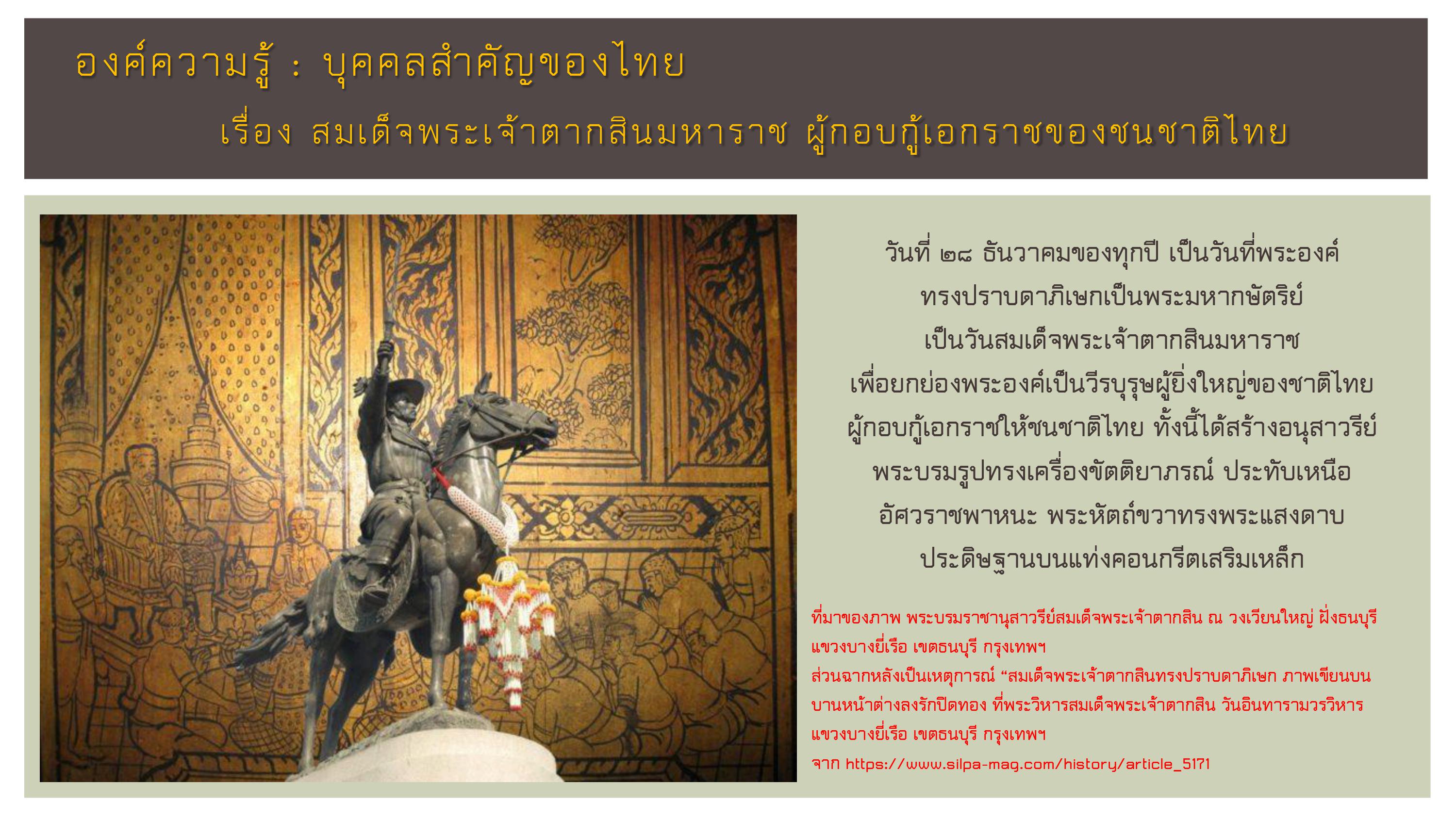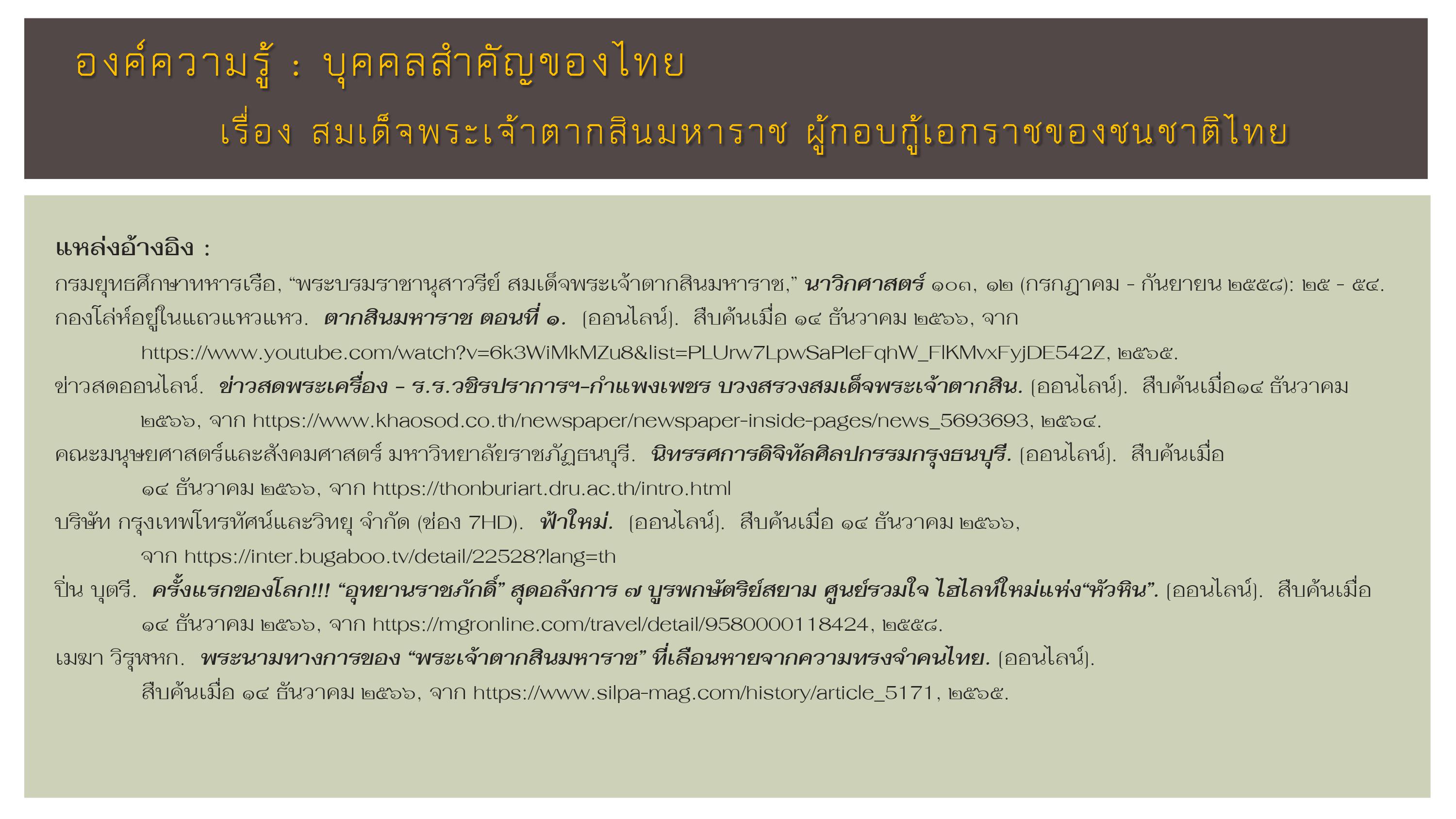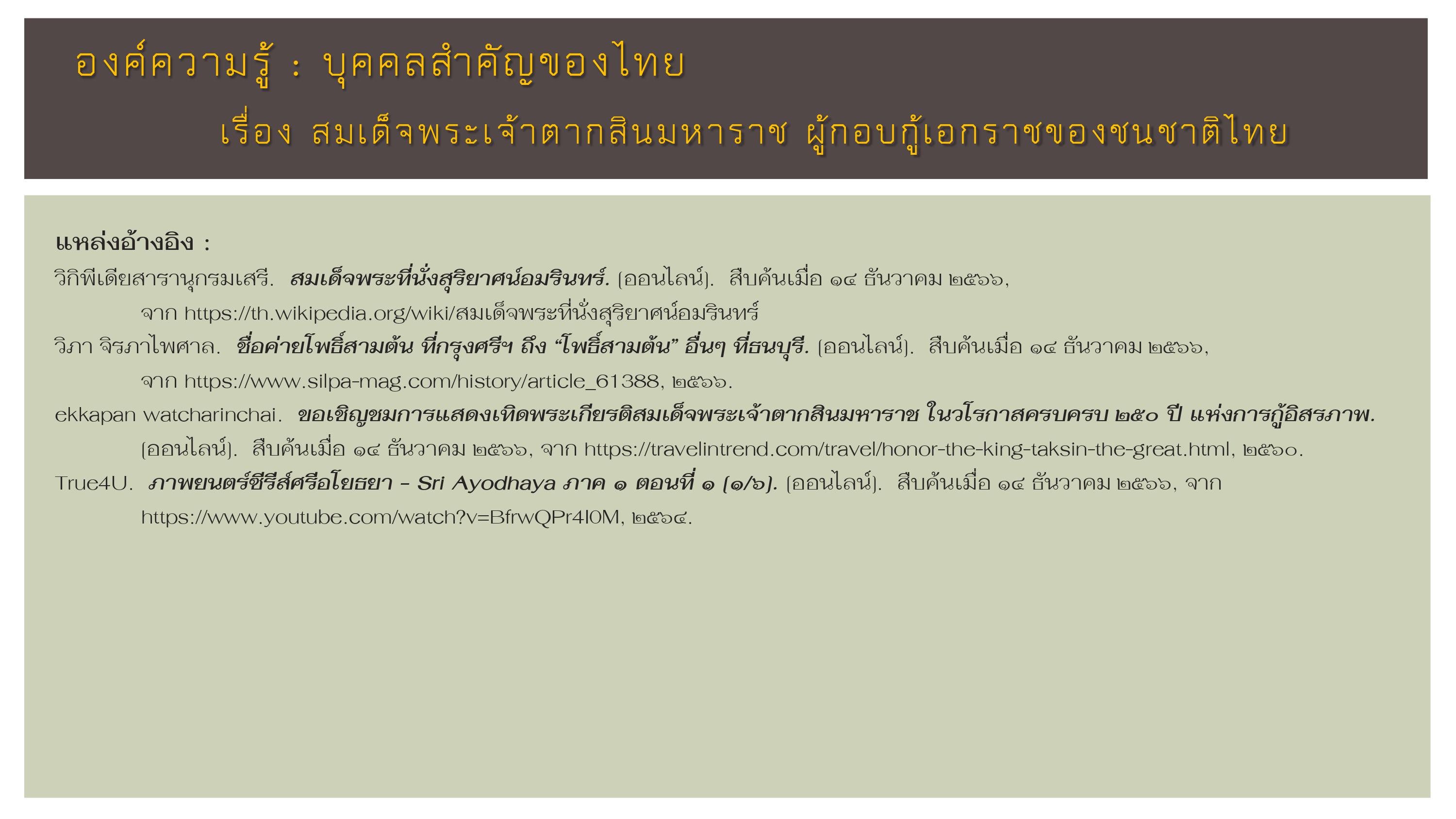 สืบค้นเมื่อ ๑๔ ธันวาคม ๒๕๖๖, จาก https://travelintrend.com/travel/honor-the-king-taksin-the-great.html, ๒๕๖๐.