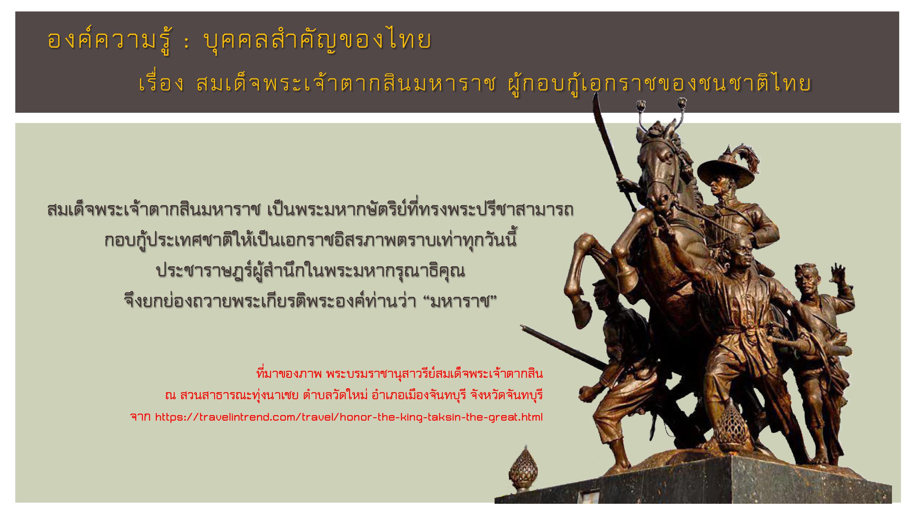 สมเด็จพระเจ้าตากสินมหาราช เป็นพระมหากษัตริย์ที่ทรงพระปรีชาสามารถกอบกู้ประเทศชาติให้เป็นเอกราชอิสรภาพตราบเท่าทุกวันนี้ ประชาราษฎร์ผู้สำนึกในพระมหากรุณาธิคุณ จึงยกย่องถวายพระเกียรติพระองค์ท่านว่า “มหาราช”