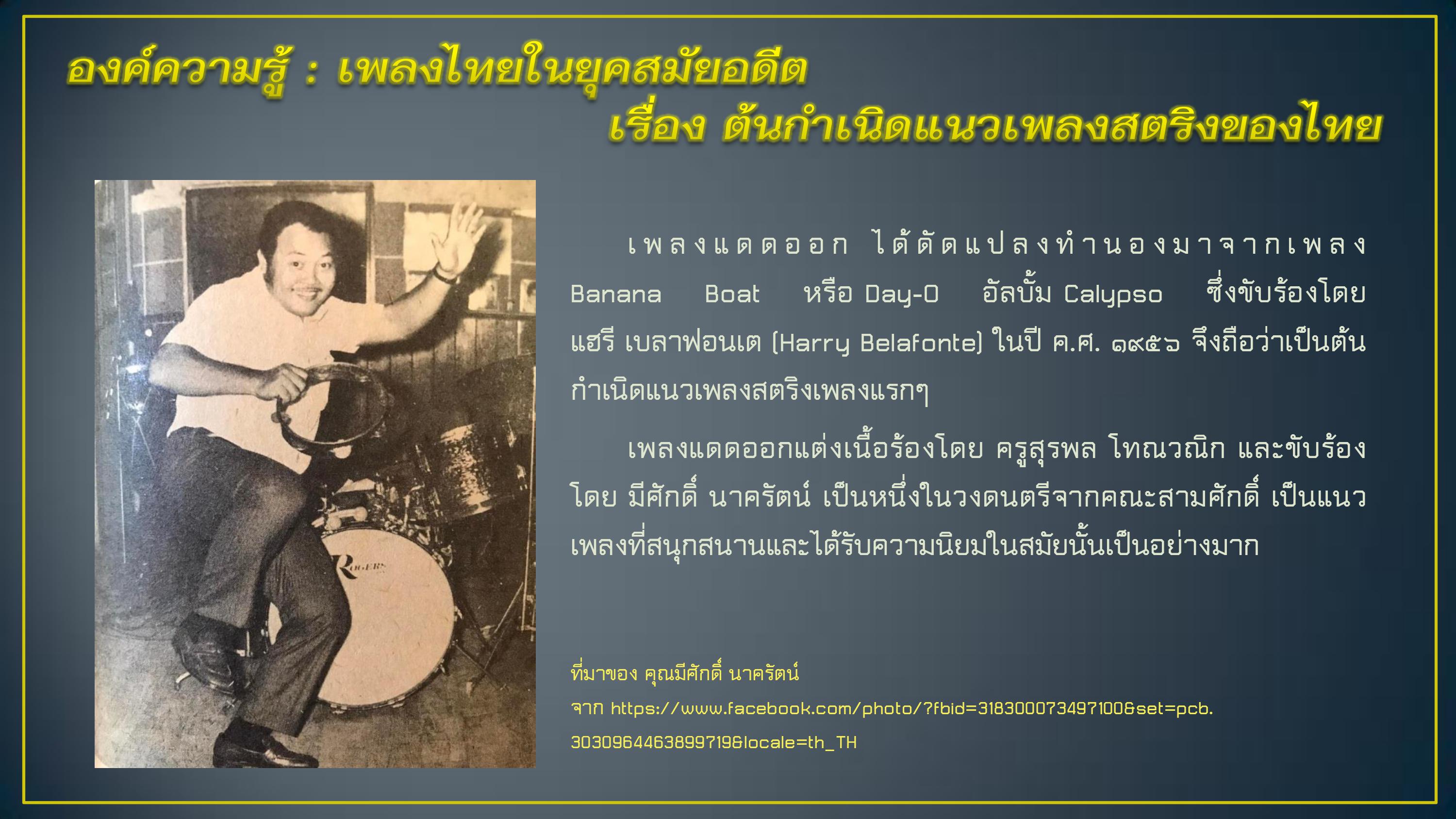 เพลงครูสุรพล โทณะวณิก. แดดออก - มีศักดิ์ นาครัตน์. [ออนไลน์]. สืบค้นเมื่อ ๑๐ กุมภาพันธ์ ๒๕๖๗, จาก https://www.youtube.com/watch?v=pA00x98Ls_Y , ๒๕๖๒.