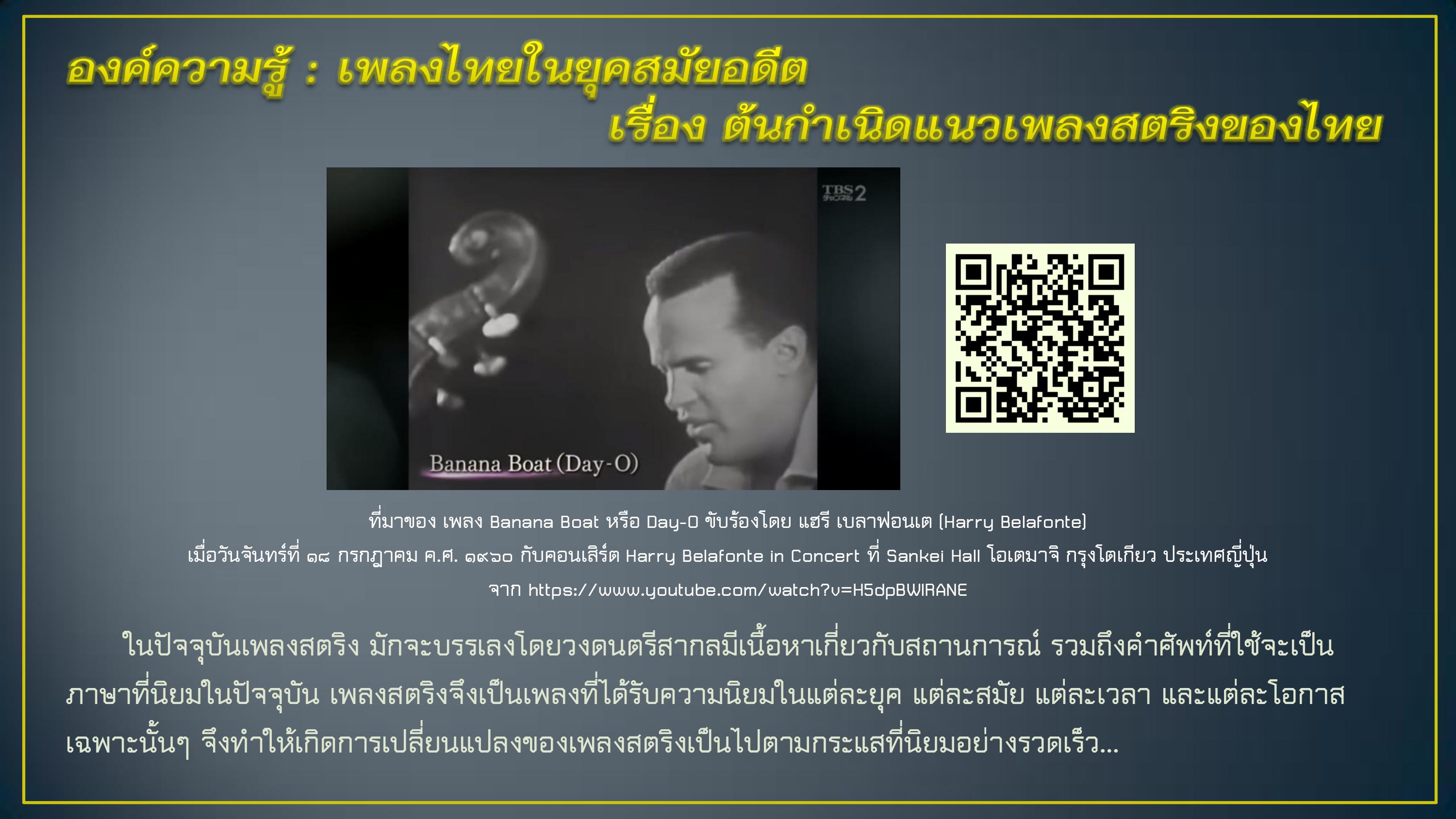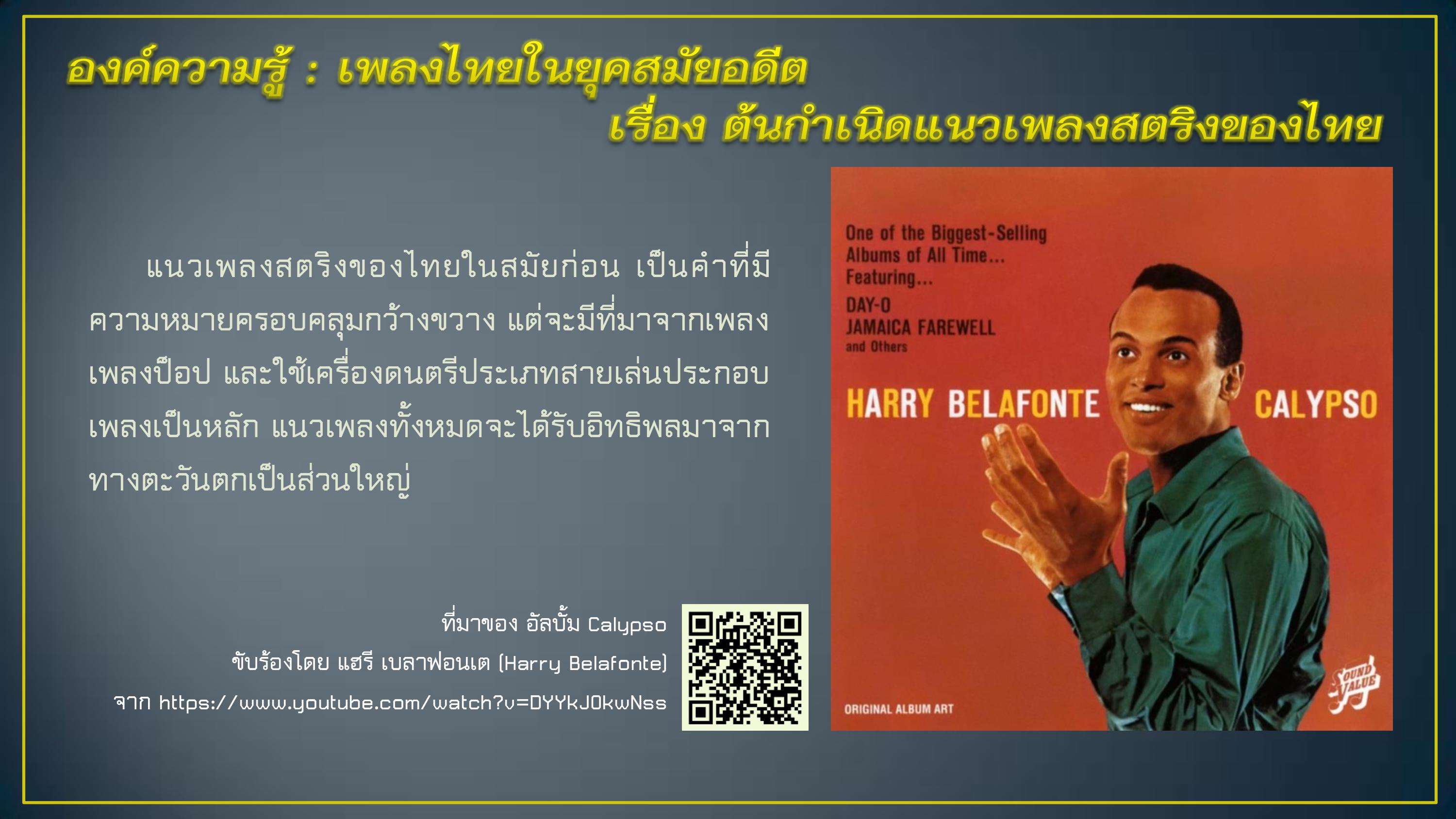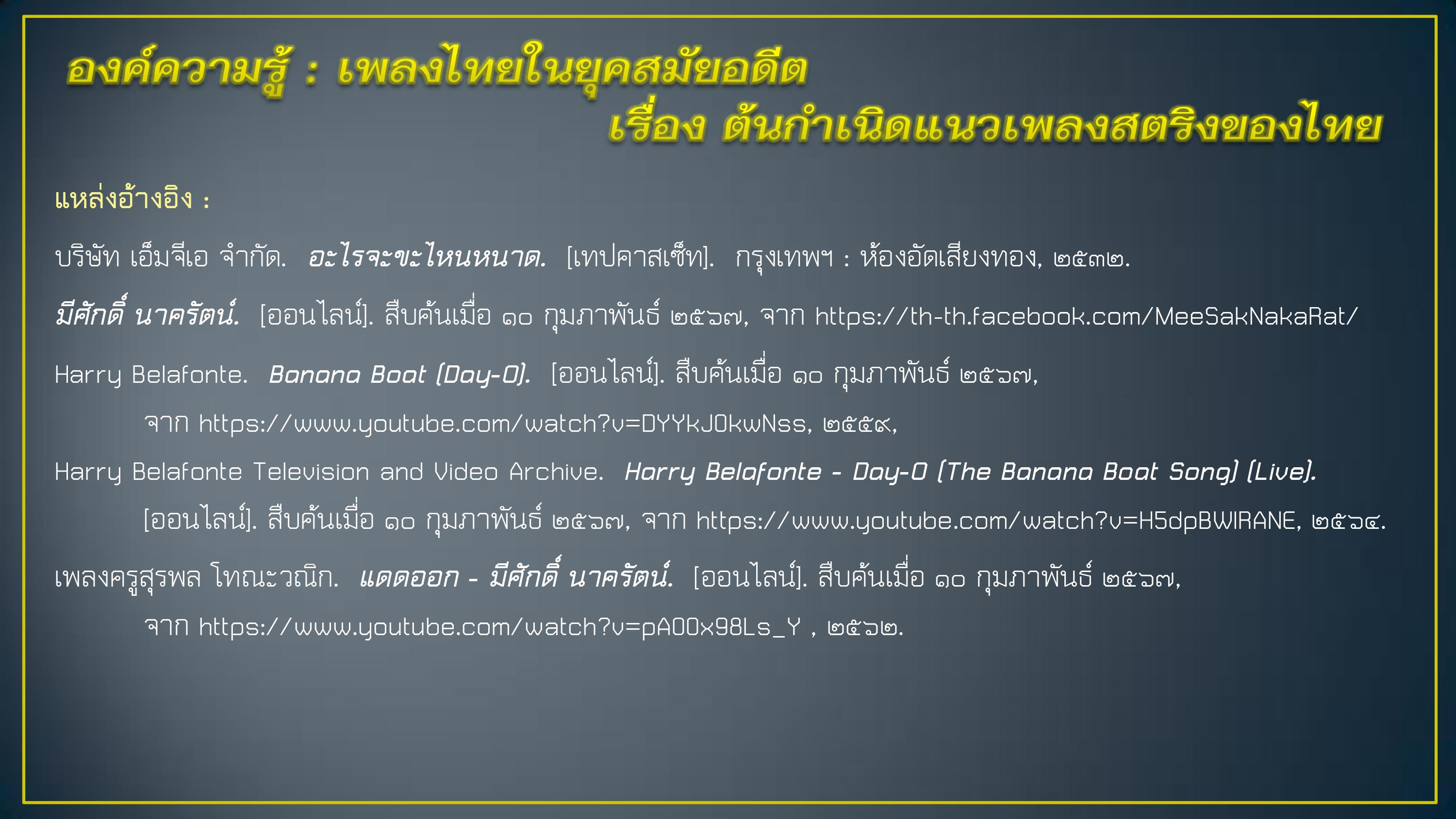 Harry Belafonte. Banana Boat (Day-O). [ออนไลน์]. สืบค้นเมื่อ ๑๐ กุมภาพันธ์ ๒๕๖๗, จาก https://www.youtube.com/watch?v=DYYkJ0kwNss, ๒๕๕๙,