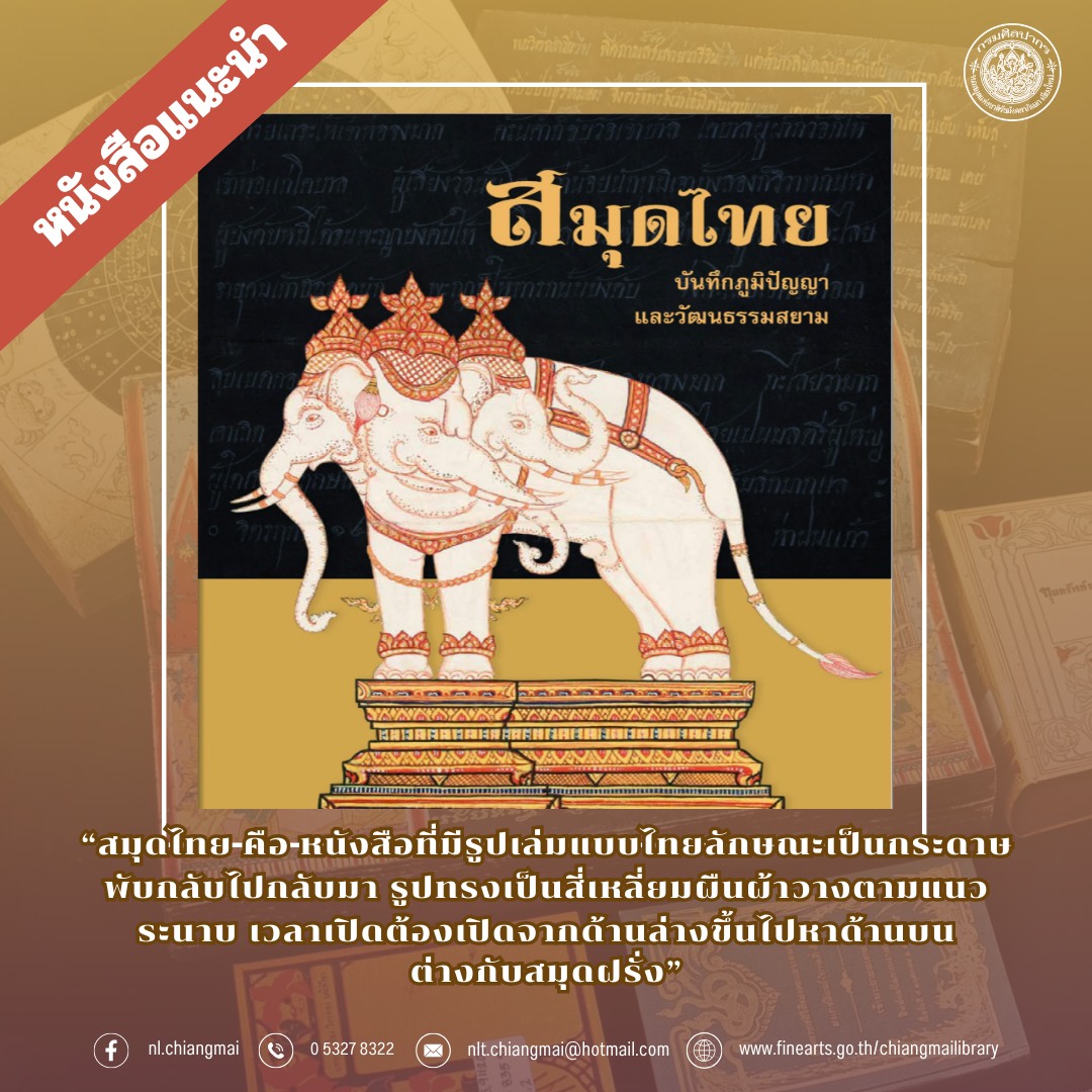 สมุดไทย : บันทึกภูมิปัญญาและวัฒนธรรมสยาม จัดพิมพ์โดยกรมส่งเสริมศิลปวัฒนธรรม ภายในเล่มรวบรวมข้อมูลความเป็นมา ชนิดและขนาดของสมุดไทย การบันทึกสมุดไทย การทำสมุดไทย สมุดภาพจิตรกรรมไทย เช่น สมุดภาพไตรภูมิ สมุดมาลัย ชาดกและพุทธประวัติ ตำราองค์ความรู้ภูมิปัญญาไทย เช่น ตำราช้างหรือตำราคชลักษณ์ ตำราม้าหรือตำราอัศวลักษณ์ ตำราแมว ตำราเทวรูป ตลอดจนภาพแสดงวัฒนธรรมด้านอื่นๆ