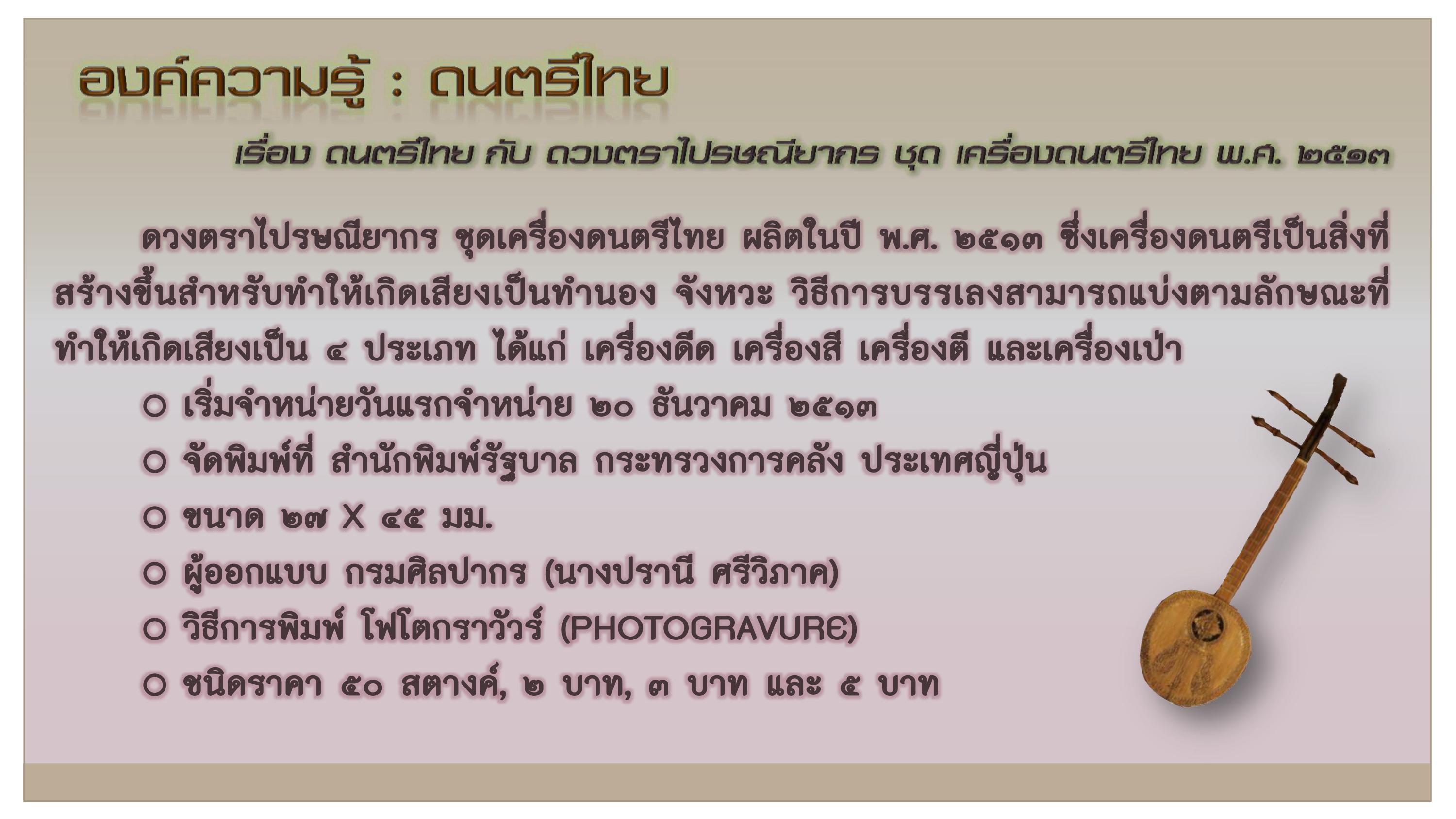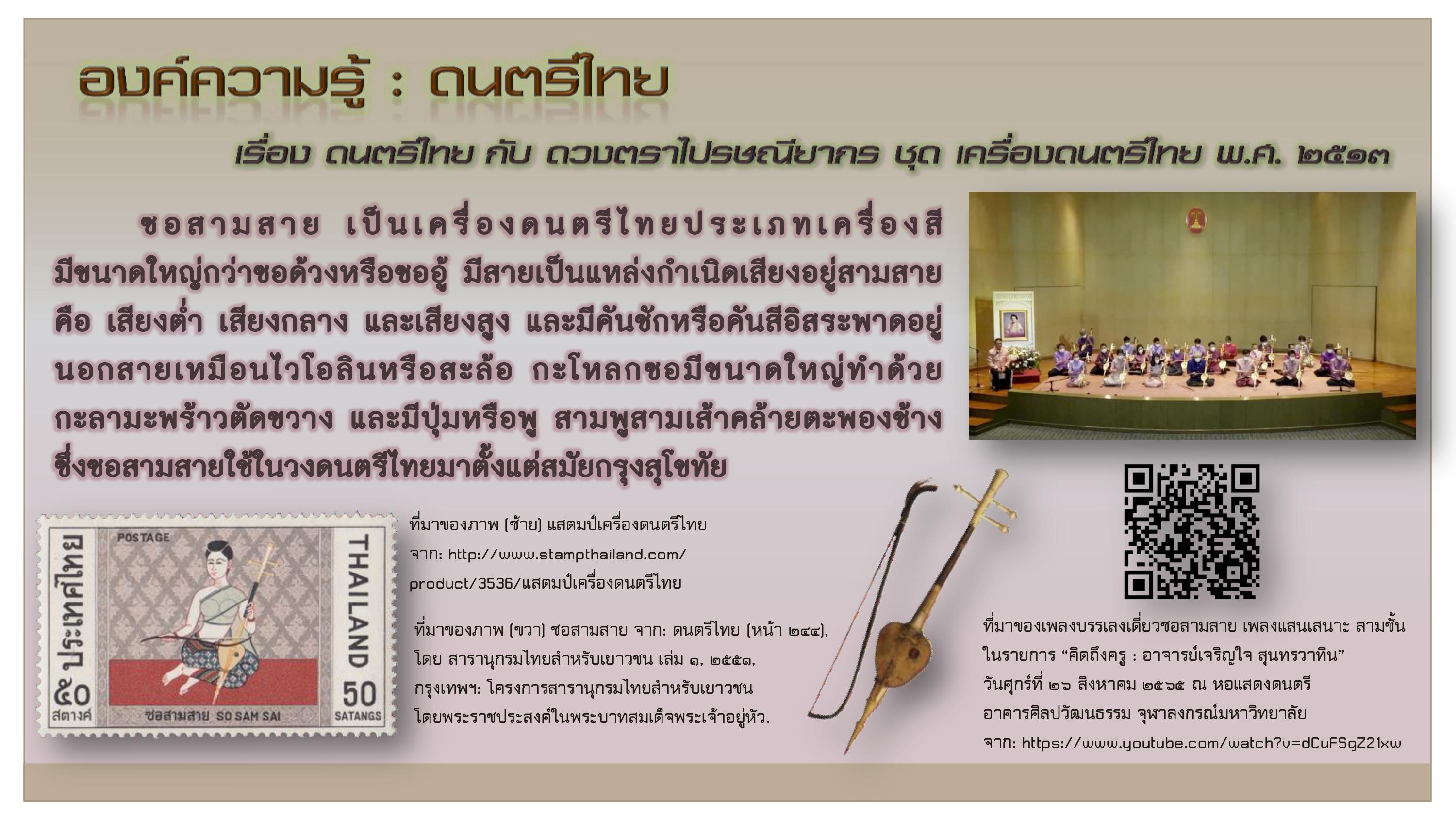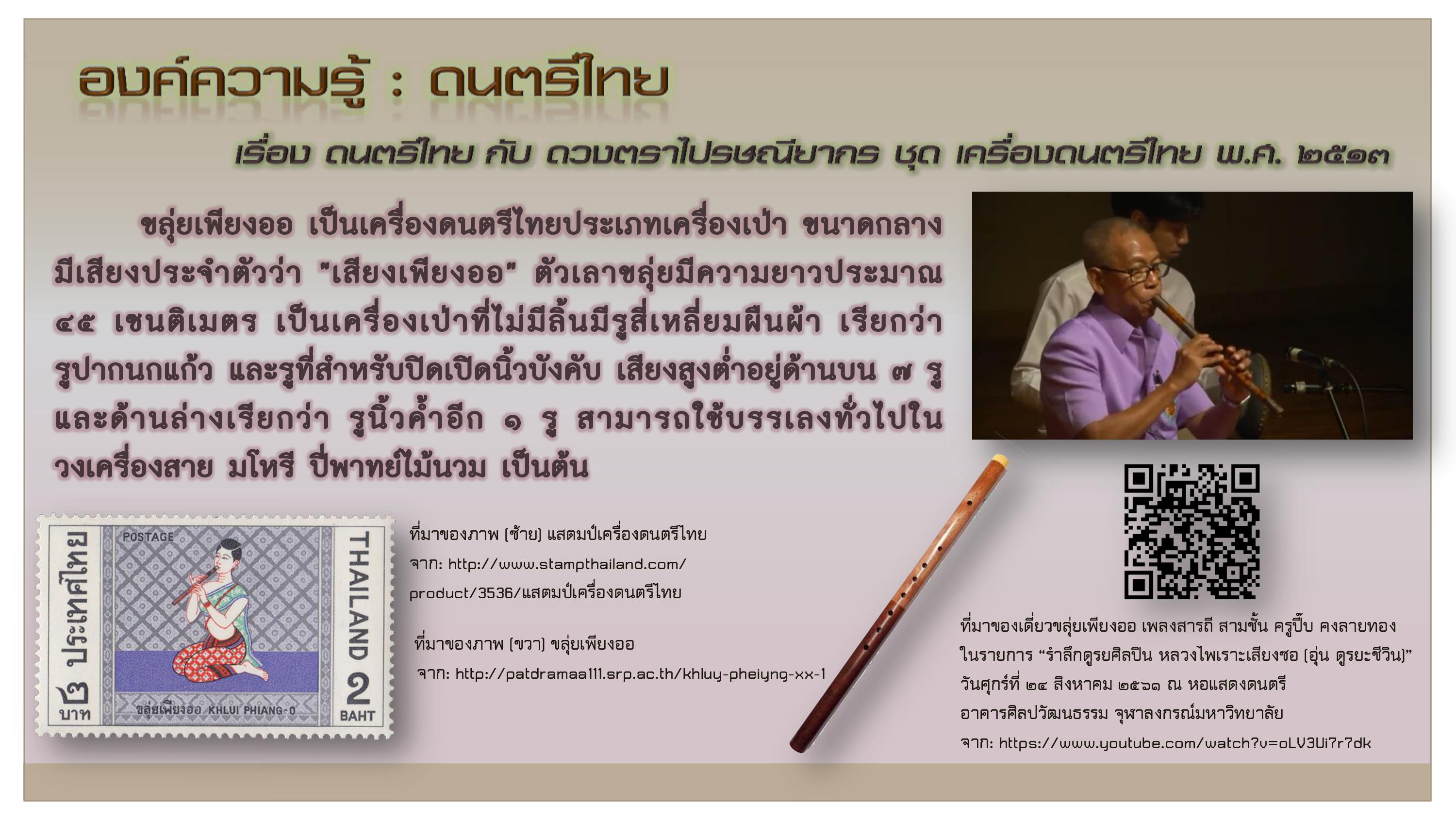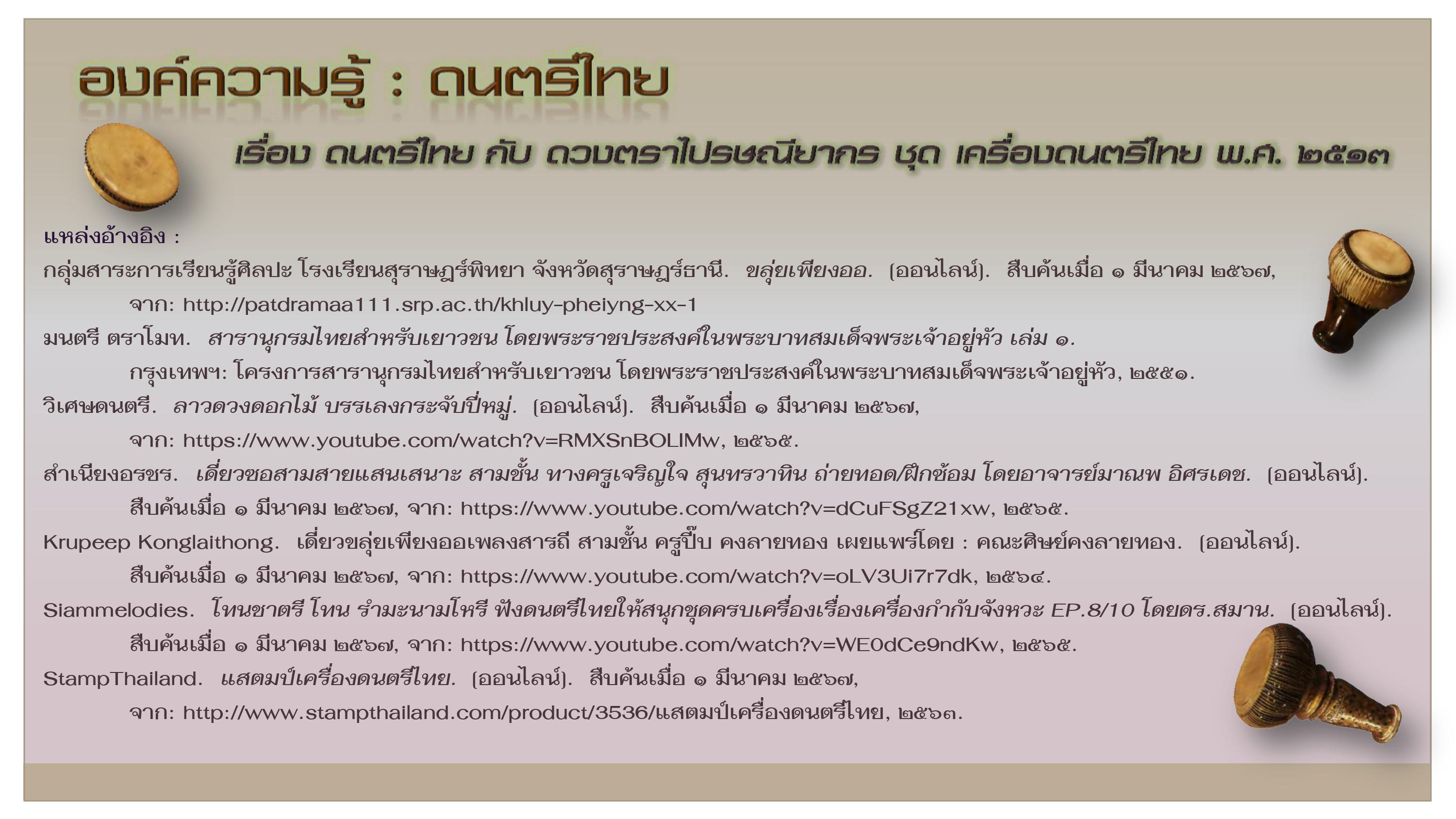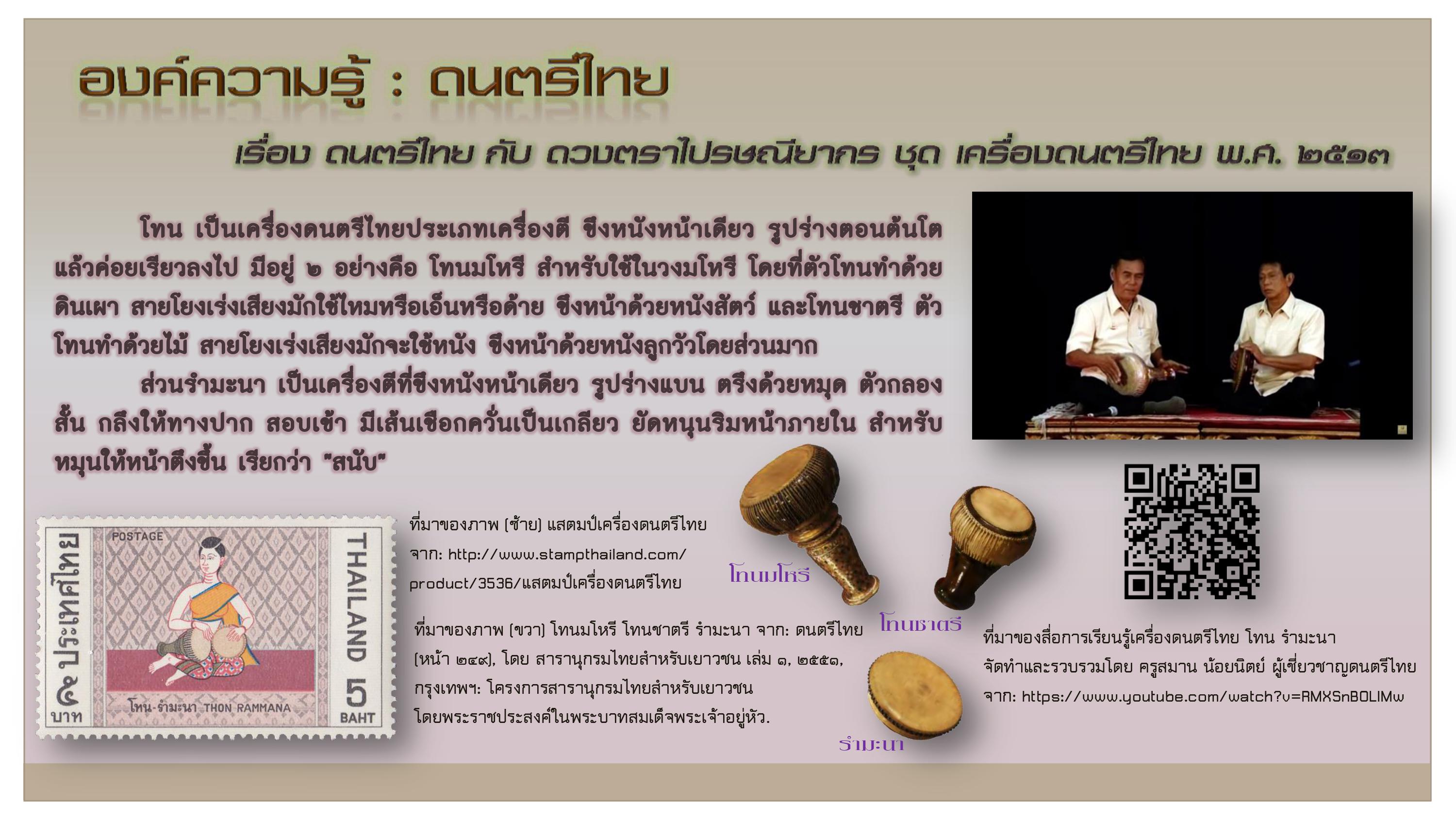 StampThailand. แสตมป์เครื่องดนตรีไทย. [ออนไลน์]. สืบค้นเมื่อ ๑ มีนาคม ๒๕๖๗, จาก: http://www.stampthailand.com/product/3536/แสตมป์เครื่องดนตรีไทย, ๒๕๖๓.