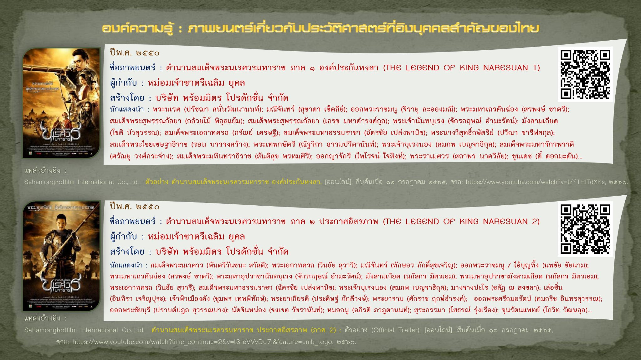 Sahamongkolfilm International Co.,Ltd. ตำนานสมเด็จพระนเรศวรมหาราช ประกาศอิสรภาพ (ภาค 2) : ตัวอย่าง (Official Trailer). [ออนไลน์]. สืบค้นเมื่อ ๑๖ กรกฎาคม ๒๕๖๕, จาก: https://www.youtube.com/watch?time_continue=2..., ๒๕๖๐.