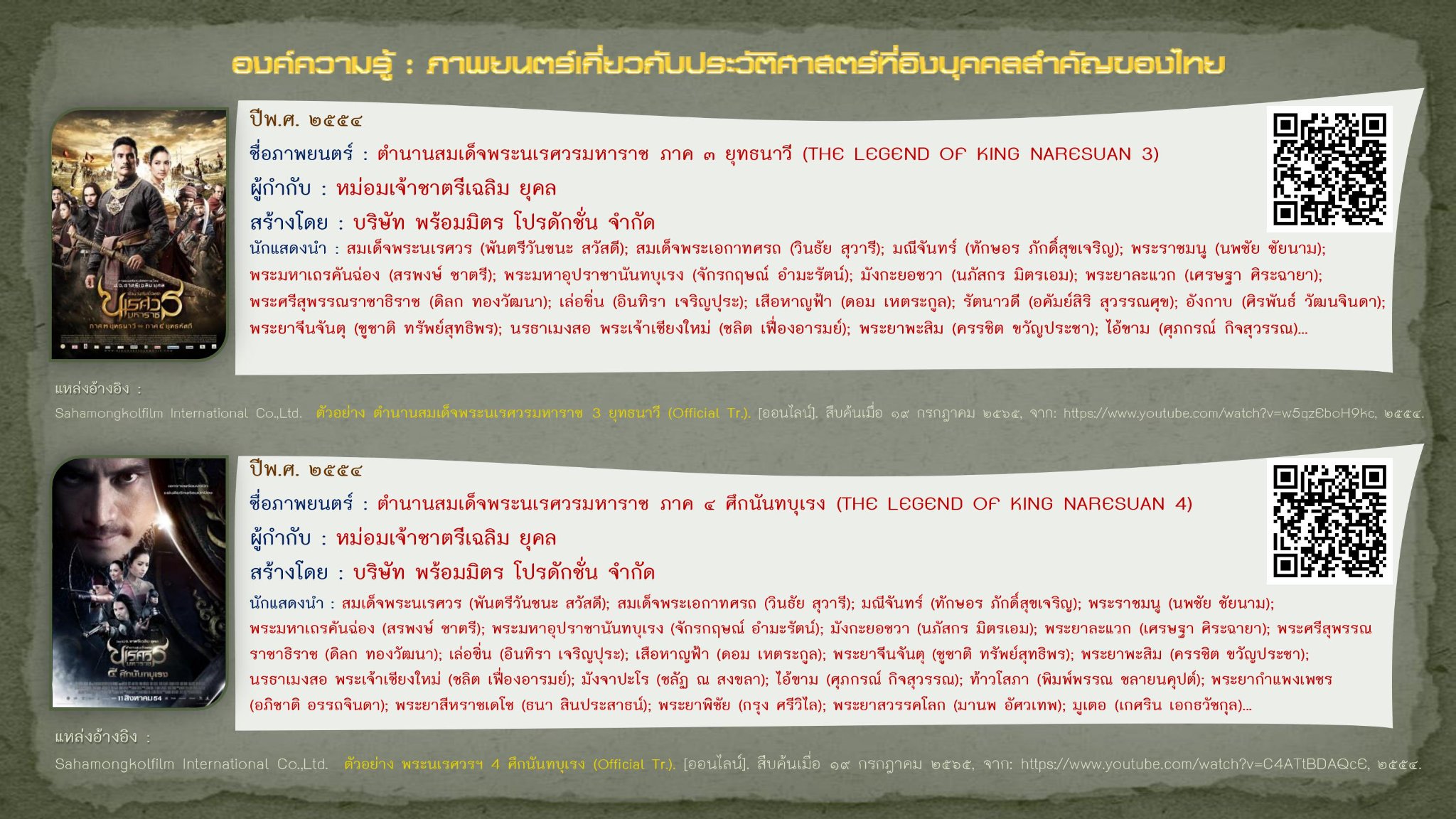 Sahamongkolfilm International Co.,Ltd. ตัวอย่าง ตำนานสมเด็จพระนเรศวรมหาราช 3 ยุทธนาวี (Official Tr.). [ออนไลน์]. สืบค้นเมื่อ ๑๙ กรกฎาคม ๒๕๖๕, จาก: https://www.youtube.com/watch?v=w5qzEboH9kc, ๒๕๕๔.