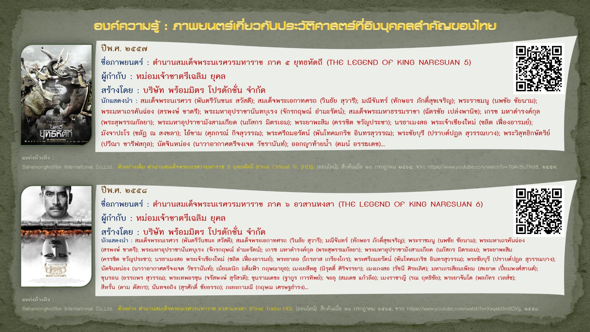 Sahamongkolfilm International Co.,Ltd. ตัวอย่าง ตำนานสมเด็จพระนเรศวรมหาราช อวสานหงสา (Final Trailer-HD). [ออนไลน์]. สืบค้นเมื่อ ๒๑ กรกฎาคม ๒๕๖๕, จาก: https://www.youtube.com/watch?v=XsqabGmSDVg, ๒๕๕๘.
