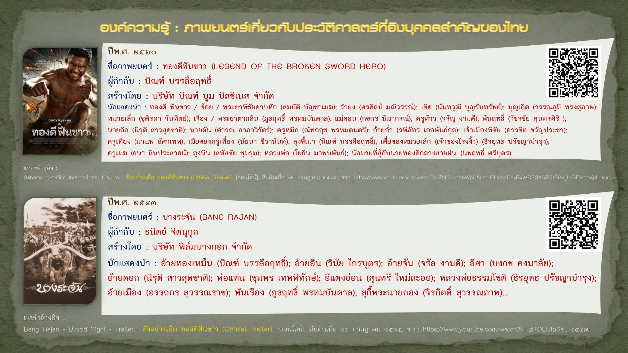 Bang Rajan - Blood Fight - Trailer. ตัวอย่างเต็ม ทองดีฟันขาว (Official Trailer). [ออนไลน์]. สืบค้นเมื่อ ๒๖ กรกฎาคม ๒๕๖๕, จาก: https://www.youtube.com/watch?v=IzROLUfpSeI, ๒๕๕๗.