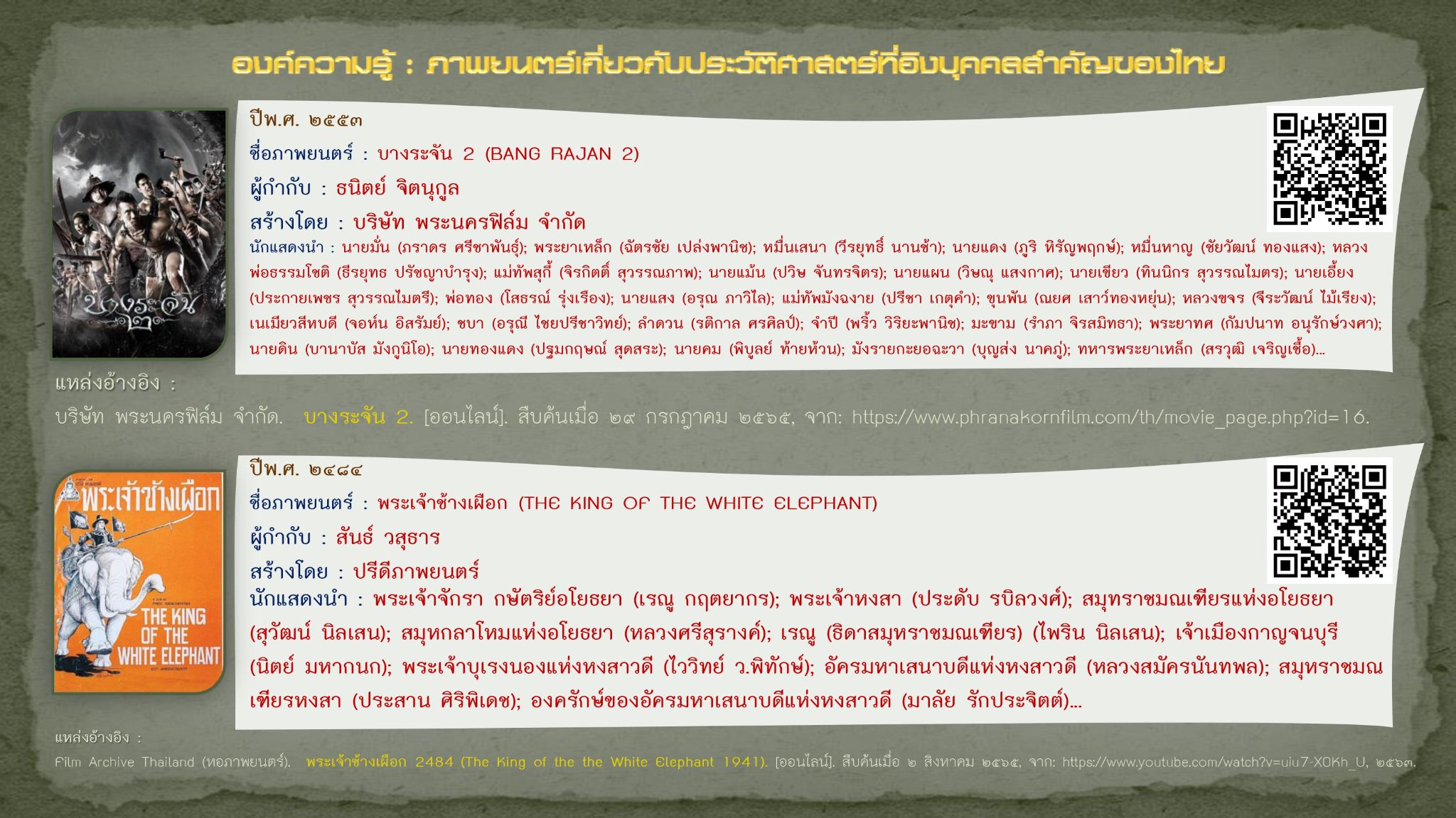 Film Archive Thailand (หอภาพยนตร์). พระเจ้าช้างเผือก 2484 (The King of the the White Elephant 1941). [ออนไลน์]. สืบค้นเมื่อ ๒ สิงหาคม ๒๕๖๕, จาก: https://www.youtube.com/watch?v=uiu7-X0Kh_U, ๒๕๖๓.