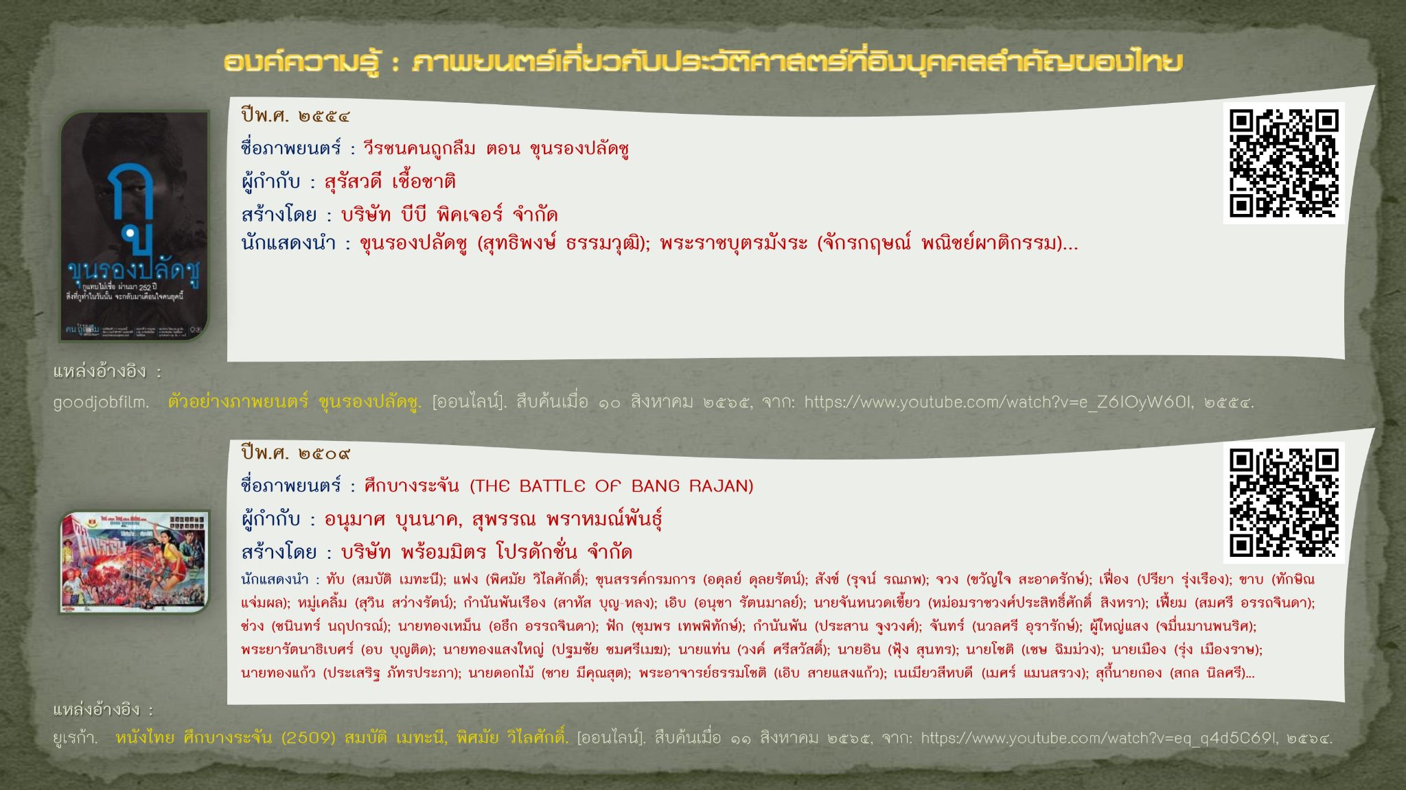 goodjobfilm. ตัวอย่างภาพยนตร์ ขุนรองปลัดชู. [ออนไลน์]. สืบค้นเมื่อ ๑๐ สิงหาคม ๒๕๖๕, จาก: https://www.youtube.com/watch?v=e_Z6IOyW60I, ๒๕๕๔.