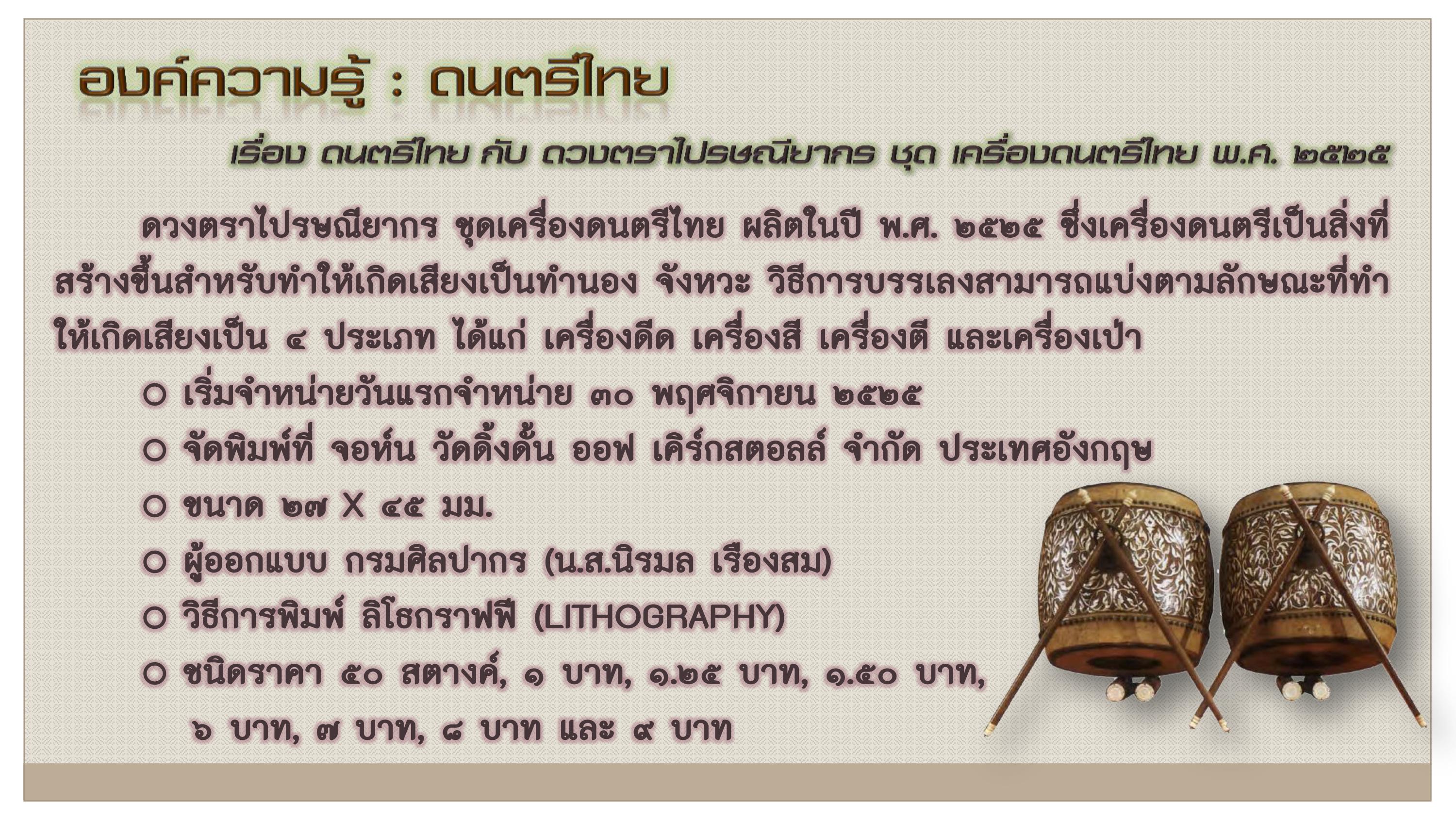 ดวงตราไปรษณียากร ชุดเครื่องดนตรีไทย ผลิตในปี พ.ศ. ๒๕๒๕ ซึ่งเครื่องดนตรีเป็นสิ่งที่สร้างขึ้นสำหรับทำให้เกิดเสียงเป็นทำนอง จังหวะ วิธีการบรรเลงสามารถแบ่งตามลักษณะที่ทำให้เกิดเสียงเป็น ๔ ประเภท ได้แก่ เครื่องดีด เครื่องสี เครื่องตี และเครื่องเป่า โดยตราไปรษณียากรชุดนี้ ประกอบไปด้วยเครื่องดนตรี คือ ฉิ่ง - ฉาบ, ปี่ใน – ปี่นอก, กลองทัด – ตะโพน, ฆ้องโหม่ง – กรับ, ฆ้องวงใหญ่, ฆ้องวงเล็ก, ระนาดเอก และระนาดทุ้ม