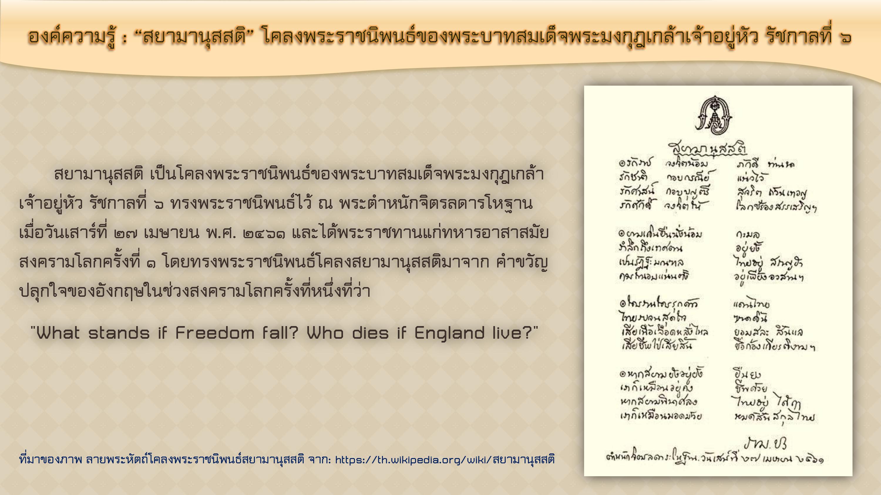 วิกิพีเดีย. สยามานุสสติ. [ออนไลน์]. สืบค้นเมื่อ ๑๘ เมษายน ๒๕๖๗, จาก: https://th.wikipedia.org/wiki/สยามานุสสติ.