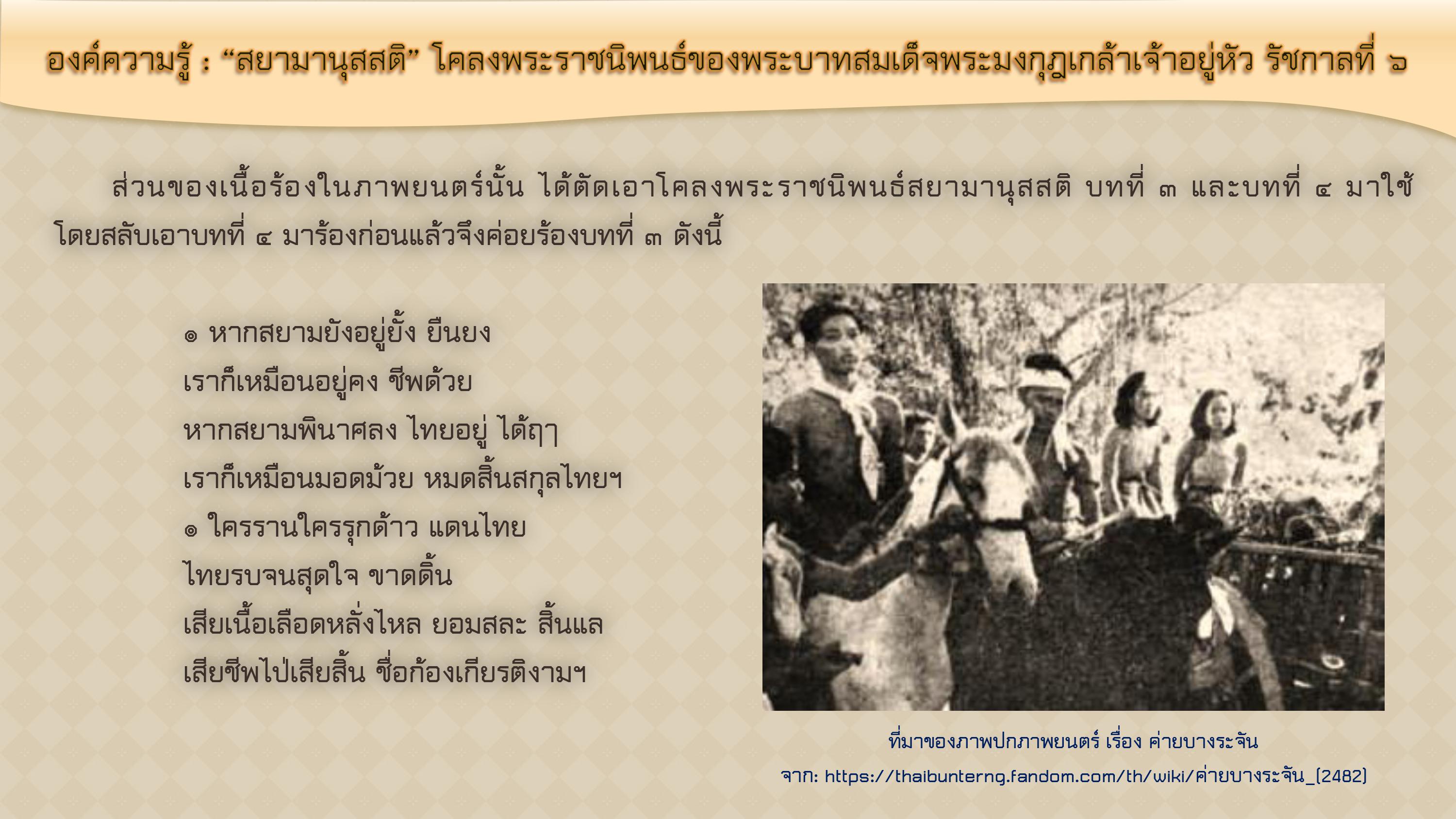 Athip channel. เพลงสยามานุสสติ กรมดุริยางค์ทหารบก. [ออนไลน์]. สืบค้นเมื่อ ๑๘ เมษายน ๒๕๖๗, จาก: https://www.youtube.com/watch?v=B_Jdvx8nI8o, ๒๕๖๒.