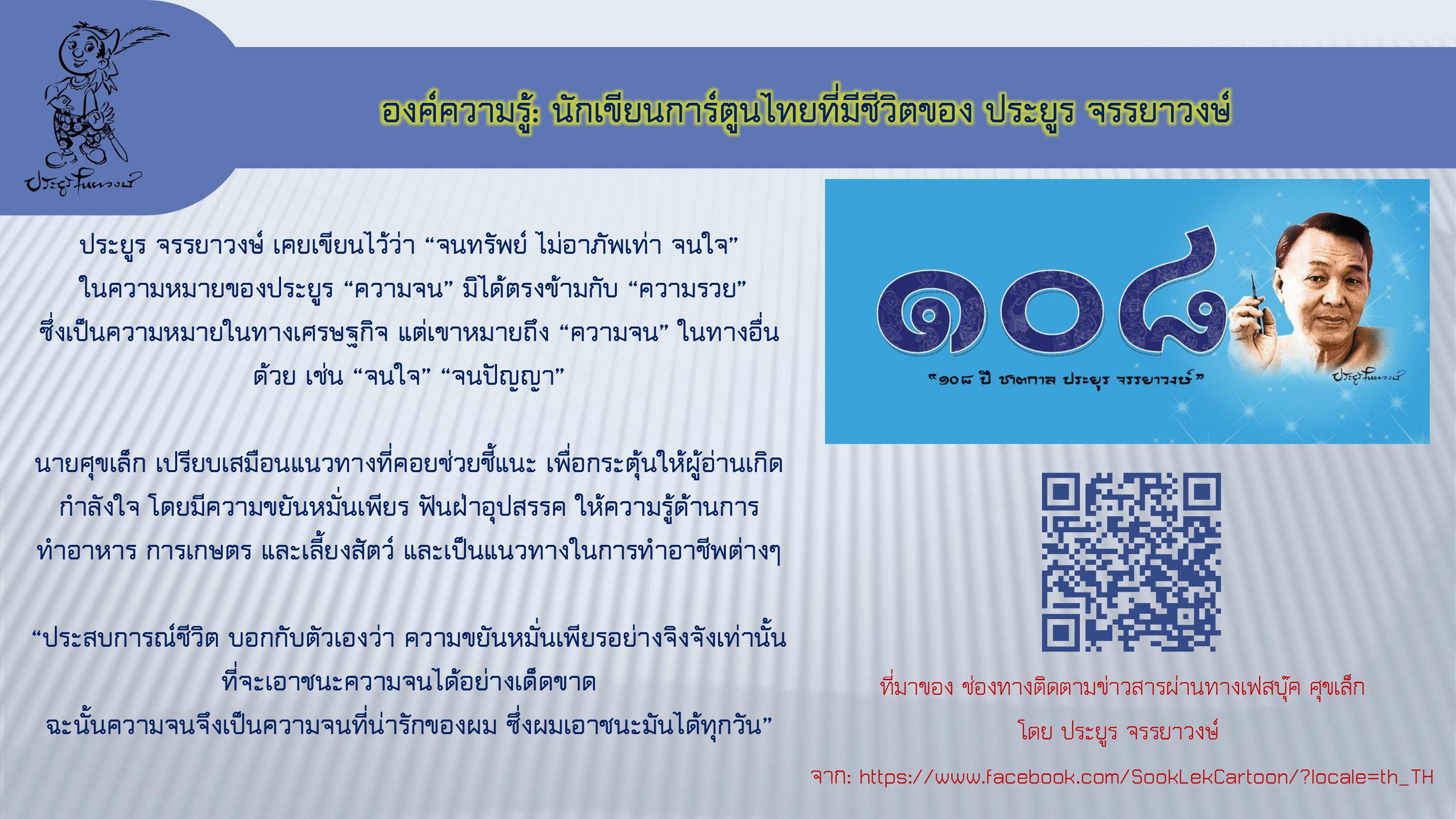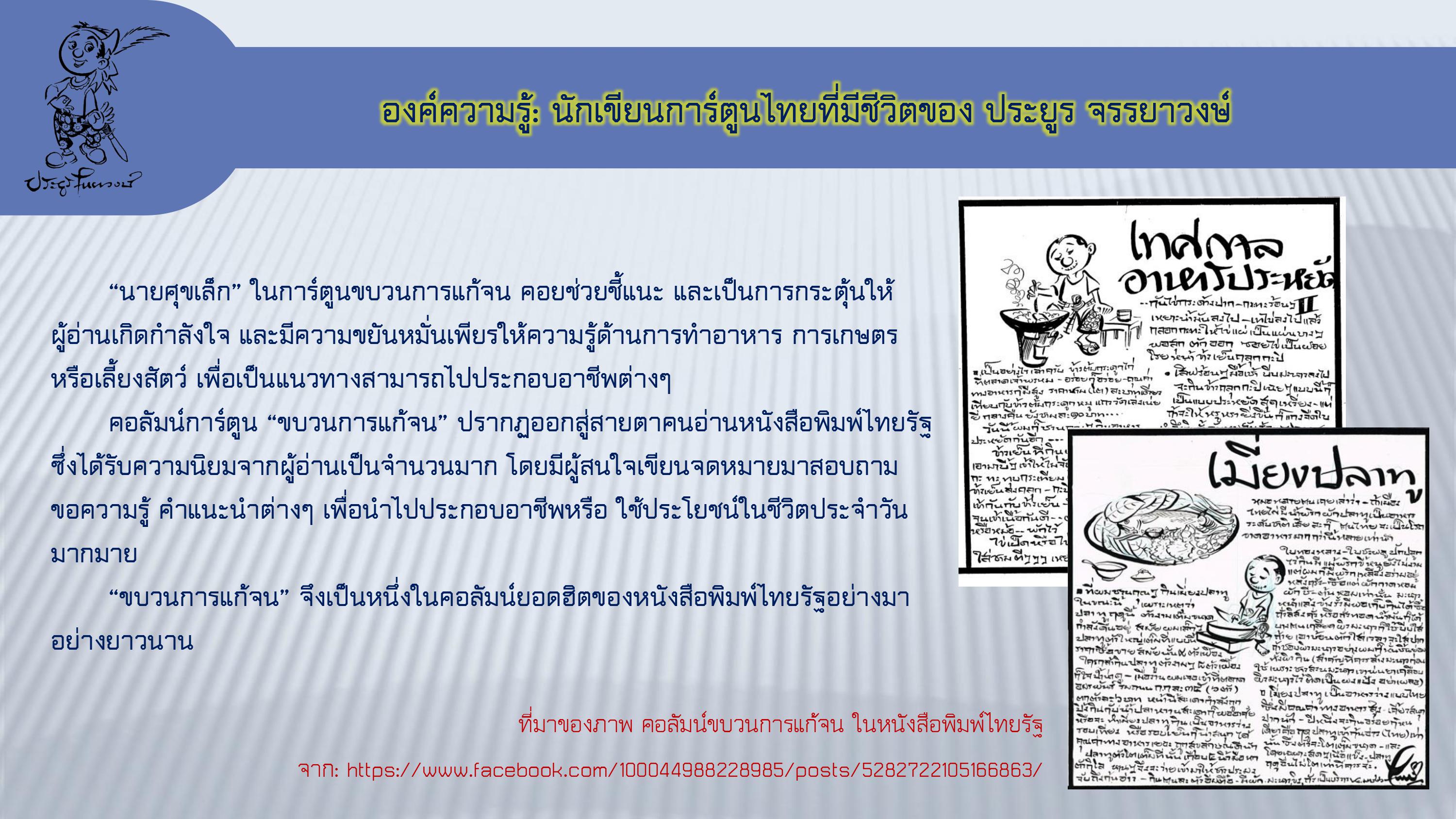 ยอดมนุษย์..คนธรรมดา. ประยูร จรรยาวงษ์ : นักเขียนการ์ตูน ‘ขบวนการแก้จน’. [ออนไลน์]. สืบค้นเมื่อ ๓ พฤษภาคม ๒๕๖๗,