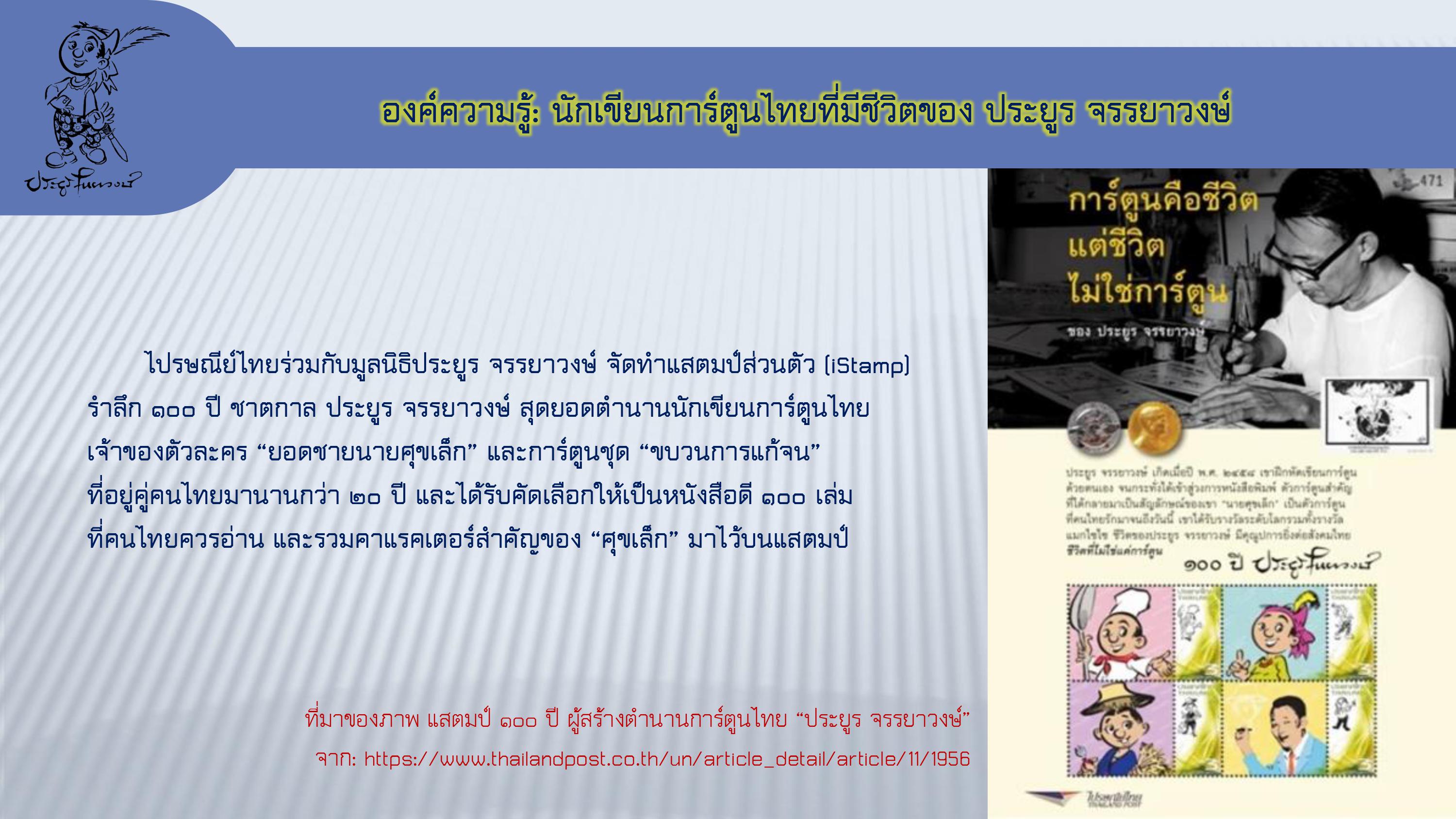 ไปรษณีย์ไทย. แสตมป์ ๑๐๐ ปี ผู้สร้างตำนานการ์ตูนไทย “ประยูร จรรยาวงษ์”. [ออนไลน์]. สืบค้นเมื่อ ๓ พฤษภาคม ๒๕๖๗,