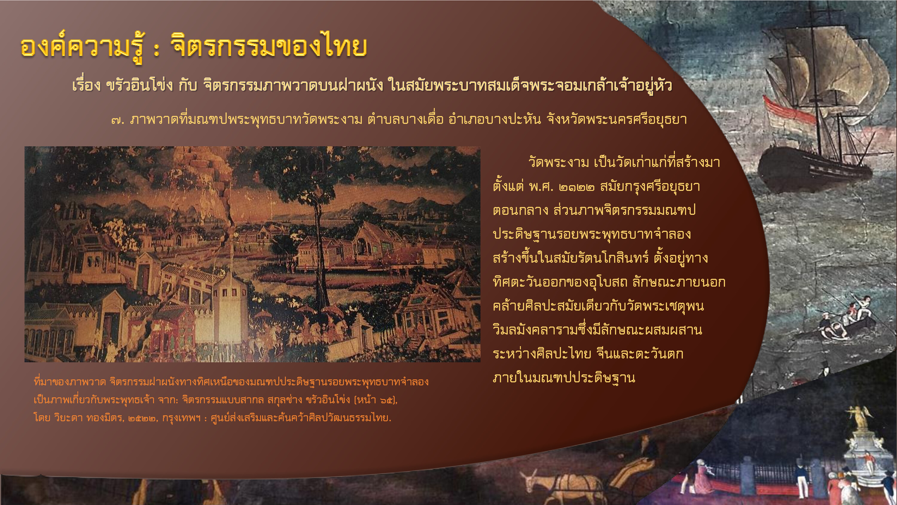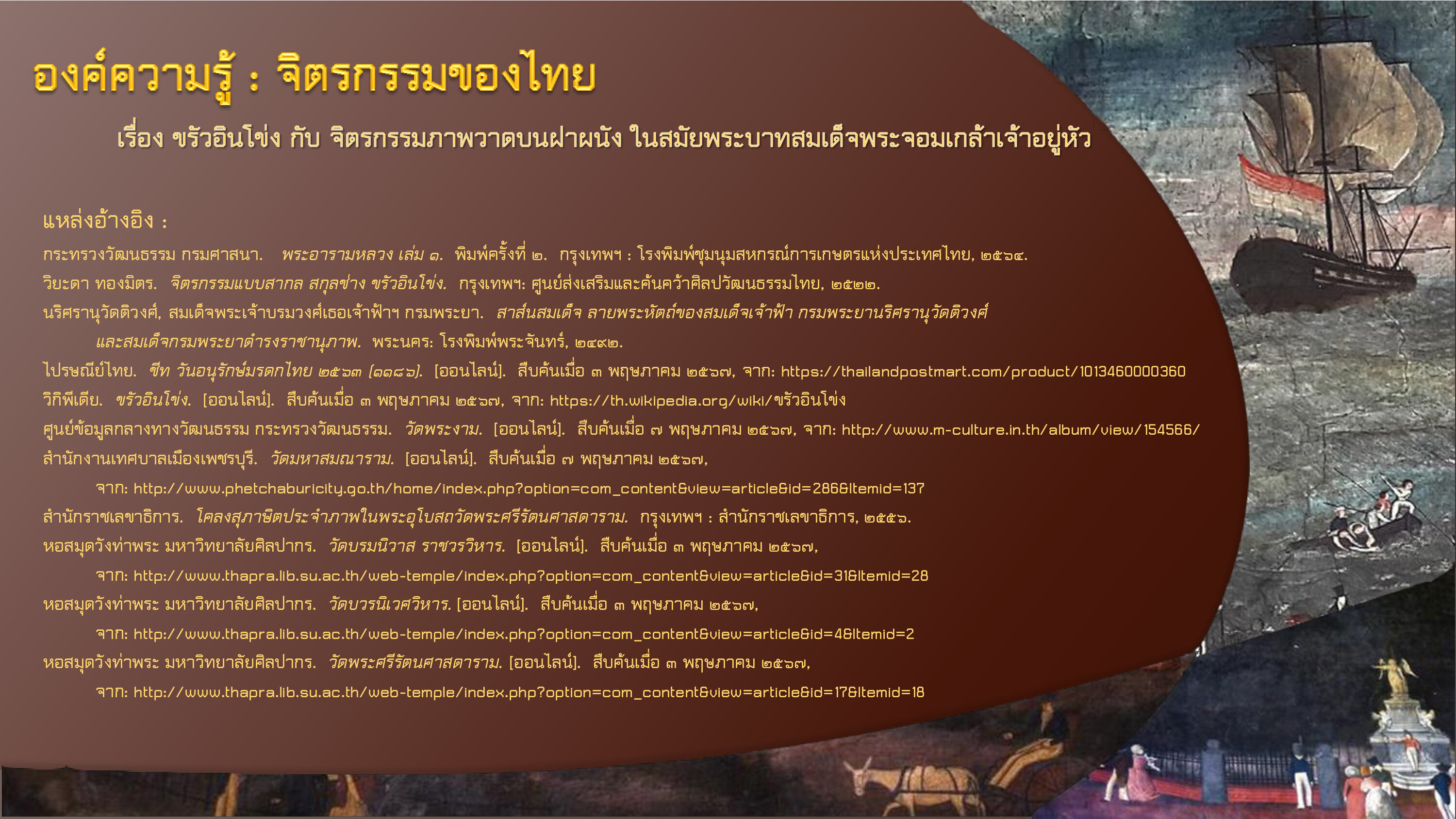 วิยะดา ทองมิตร. จิตรกรรมแบบสากล สกุลช่าง ขรัวอินโข่ง. กรุงเทพฯ: ศูนย์ส่งเสริมและค้นคว้าศิลปวัฒนธรรมไทย, ๒๕๒๒.