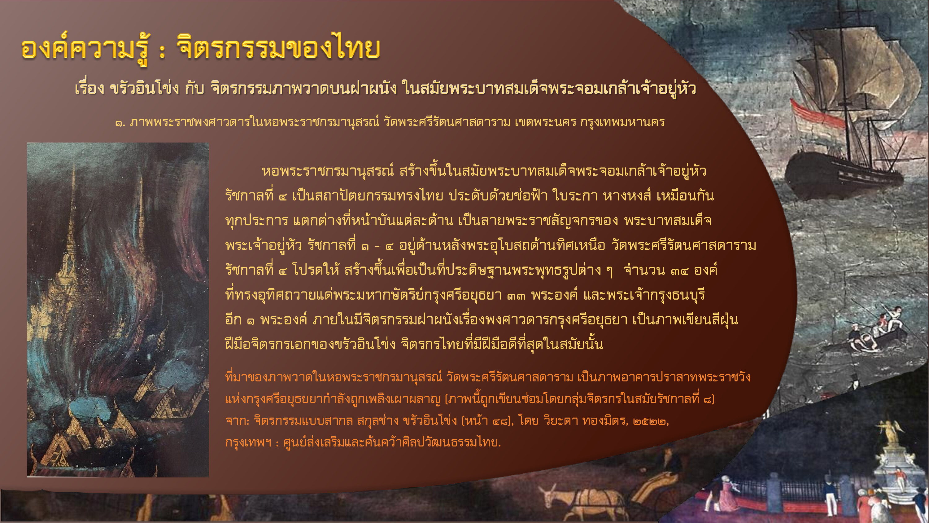 หอสมุดวังท่าพระ มหาวิทยาลัยศิลปากร. วัดพระศรีรัตนศาสดาราม. [ออนไลน์]. สืบค้นเมื่อ ๓ พฤษภาคม ๒๕๖๗,