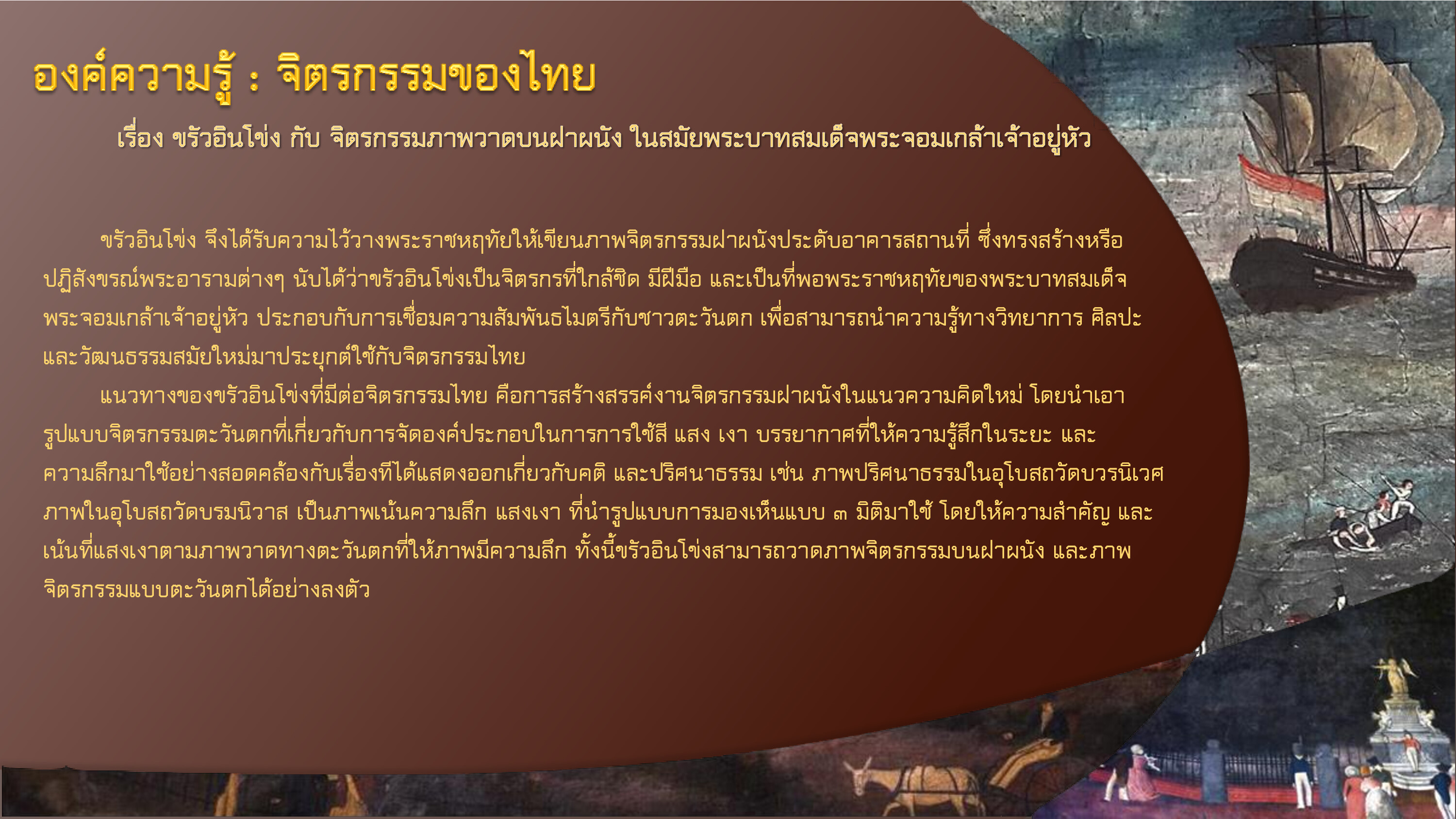 ขรัวอินโข่ง เป็นศิลปินที่ได้รับการยกย่อง เป็นจิตรกรเอกในสมัยรัชกาลที่ ๔ แห่งกรุงรัตนโกสินทร์ และศิลปินไทยคนแรกที่ใช้เทคนิคการเขียนภาพฝาผนังแบบตะวันตกที่แสดงปริมาตรใกล้ไกล นับเป็นศิลปินที่มีความก้าวหน้าในการผสมผสานแนวดำเนินชีวิตแบบไทย และแนวดำเนินชีวิตของตะวันตกเข้าด้วยกันอย่างลงตัว