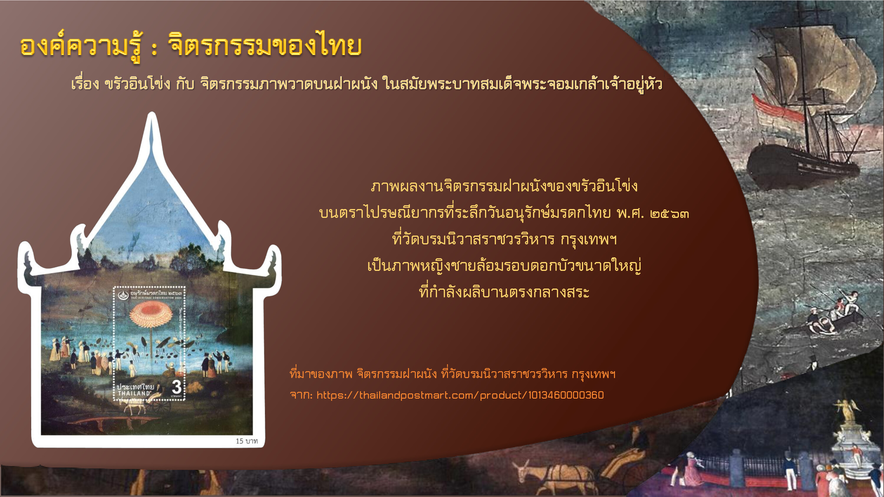 ไปรษณีย์ไทย. ชีท วันอนุรักษ์มรดกไทย ๒๕๖๓ (๑๑๘๖). [ออนไลน์]. สืบค้นเมื่อ ๓ พฤษภาคม ๒๕๖๗, จาก: https://thailandpostmart.com/product/1013460000360