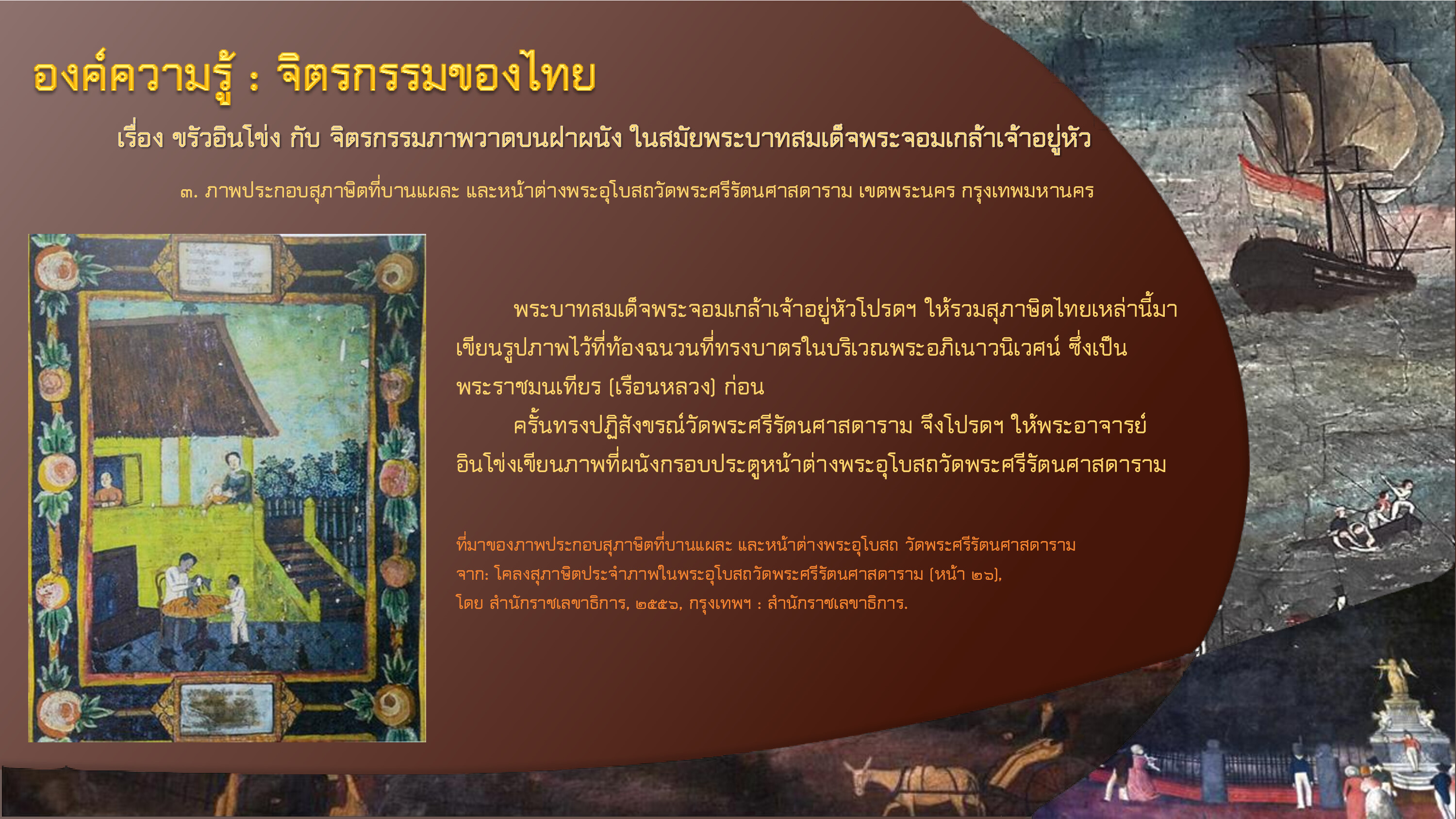 สำนักราชเลขาธิการ. โคลงสุภาษิตประจำภาพในพระอุโบสถวัดพระศรีรัตนศาสดาราม. กรุงเทพฯ : สำนักราชเลขาธิการ, ๒๕๕๖.