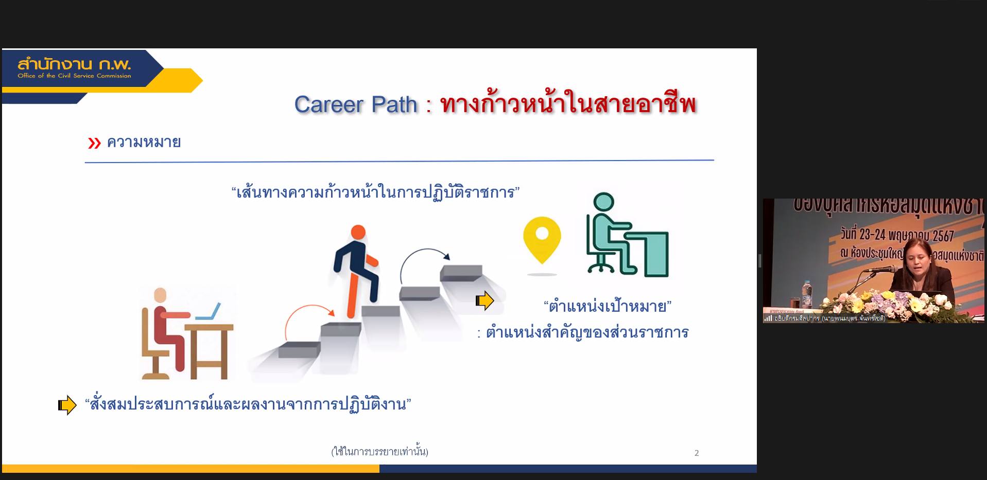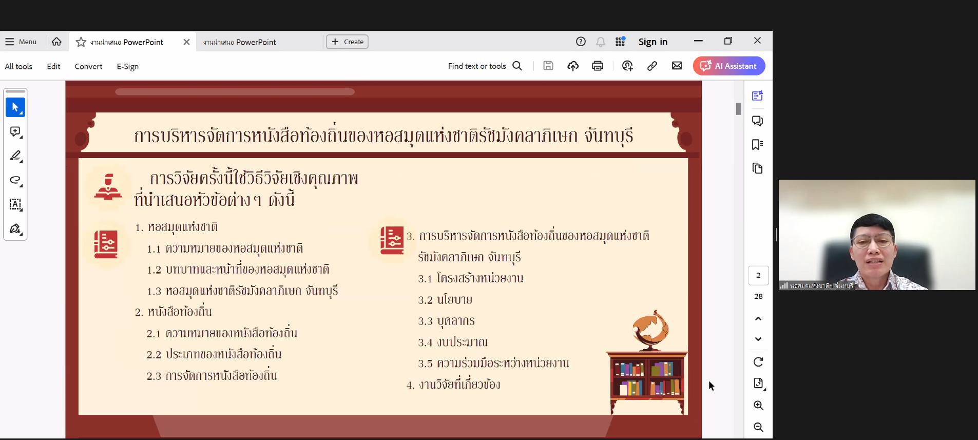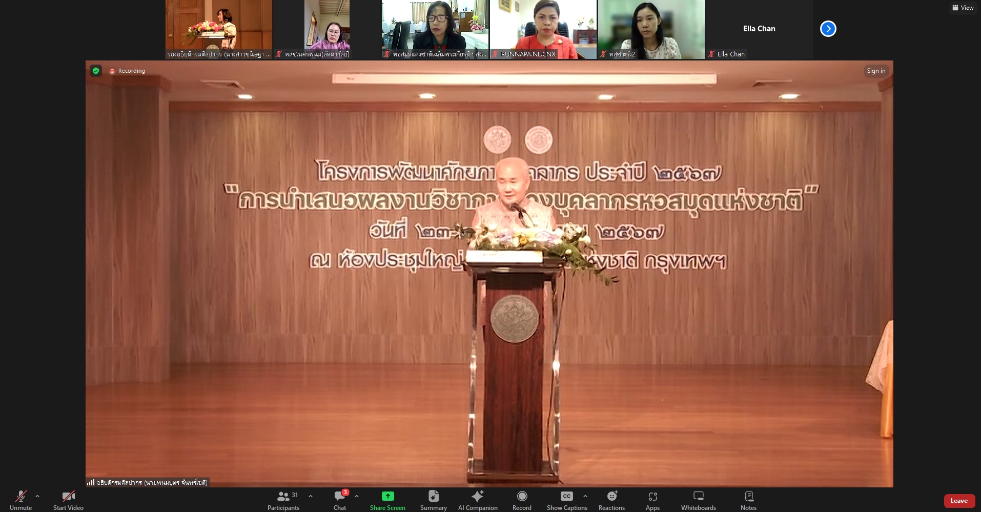 วันพฤหัสบดีที่ ๒๓ พฤษภาคม ๒๕๖๗ นางสาวปุณณภา สุขสาคร ผู้อำนวยการหอสมุดแห่งชาติรัชมังคลาภิเษก เชียงใหม่ และบรรณารักษ์ เข้าร่วมโครงการพัฒนาศักยภาพบุคลากร ประจำปี ๒๕๖๗ เรื่อง “การนำเสนอผลงานวิชาการของบุคลากรหอสมุดแห่งชาติ” โดยได้รับฟังการบรรยาย เรื่อง “เส้นทางความก้าวหน้าในสายงานราชการประเภทวิชาการของข้าราชการพลเรือนสำนักหอสมุดแห่งชาติ กรมศิลปากร” และเรื่อง “หลักเกณฑ์การทำผลงานวิชาการเพื่อเลื่อนระดับในข้าราชการพลเรือนสายงานประเภทวิชาการ ของสำนักหอสมุดแห่งชาติ กรมศิลปากร” และรับฟังการนำเสนอผลงานวิชาการของบุคลากรสำนักหอสมุดแห่งชาติ ผ่านโปรแกรม Zoom Meeting