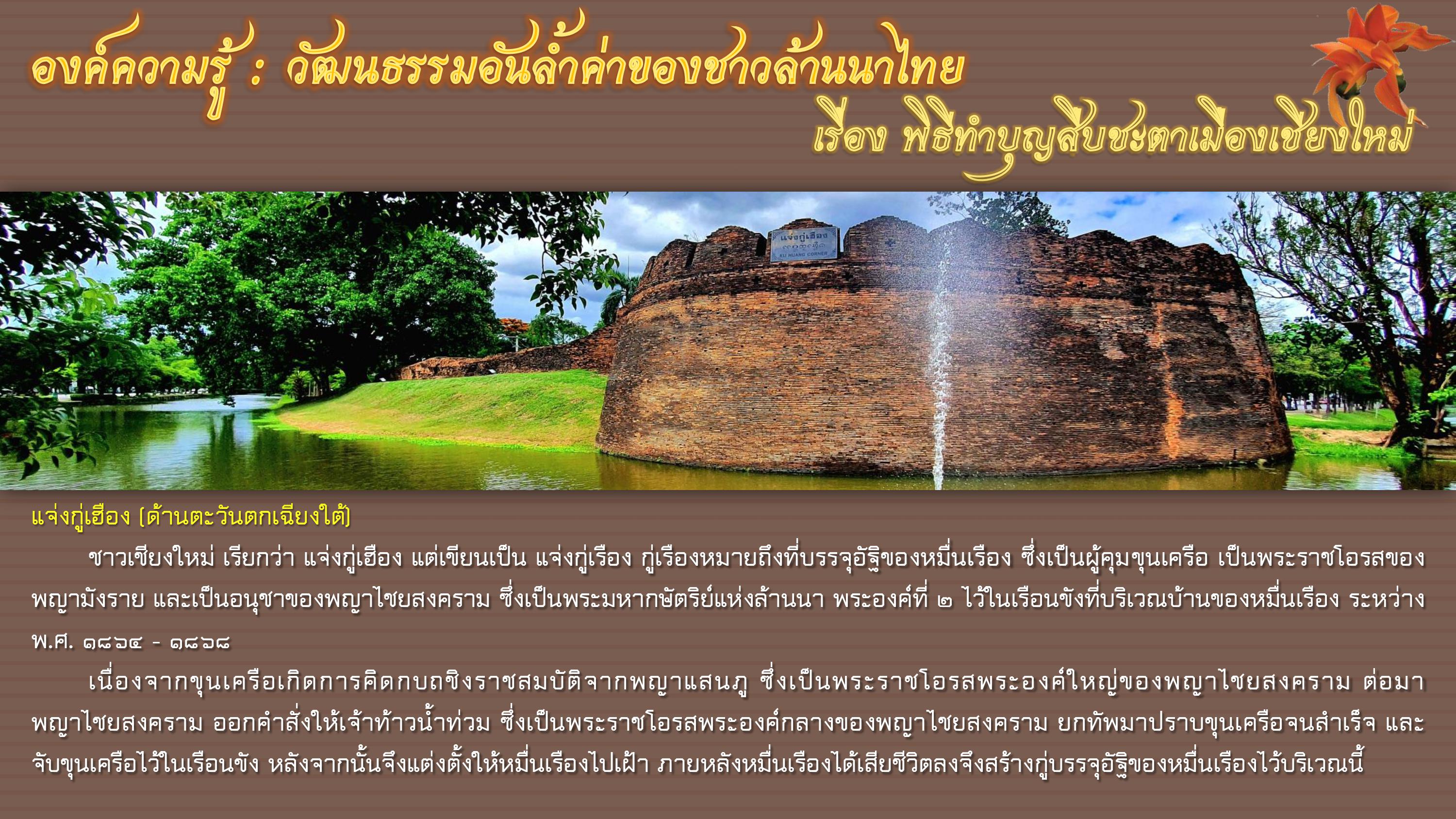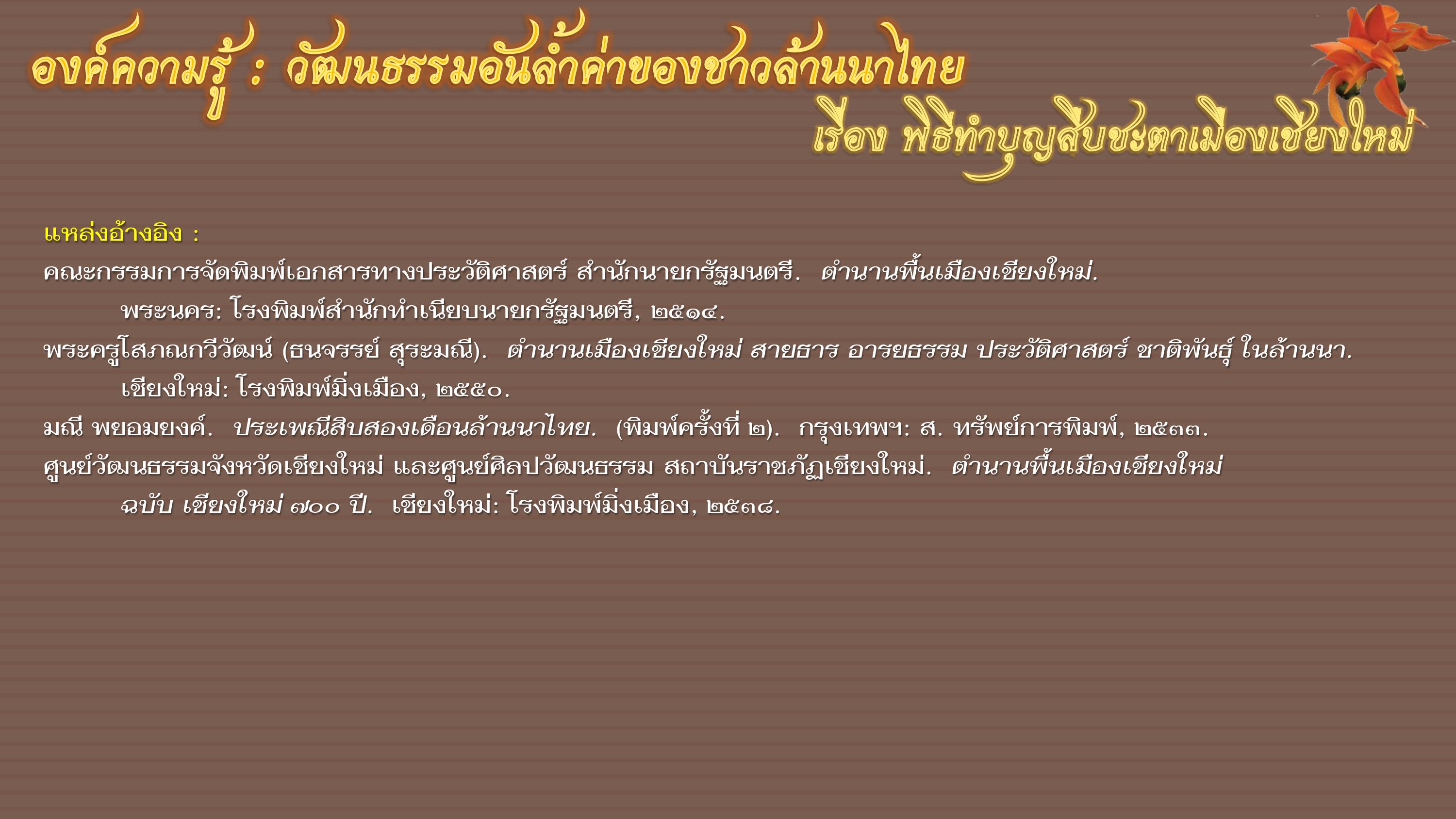 ศูนย์วัฒนธรรมจังหวัดเชียงใหม่ และศูนย์ศิลปวัฒนธรรม สถาบันราชภัฏเชียงใหม่. ตำนานพื้นเมืองเชียงใหม่ ฉบับ เชียงใหม่ ๗๐๐ ปี. เชียงใหม่: โรงพิมพ์มิ่งเมือง, ๒๕๓๘.