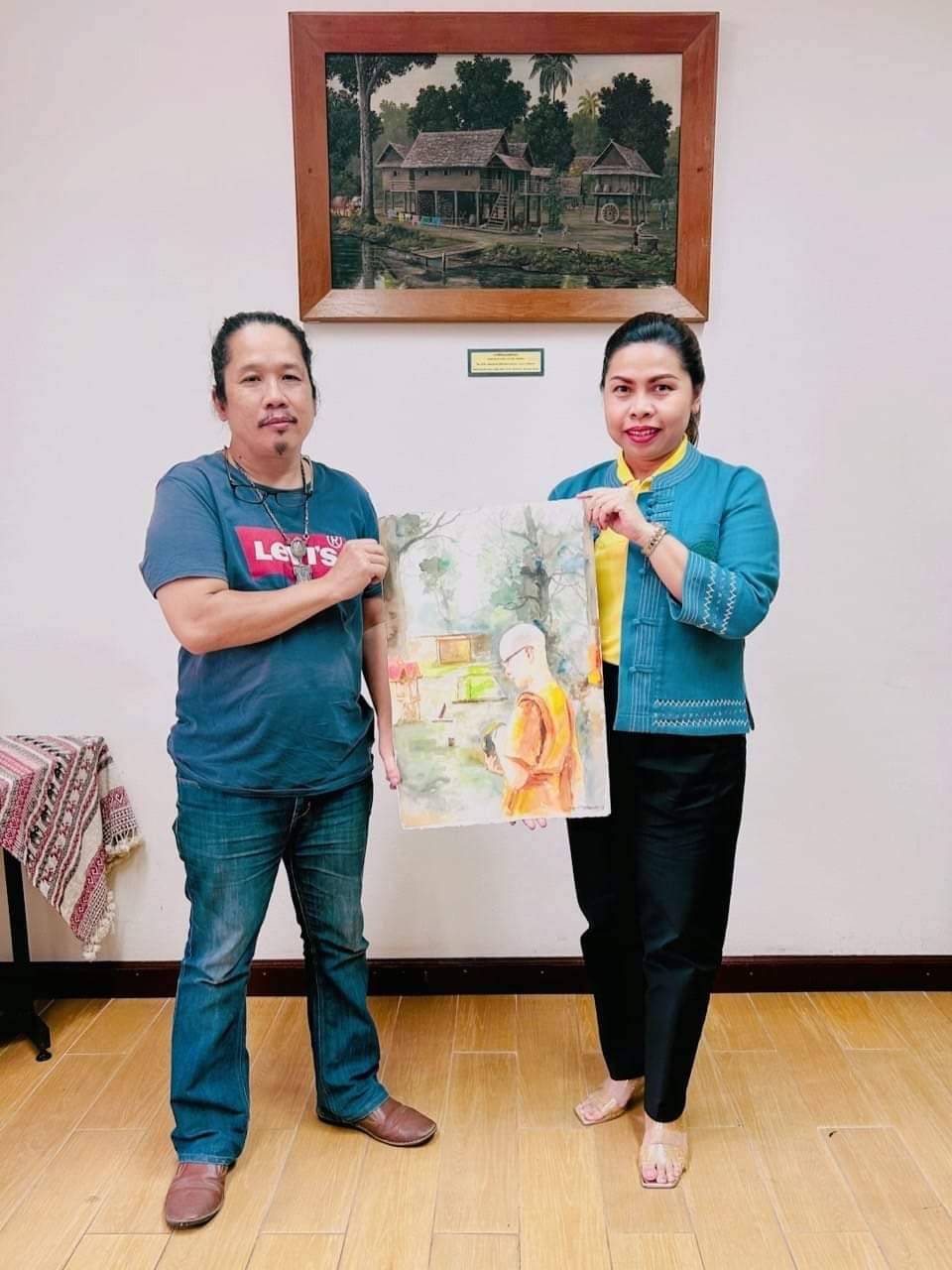ประธานชมรมสล่าแต้มงาม เชียงใหม่ เป็นตัวแทนมอบภาพวาดสีน้ำ ในชุดแอ่วกุมกามยามแลง ผลงานโดยอาจารย์สงวน น้อยเงิน ให้หอสมุดแห่งชาติรัชมังคลาภิเษก เชียงใหม่