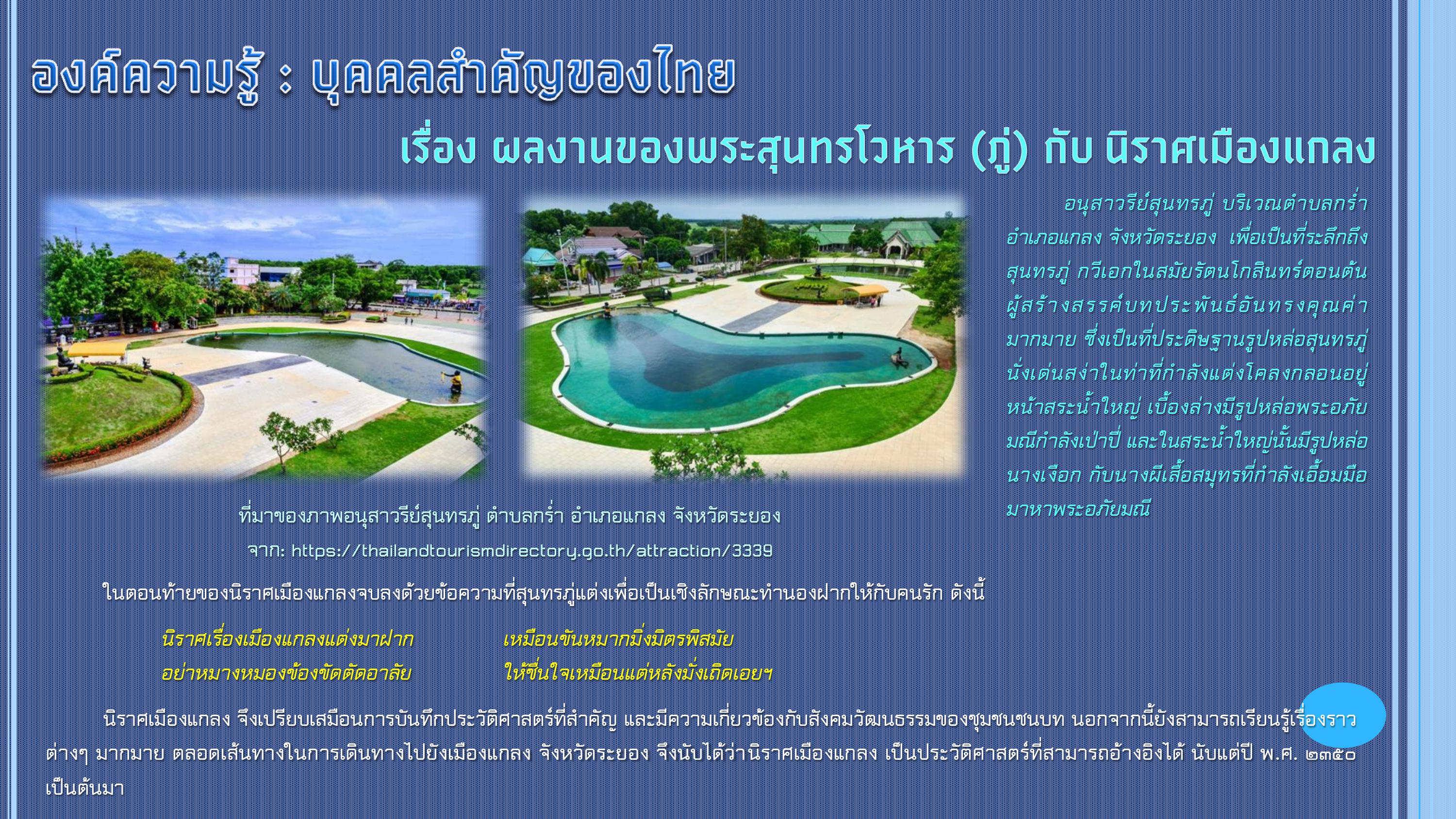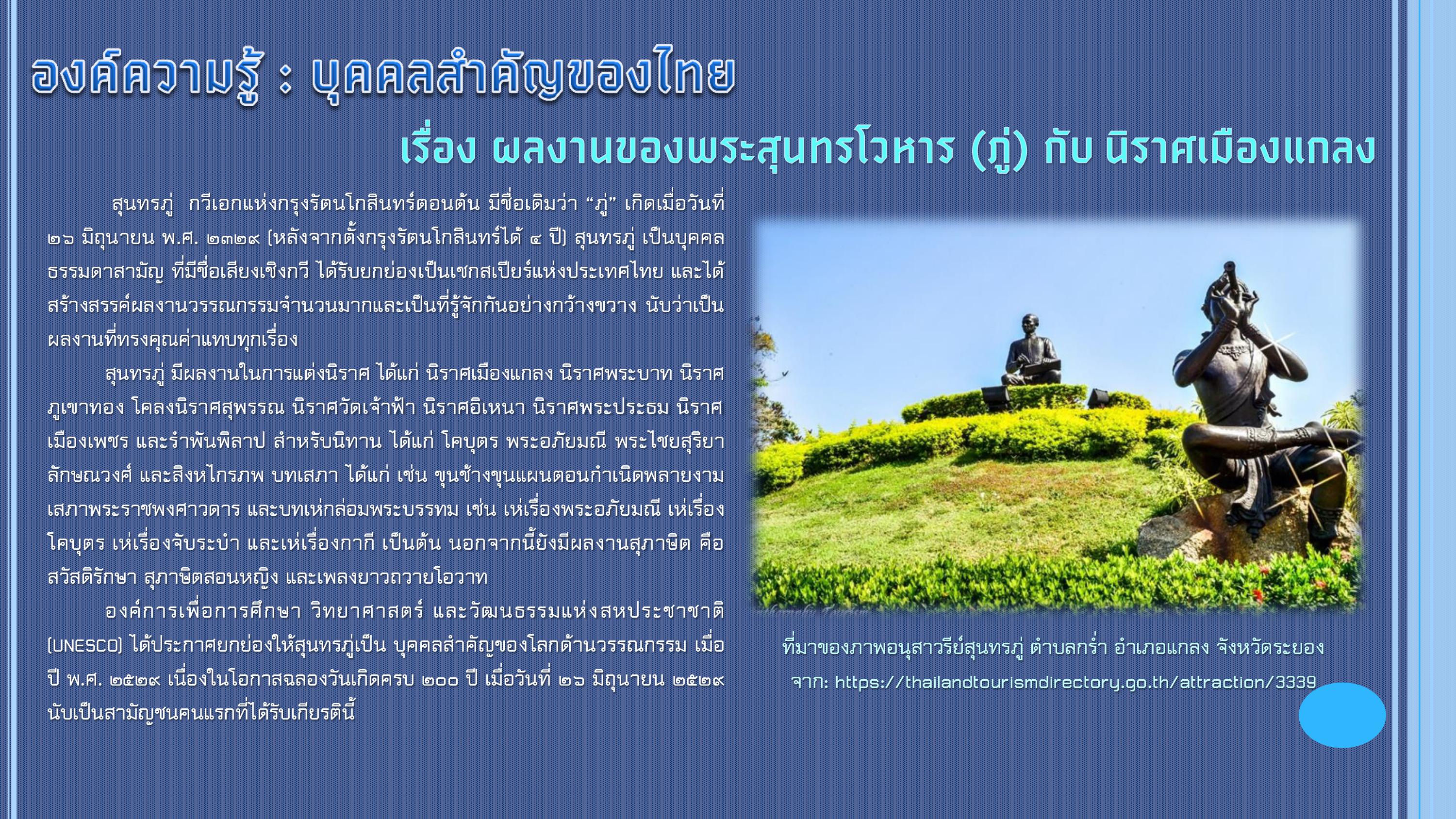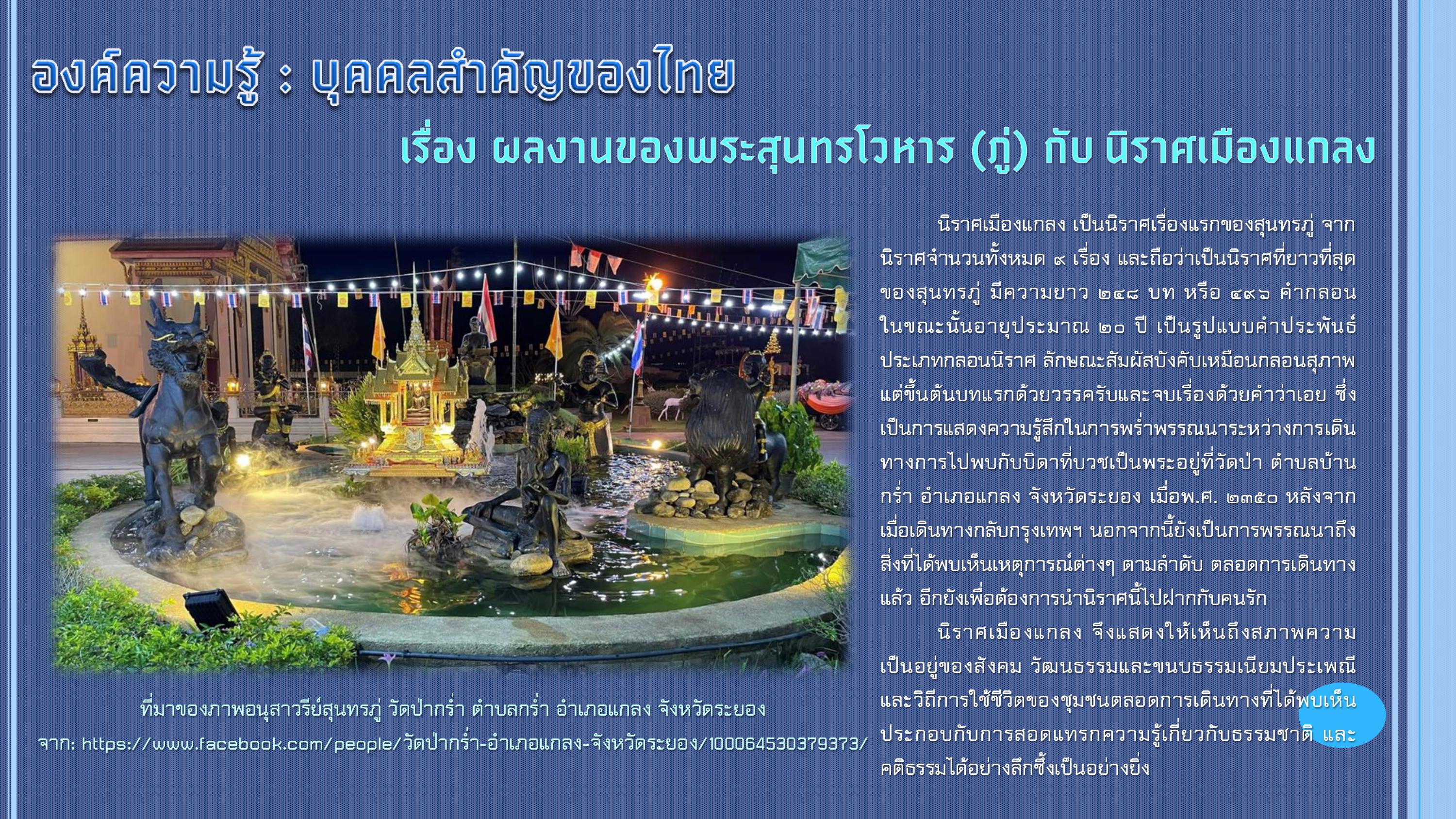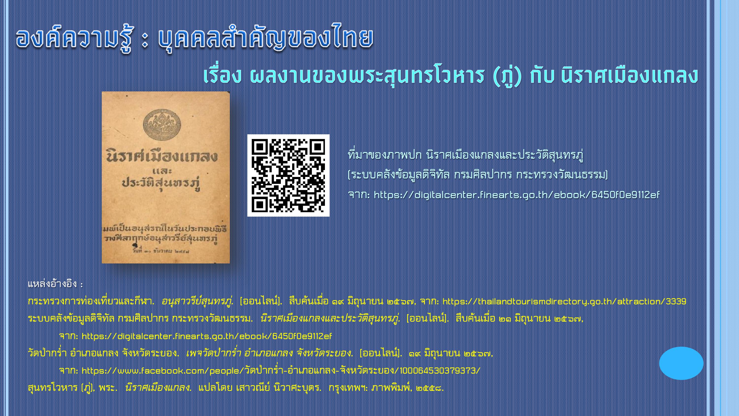 ระบบคลังข้อมูลดิจิทัล กรมศิลปากร กระทรวงวัฒนธรรม. นิราศเมืองแกลงและประวัติสุนทรภู่. [ออนไลน์]. สืบค้นเมื่อ ๒๑ มิถุนายน ๒๕๖๗,