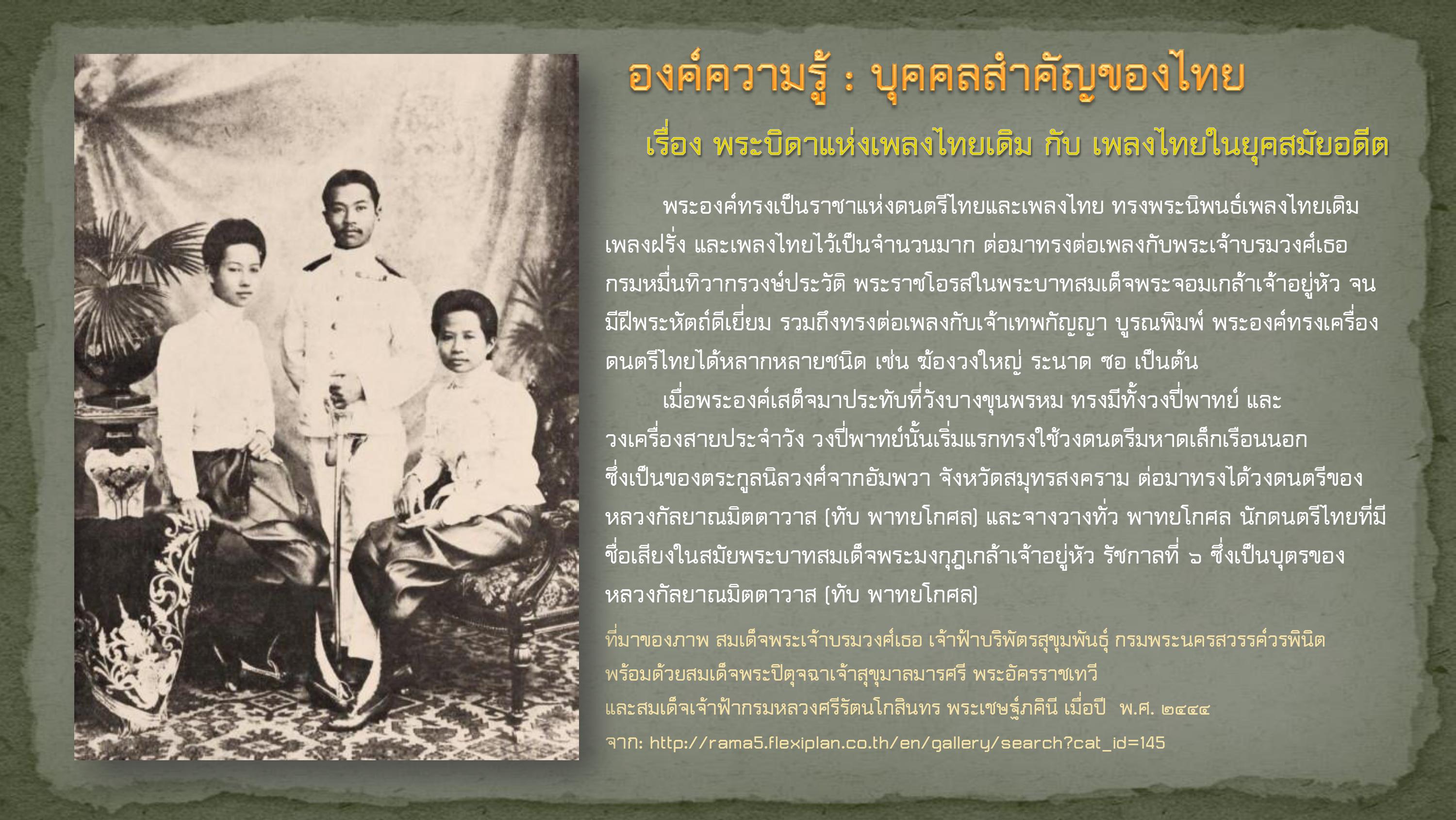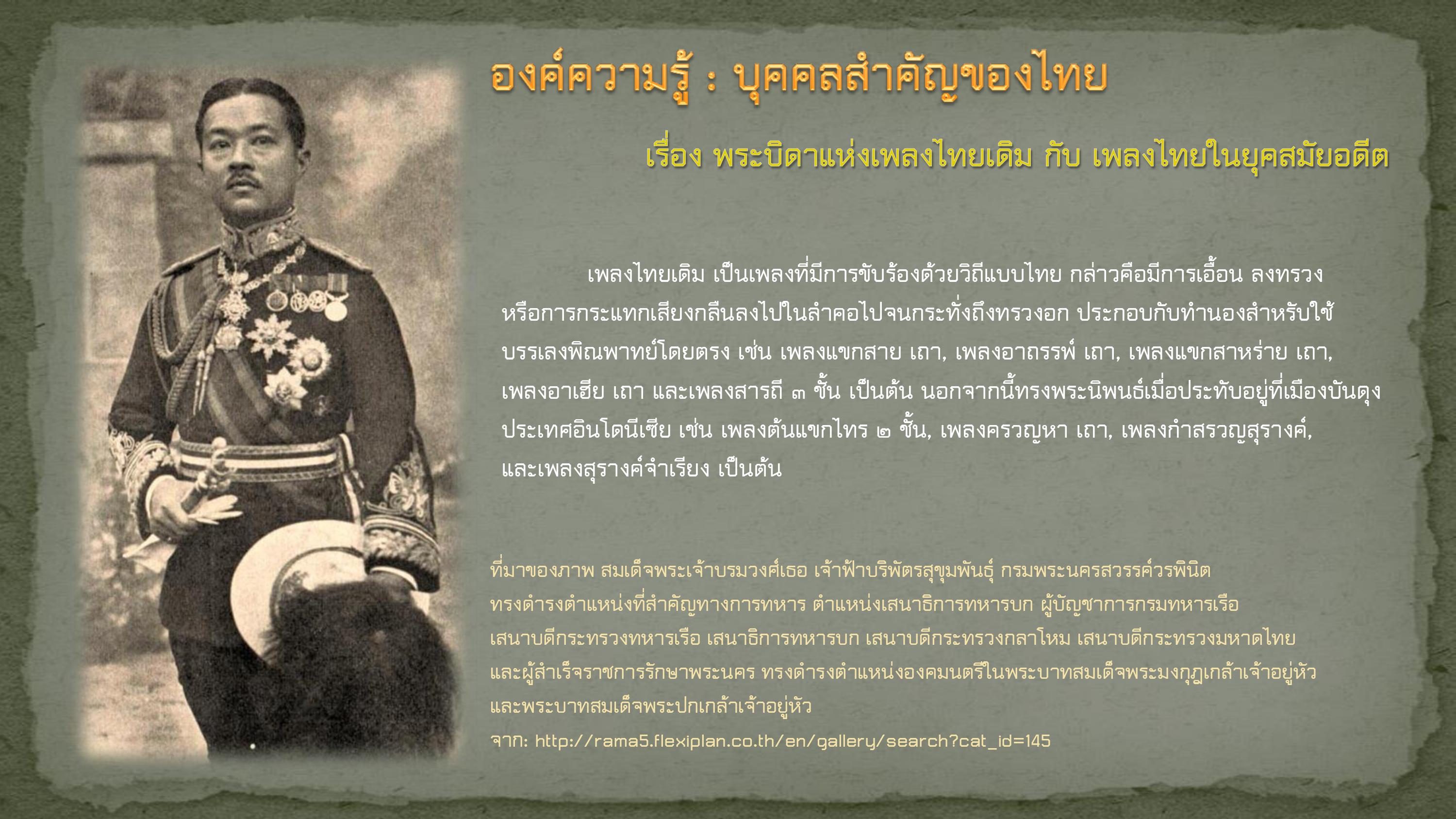 สมเด็จพระเจ้าบรมวงศ์เธอ เจ้าฟ้าบริพัตรสุขุมพันธุ์ กรมพระนครสวรรค์วรพินิต ทรงพระปรีชาสามารถในงานดนตรี พระองค์เป็นราชาแห่งดนตรีไทยและเพลงไทย พระองค์ทรงเครื่องดนตรีไทยได้หลายชนิด เช่น ฆ้องวงใหญ่ ระนาด ซอ เป็นต้น ทรงได้รับการขนานพระนามเป็น “พระบิดาแห่งเพลงไทยเดิม”