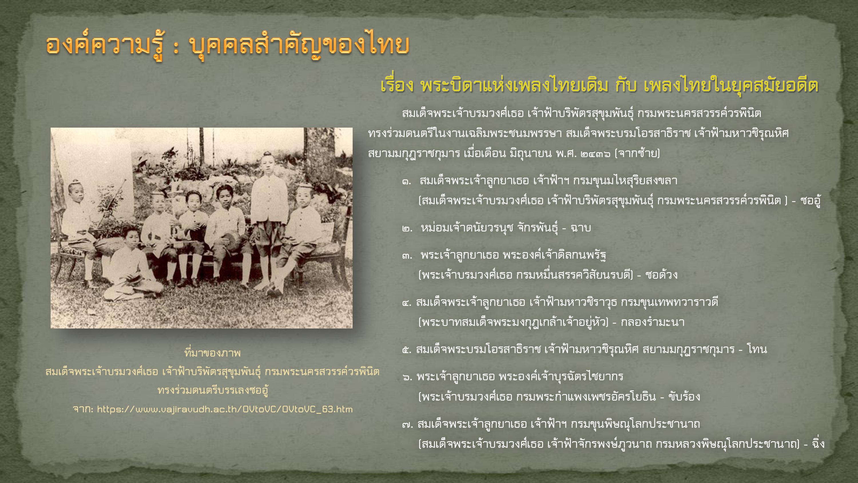วรชาติ มีชูบท. พระบาทสมเด็จพระมงกุฎเกล้าเจ้าอยู่หัวกับการดนตรี (๑). [ออนไลน์]. สืบค้นเมื่อ ๒๘ มิถุนายน ๒๕๖๗,