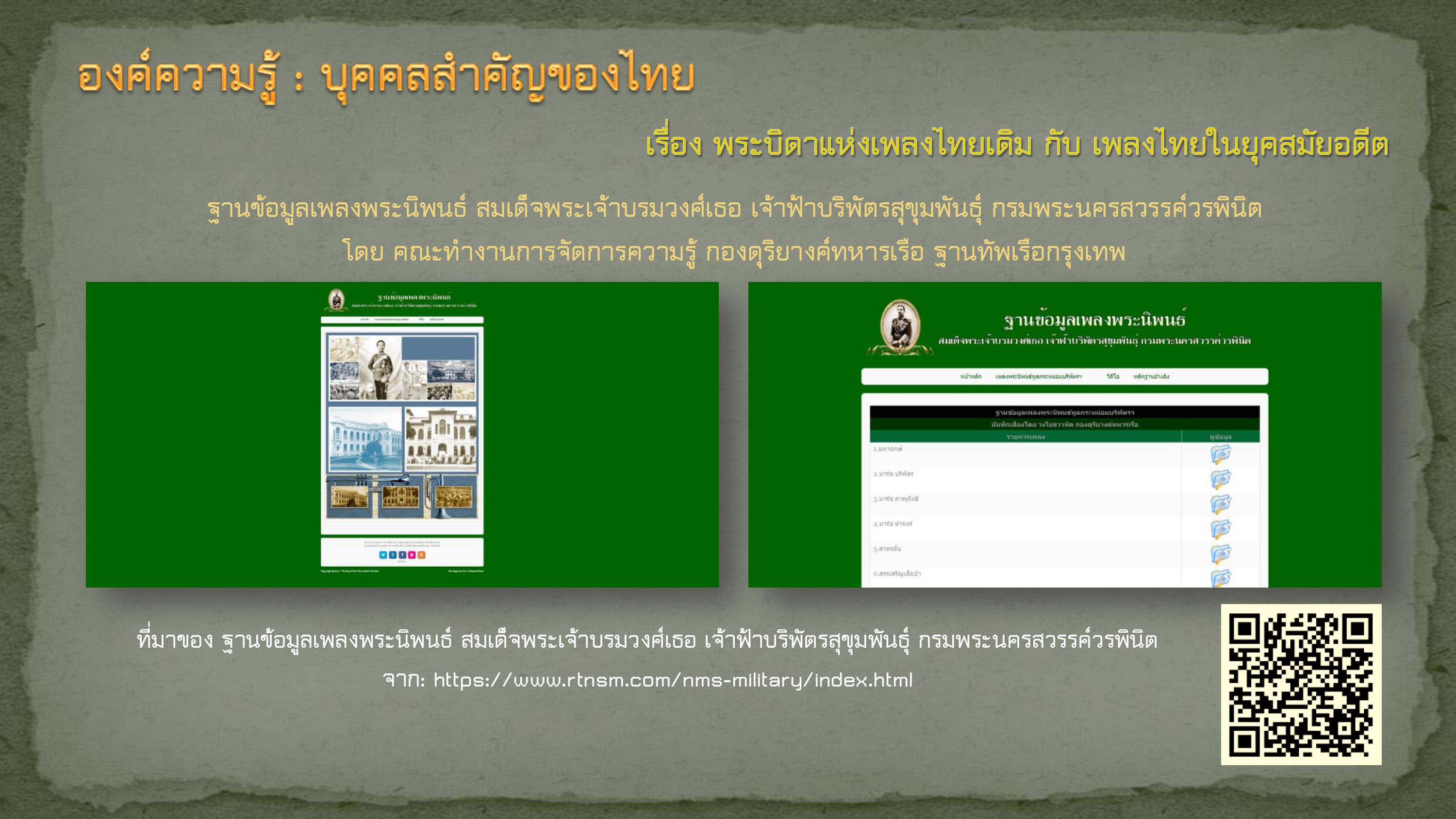 คณะทำงานการจัดการความรู้ กองดุริยางค์ทหารเรือ ฐานทัพเรือกรุงเทพ. ฐานข้อมูลเพลงพระนิพนธ์ สมเด็จพระเจ้าบรมวงศ์เธอ เจ้าฟ้าบริพัตรสุขุมพันธุ์ กรมพระนครสวรรค์วรพินิต.