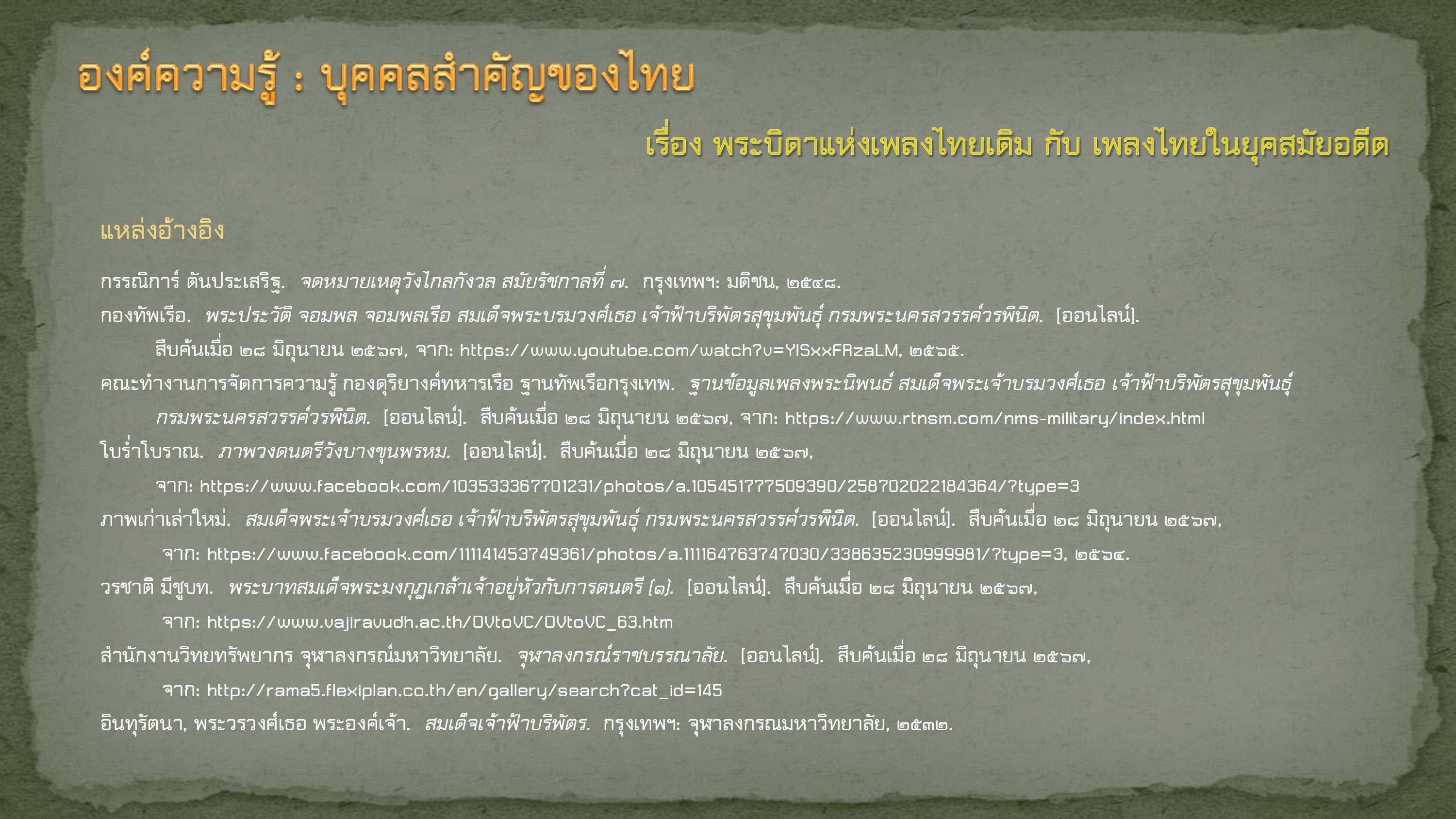 วรชาติ มีชูบท. พระบาทสมเด็จพระมงกุฎเกล้าเจ้าอยู่หัวกับการดนตรี (๑). [ออนไลน์]. สืบค้นเมื่อ ๒๘ มิถุนายน ๒๕๖๗,