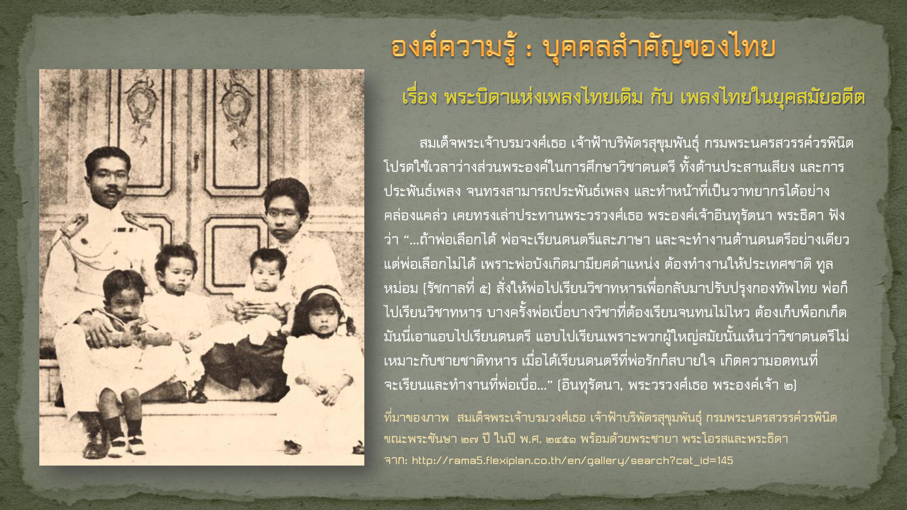 สมเด็จพระเจ้าบรมวงศ์เธอ เจ้าฟ้าบริพัตรสุขุมพันธุ์ กรมพระนครสวรรค์วรพินิต ทรงพระปรีชาสามารถในงานดนตรี พระองค์เป็นราชาแห่งดนตรีไทยและเพลงไทย พระองค์ทรงเครื่องดนตรีไทยได้หลายชนิด เช่น ฆ้องวงใหญ่ ระนาด ซอ เป็นต้น ทรงได้รับการขนานพระนามเป็น “พระบิดาแห่งเพลงไทยเดิม”