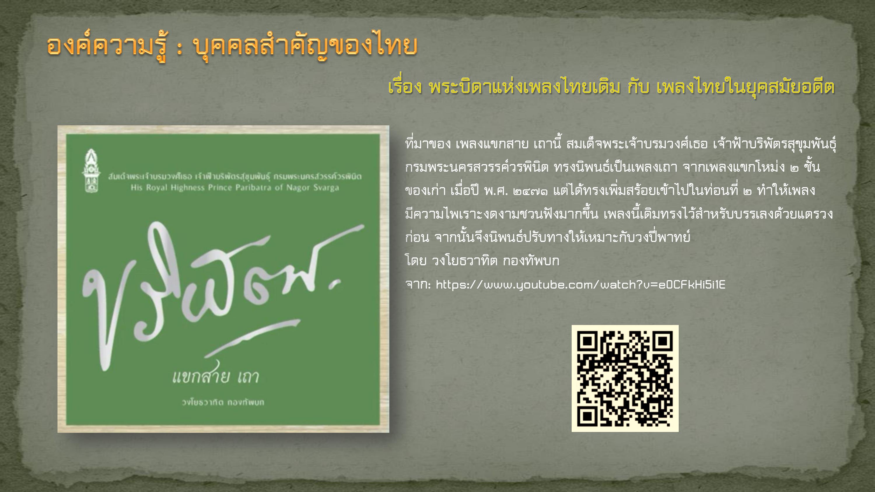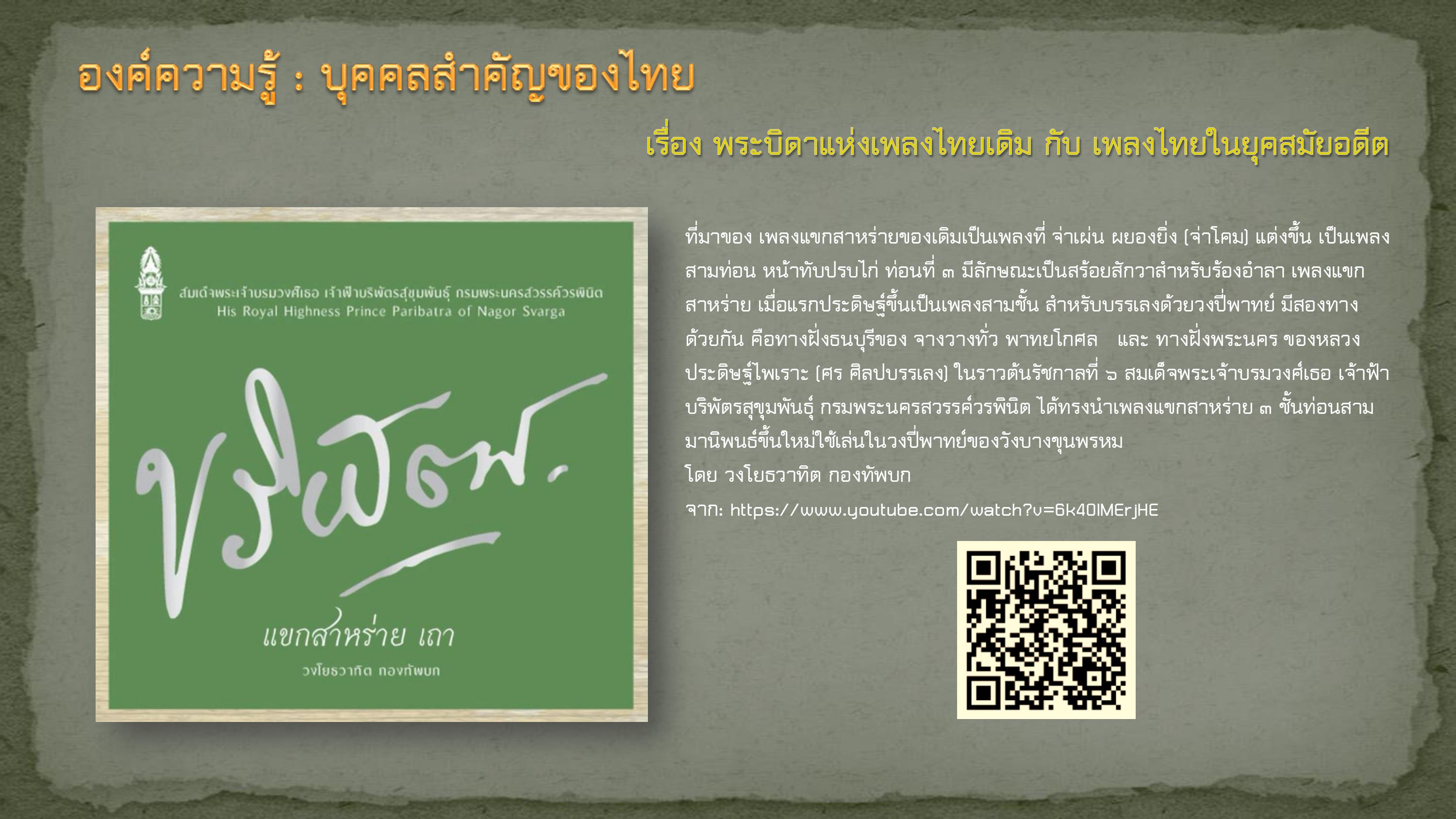 Music of Prince Paribatra. เพลงพระนิพนธ์ทูลกระหม่อมบริพัตร : แขกสาย เถา. [ออนไลน์]. สืบค้นเมื่อ ๒๘ มิถุนายน ๒๕๖๗,