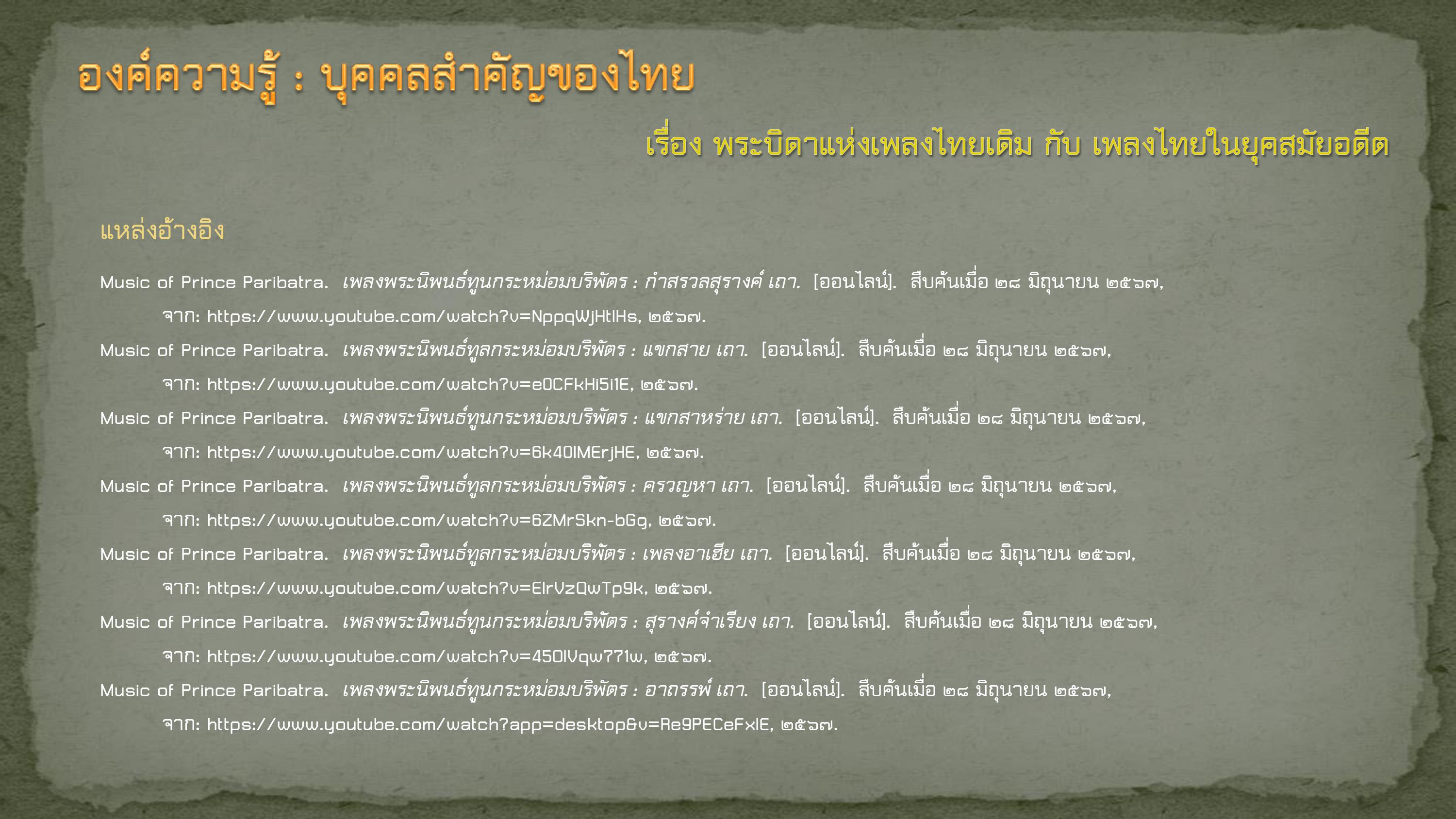 Music of Prince Paribatra. เพลงพระนิพนธ์ทูลกระหม่อมบริพัตร : ครวญหา เถา. [ออนไลน์]. สืบค้นเมื่อ ๒๘ มิถุนายน ๒๕๖๗,