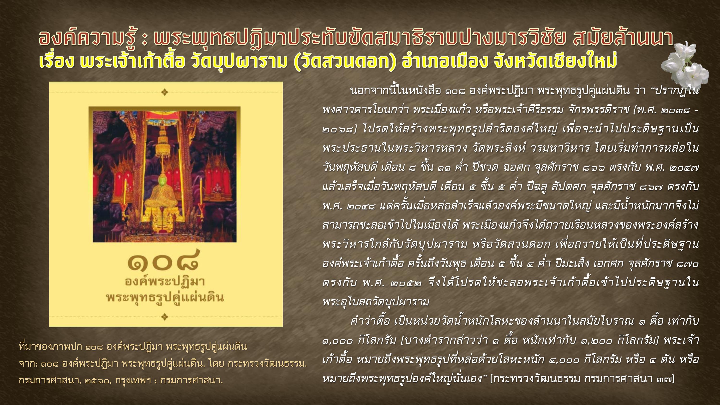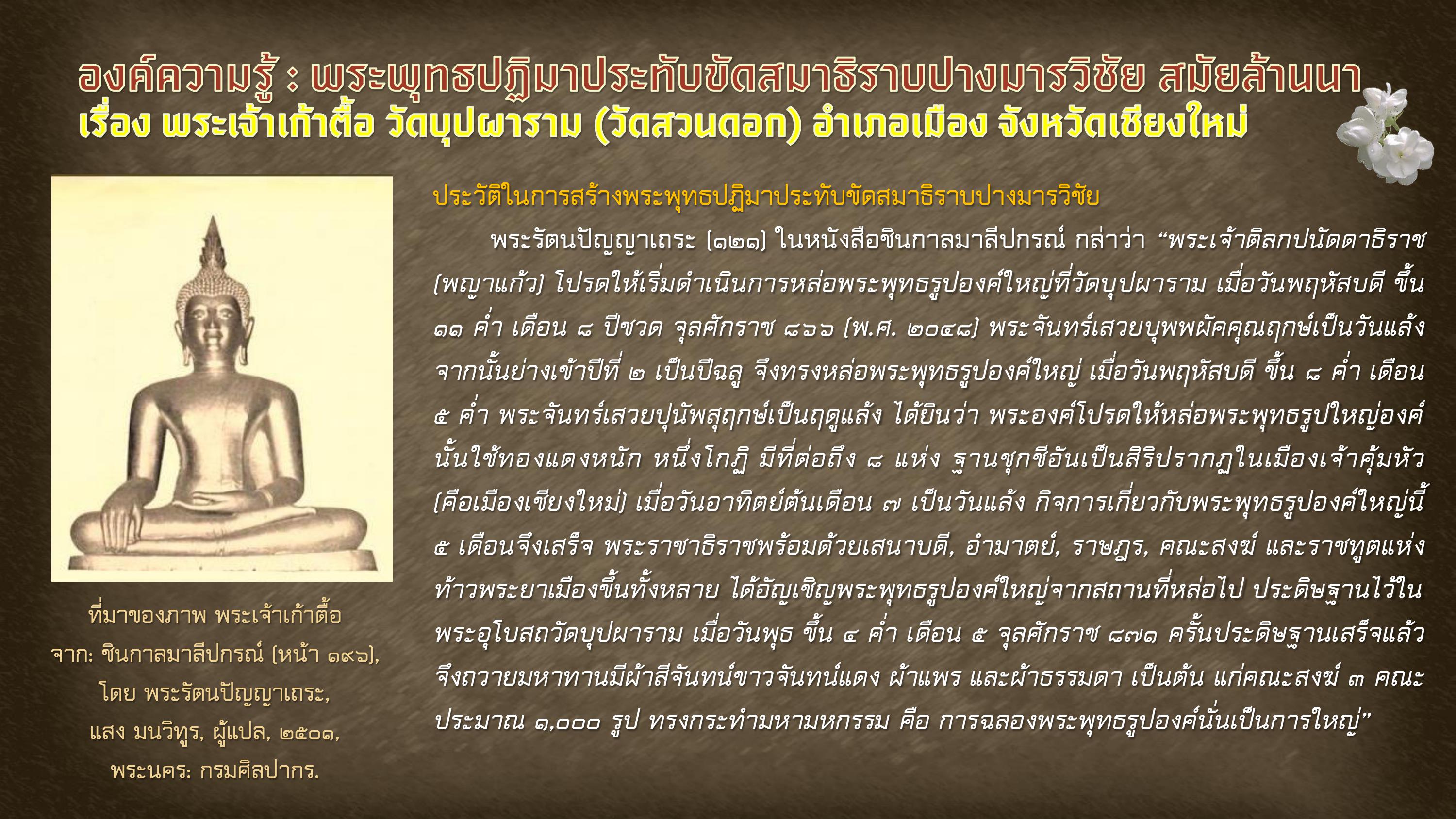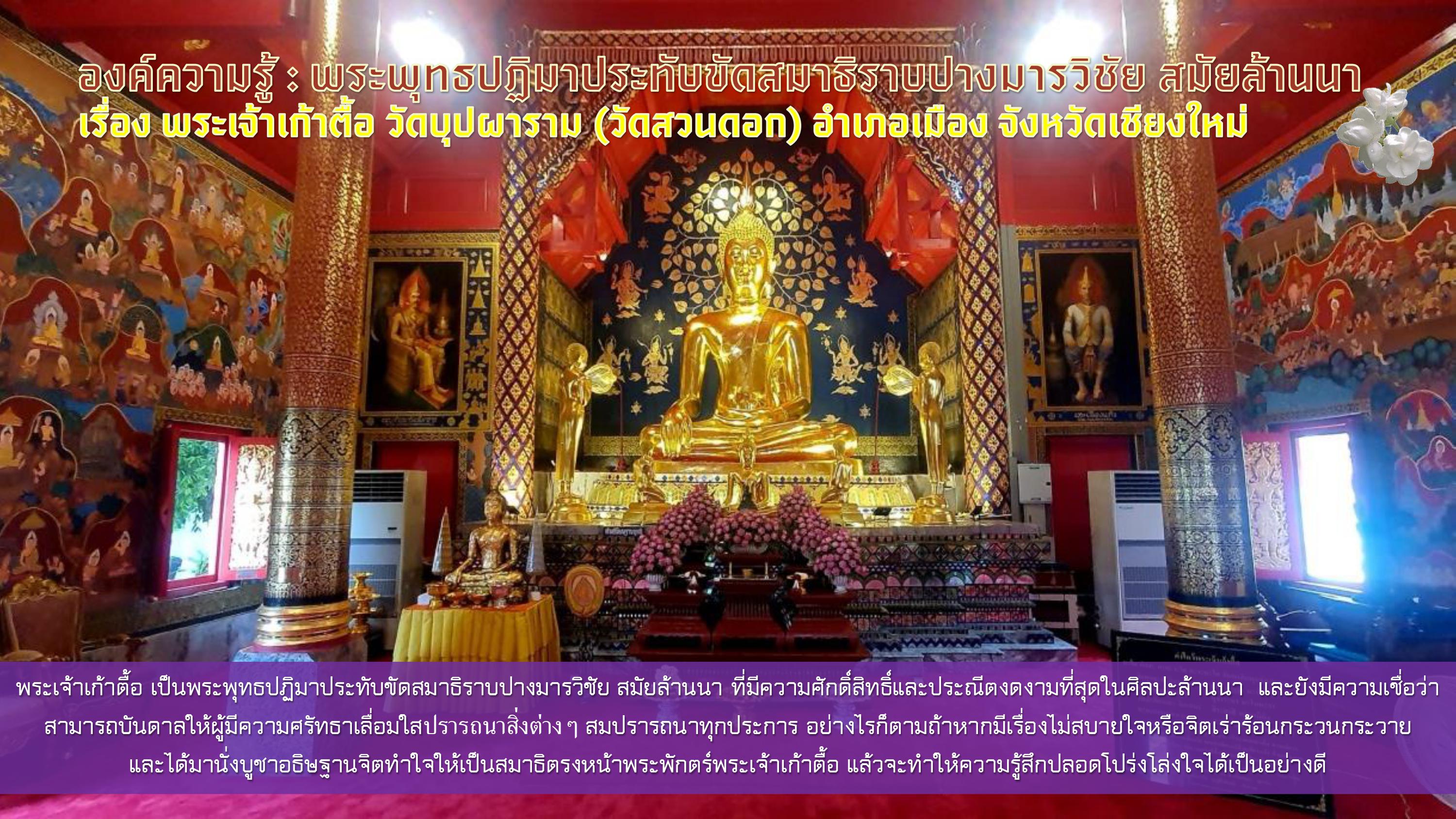 องค์ความรู้ : พระพุทธปฏิมาประทับขัดสมาธิราบปางมารวิชัย สมัยล้านนา เรื่อง พระเจ้าเก้าตื้อ วัดบุปผาราม (วัดสวนดอก) อำเภอเมือง จังหวัดเชียงใหม่
