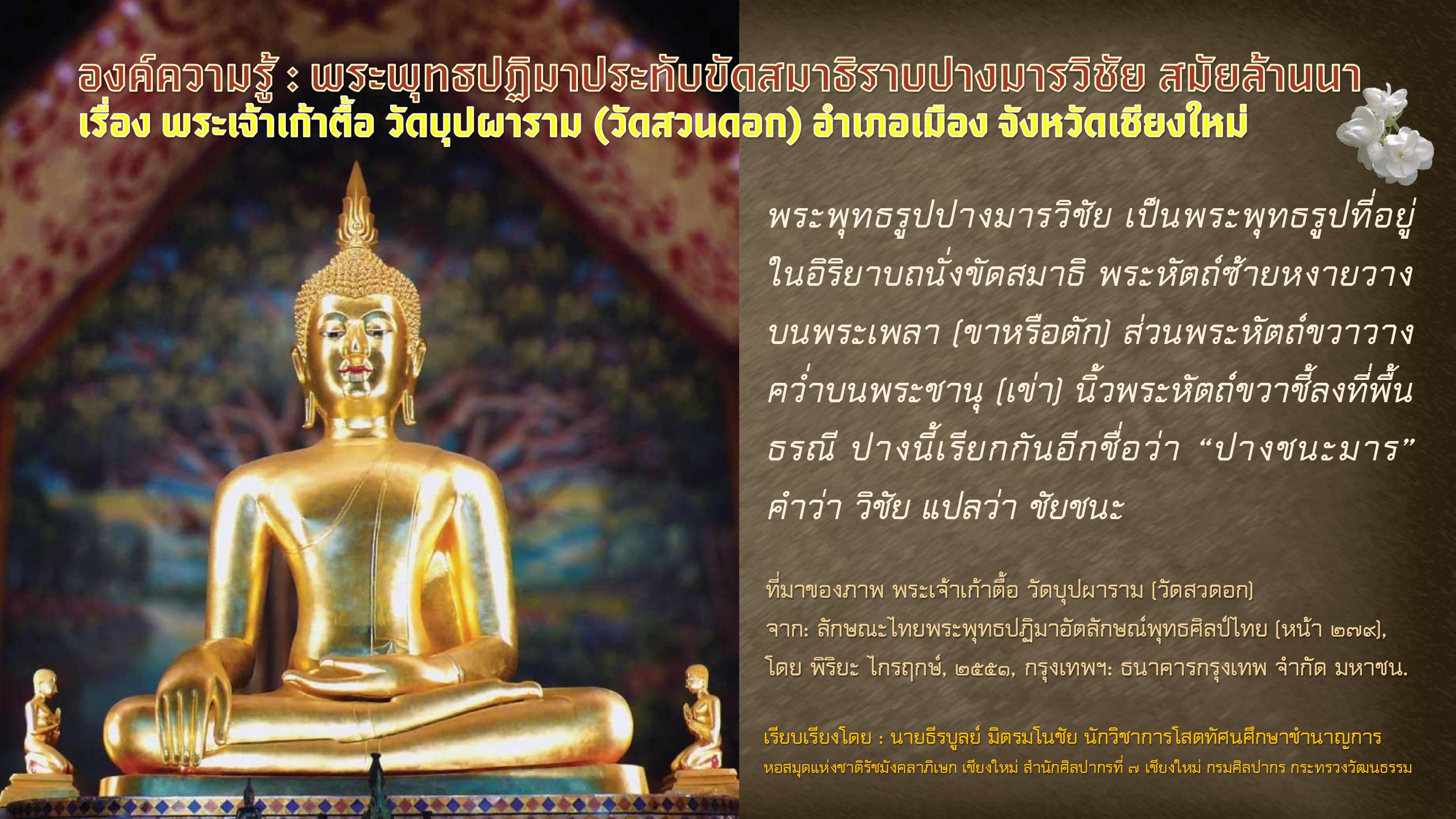 พระพุทธรูปปางมารวิชัย เป็นพระพุทธรูปที่อยู่ในอิริยาบถนั่งขัดสมาธิ พระหัตถ์ซ้ายหงายวางบนพระเพลา (ขาหรือตัก) ส่วนพระหัตถ์ขวาวางคว่ำบนพระชานุ (เข่า) นิ้วพระหัตถ์ขวาชี้ลงที่พื้นธรณี ปางนี้เรียกกันอีกชื่อว่า “ปางชนะมาร” คำว่า วิชัย แปลว่า ชัยชนะ