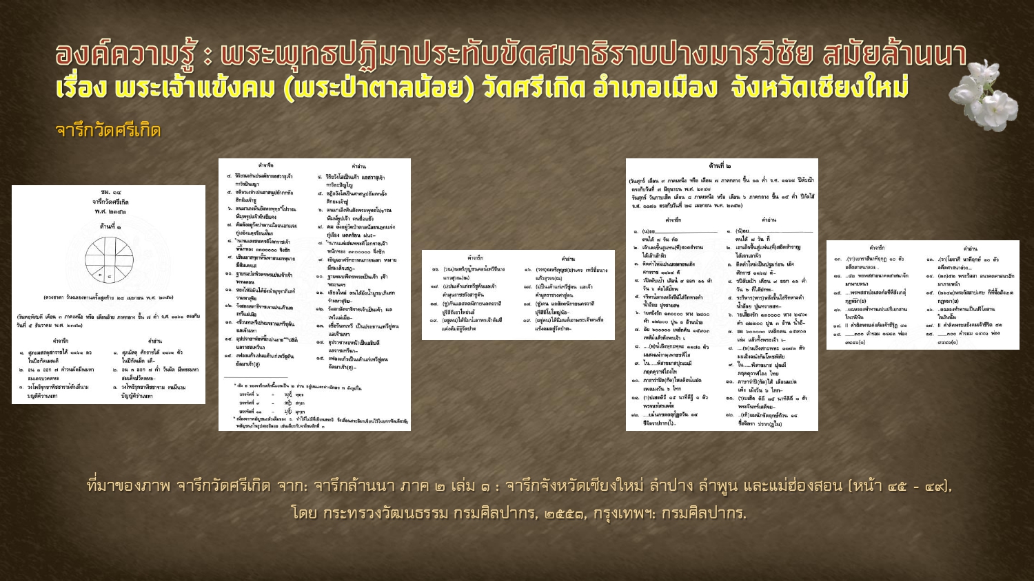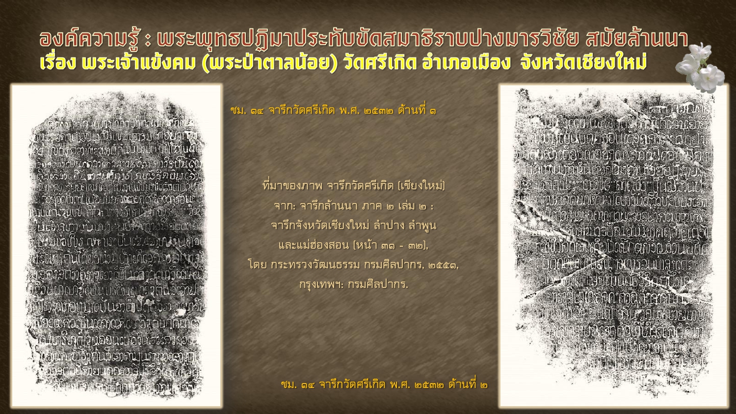 ฐานข้อมูลจารึกแห่งประเทศไทย ศูนย์มานุษยวิทยาสิรินธร (องค์การมหาชน). จารึกวัดศรีเกิด (เชียงใหม่) ด้านที่ ๒. [ออนไลน์]. สืบค้นเมื่อ ๒๗ กรกฎาคม ๒๕๖๗,