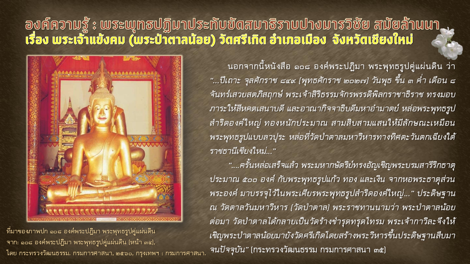 กระทรวงวัฒนธรรม. กรมการศาสนา. ๑๐๘ องค์พระปฏิมา พระพุทธรูปคู่แผ่นดิน. กรุงเทพฯ: กรมการศาสนา, ๒๕๖๐.