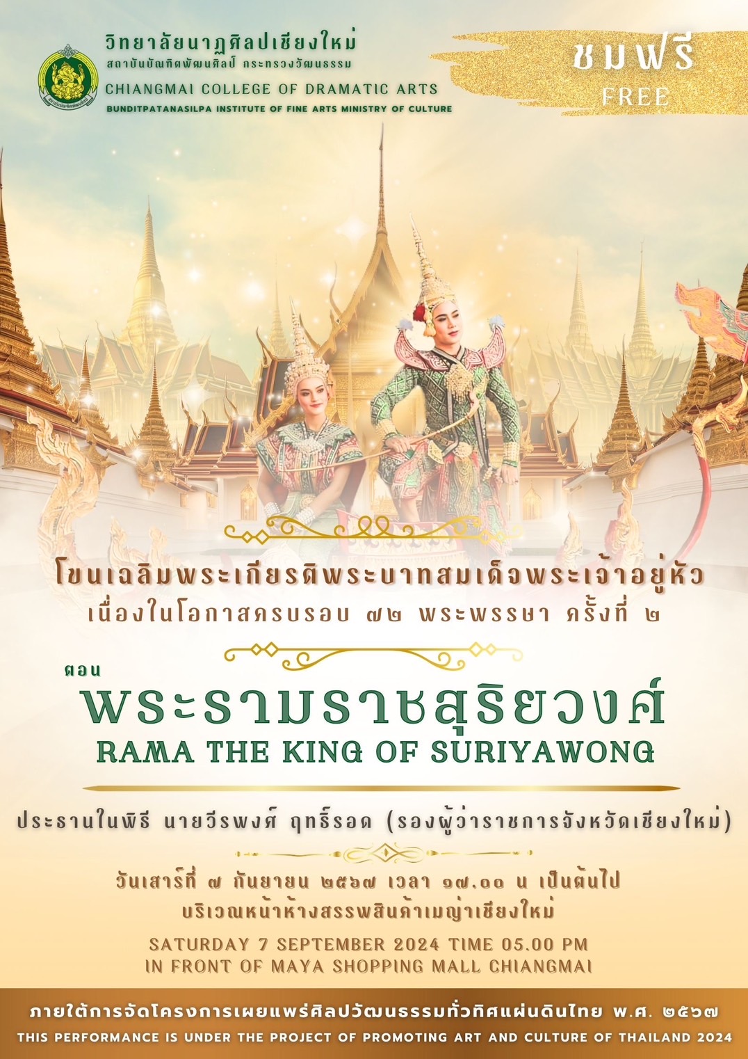 วิทยาลัยนาฏศิลปเชียงใหม่ สถาบันบัณฑิตพัฒนศิลป์ กระทรวงวัฒนธรรม ขอเชิญชวนประชาชนผู้สนใจทุกท่านร่วมชมการแสดงโขนเรื่อง "รามเกียรติ์" ตอน "พระรามราชสุริยวงศ์" อันทรงคุณค่านี้ เพื่อร่วมเฉลิมพระเกียรติและสืบสานศิลปวัฒนธรรมไทย จัดขึ้นภายใต้โครงการเผยแพร่ศิลปวัฒนธรรมทั่วทิศแผ่นดินไทย พ.ศ. ๒๕๖๗