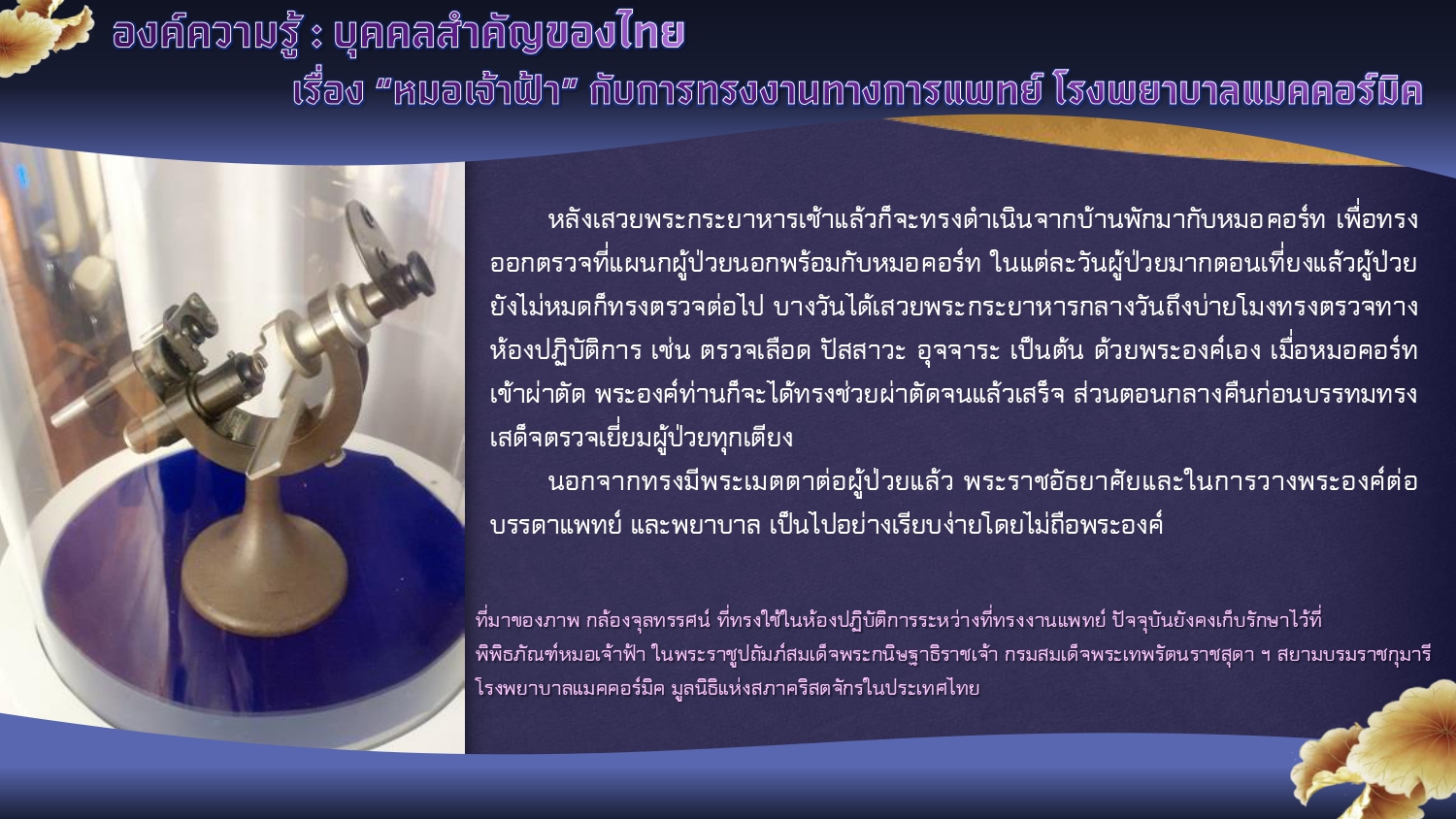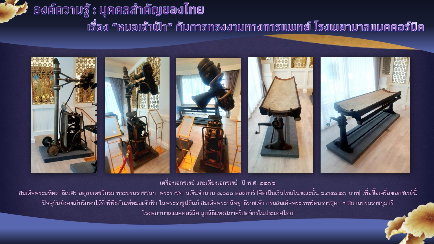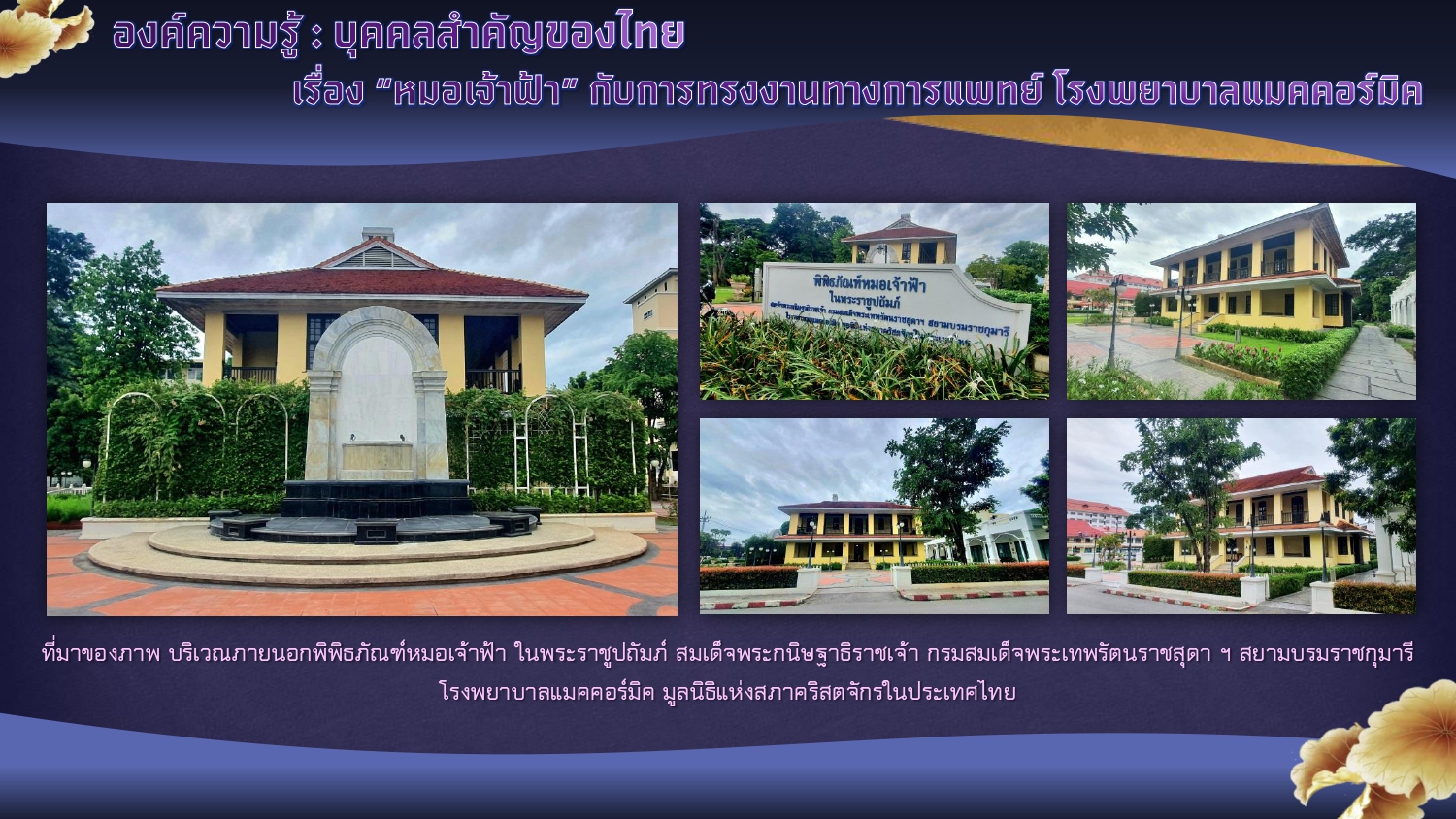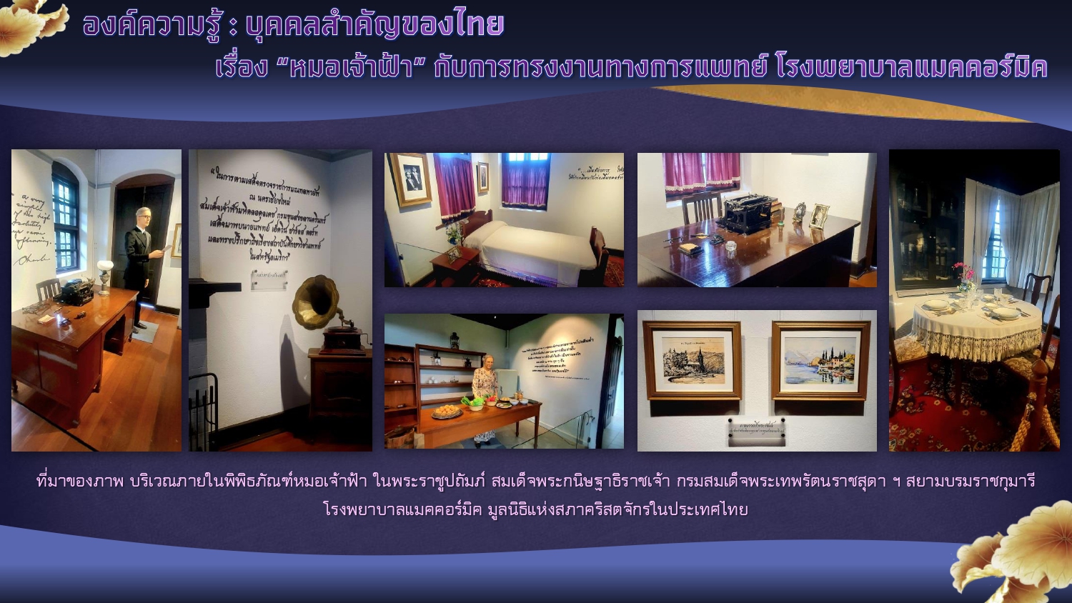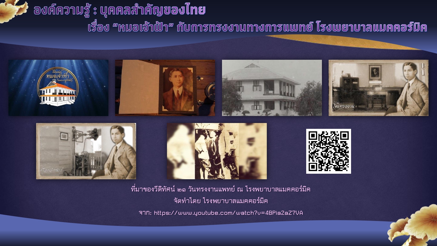 พิพิธภัณฑ์หมอเจ้าฟ้า ในพระราชูปถัมภ์ฯ โรงพยาบาลแมคคอร์มิค จังหวัดเชียงใหม่. [ออนไลน์]. สืบค้นเมื่อ ๑๒ กันยายน ๒๕๖๗,