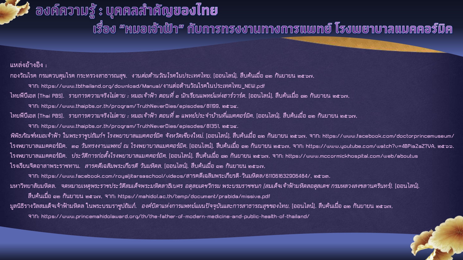 ไทยพีบีเอส (Thai PBS). รายการความจริงไม่ตาย : หมอเจ้าฟ้า ตอนที่ ๒ แพทย์ประจำบ้านที่แมคคอร์มิค. [ออนไลน์]. สืบค้นเมื่อ ๑๒ กันยายน ๒๕๖๗,